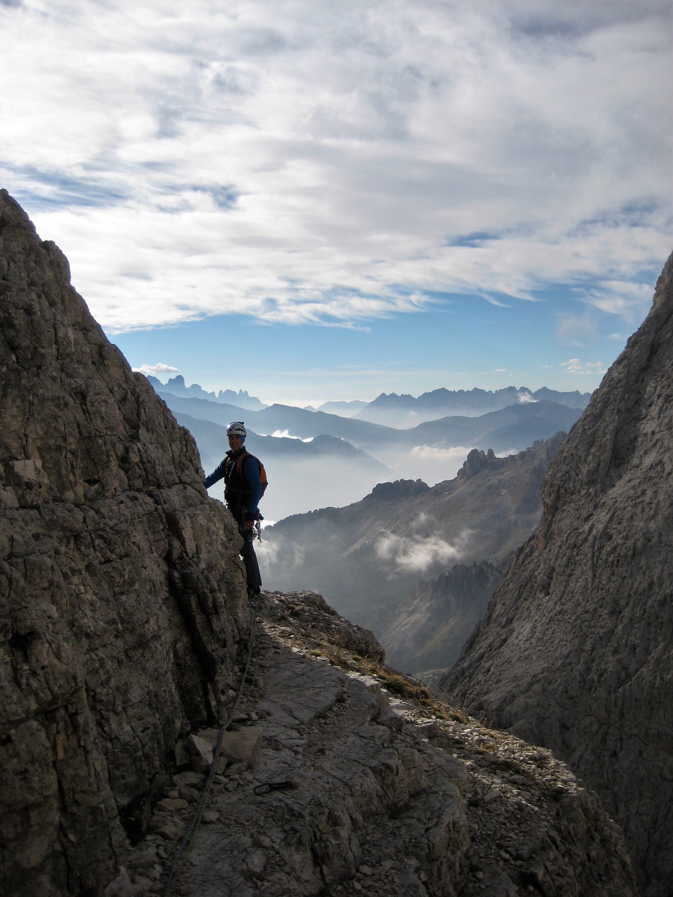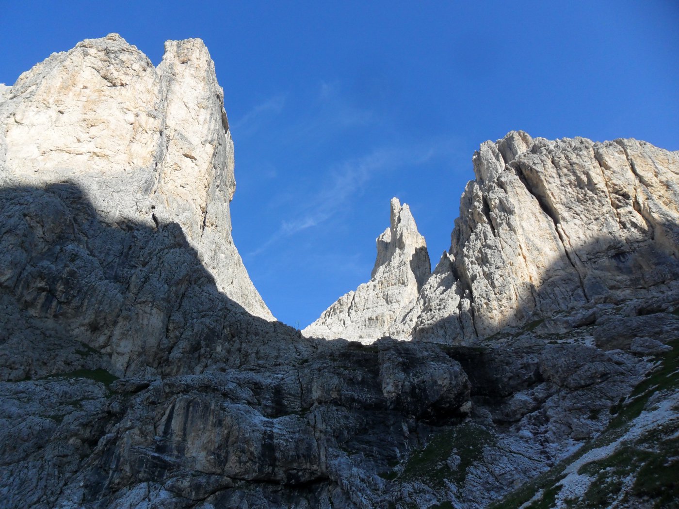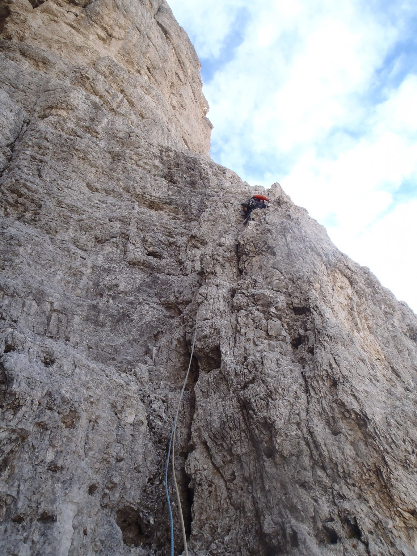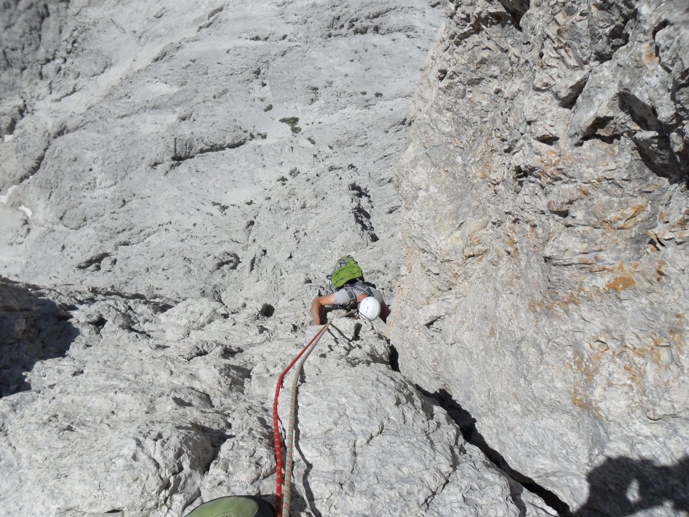 Discesa: indietro a ultima S7. doppia corta 20m, cenge con ometti e disarrampicata versante nord, andando verso la forcella fra stabeler e winkler. serie di calate dalla forcella fino all’attacco.