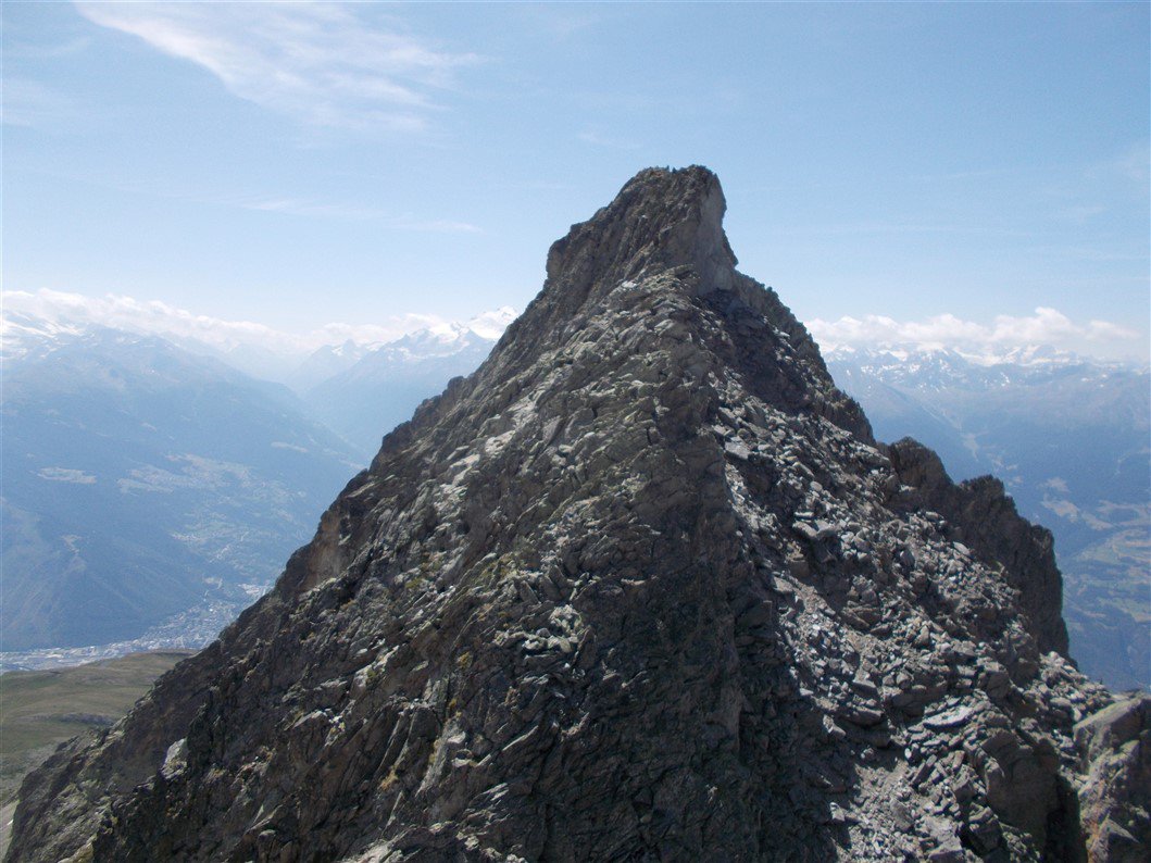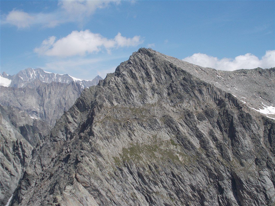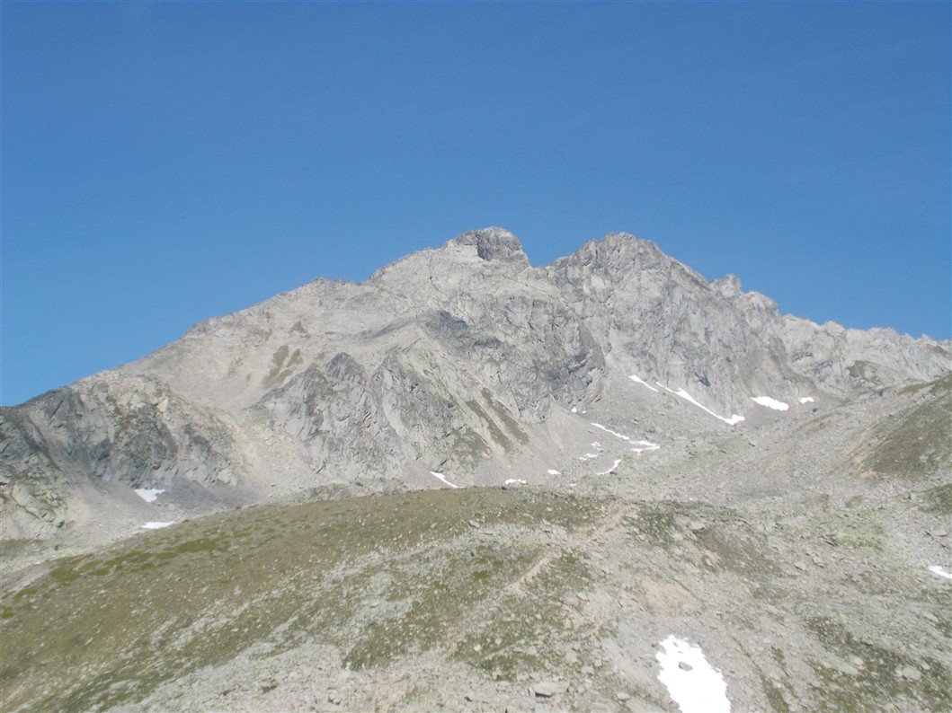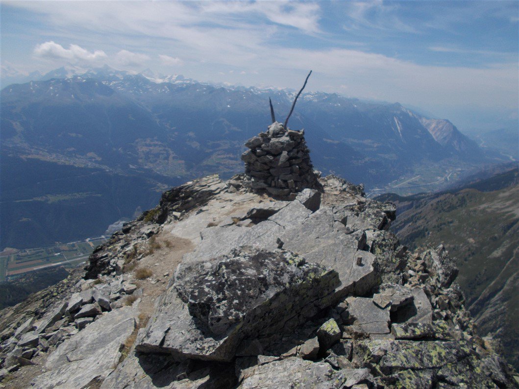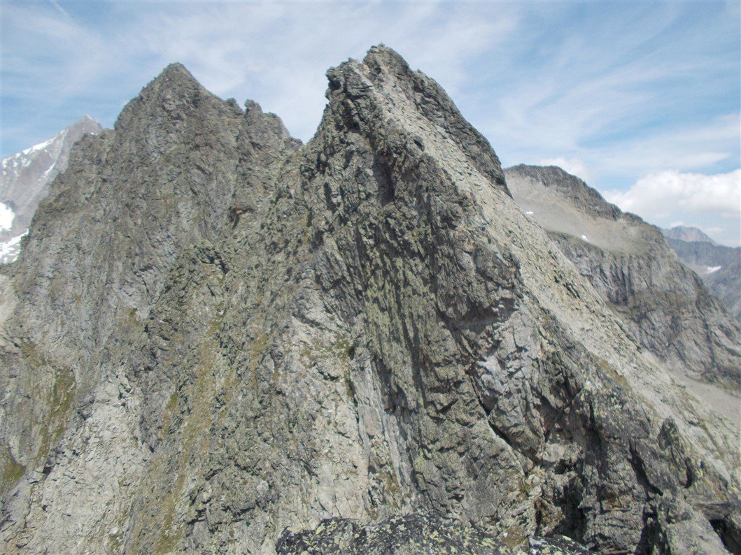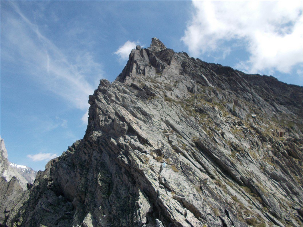 Tornati all’ampia sella, non scendere per la piodata, ma continuare lungo la cresta (max II), non altrettanto ben segnalata, in direzione l’Ougstchummu raggiungendone la punta più elevata (mt2924) in circa 45min.