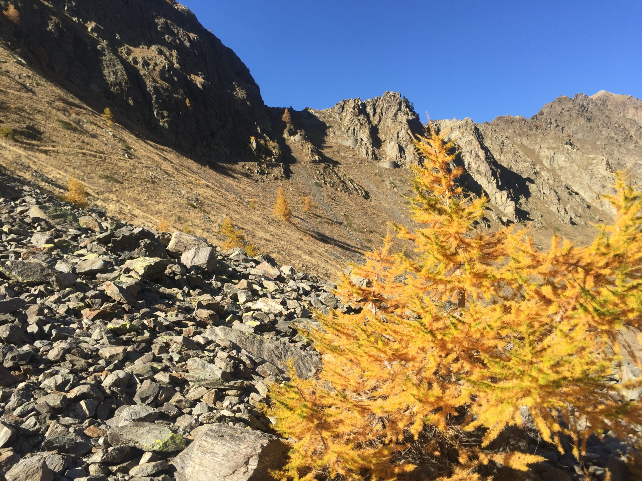 Detto sentiero sale con lunghi tornanti senza mai affaticare per un buon tratto, quando ripiana si è nei pressi della Comba di Schiantalà con il bel laghetto di Laris; poco più avanti si incontra un altro masso con scritta Zanotti, Montagnetta, Rocca Rossa, si abbandona il sentiero con le tacche azzurre che prosegue per il laghetto glaciale della Comba superiore di Schiantalà e il Passo Tres Puncias e si gira a dx per una pietraia seguendo le numerosissime tacche rosse.