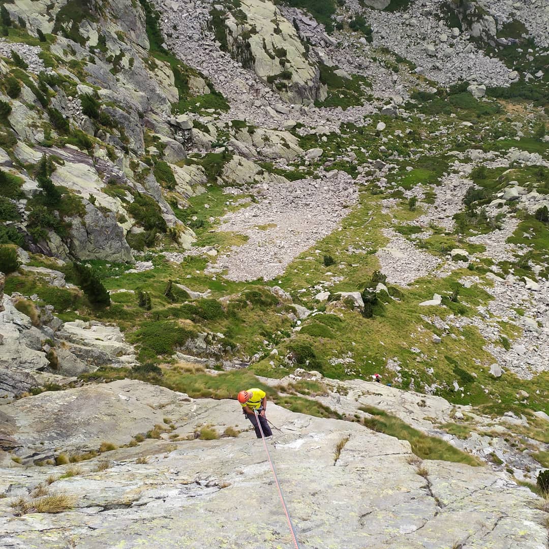 Discesa in doppia lungo la via. È sufficiente una corda singola da 60 mt, le lunghezze non superano mai i 30 mt