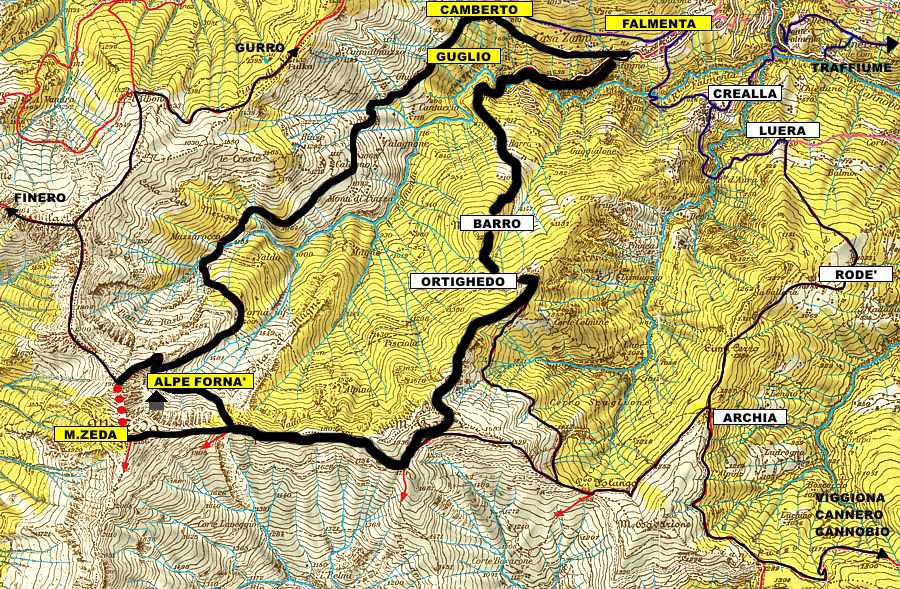 Dall’alpe Fornà ci si dirige verso Est per raggiungere, all’altezza di un caratteristico masso intagliato, una facile cresta che poi si divide in un ramo dx che porta alla Piota e in un ramo sx che è la cresta Nord dello Zeda.