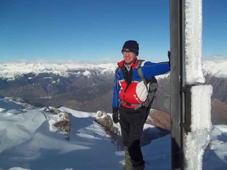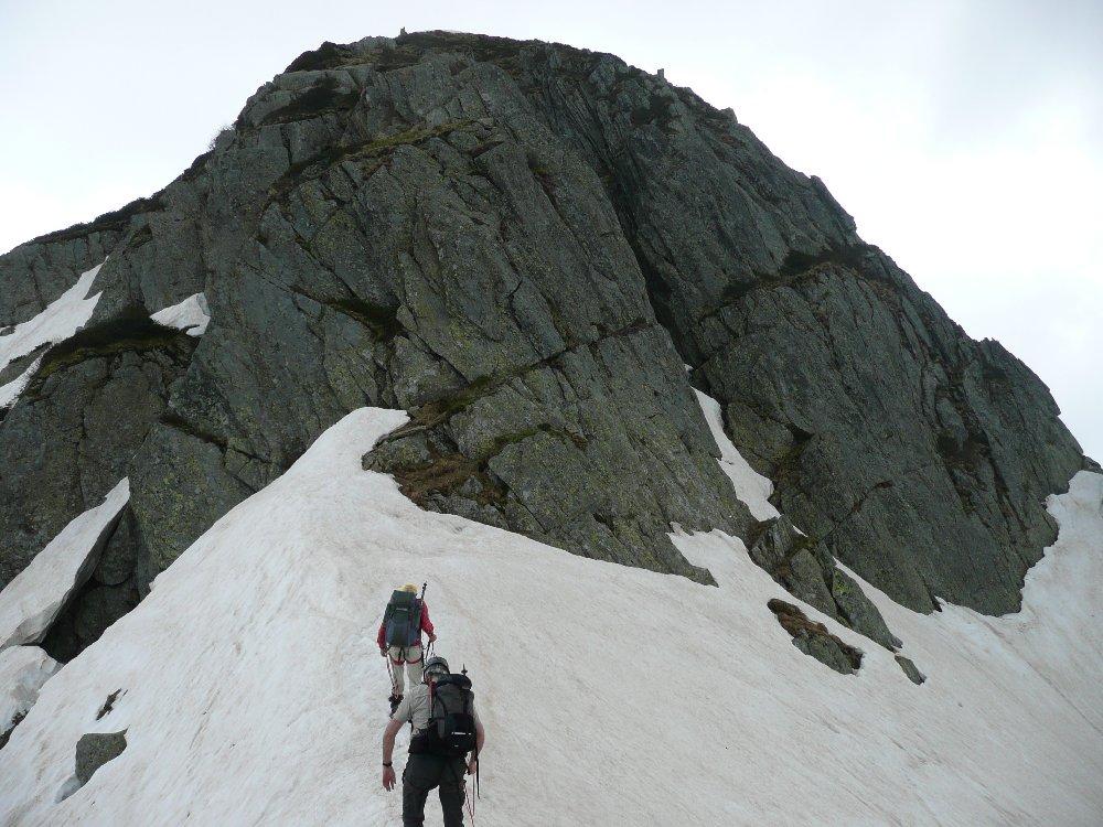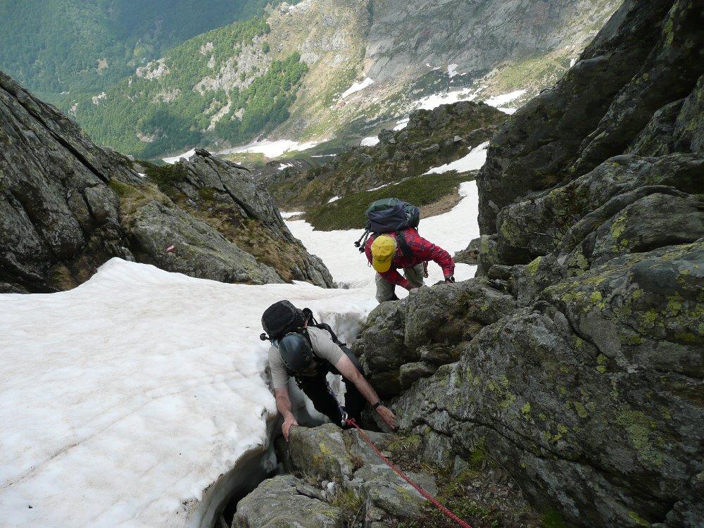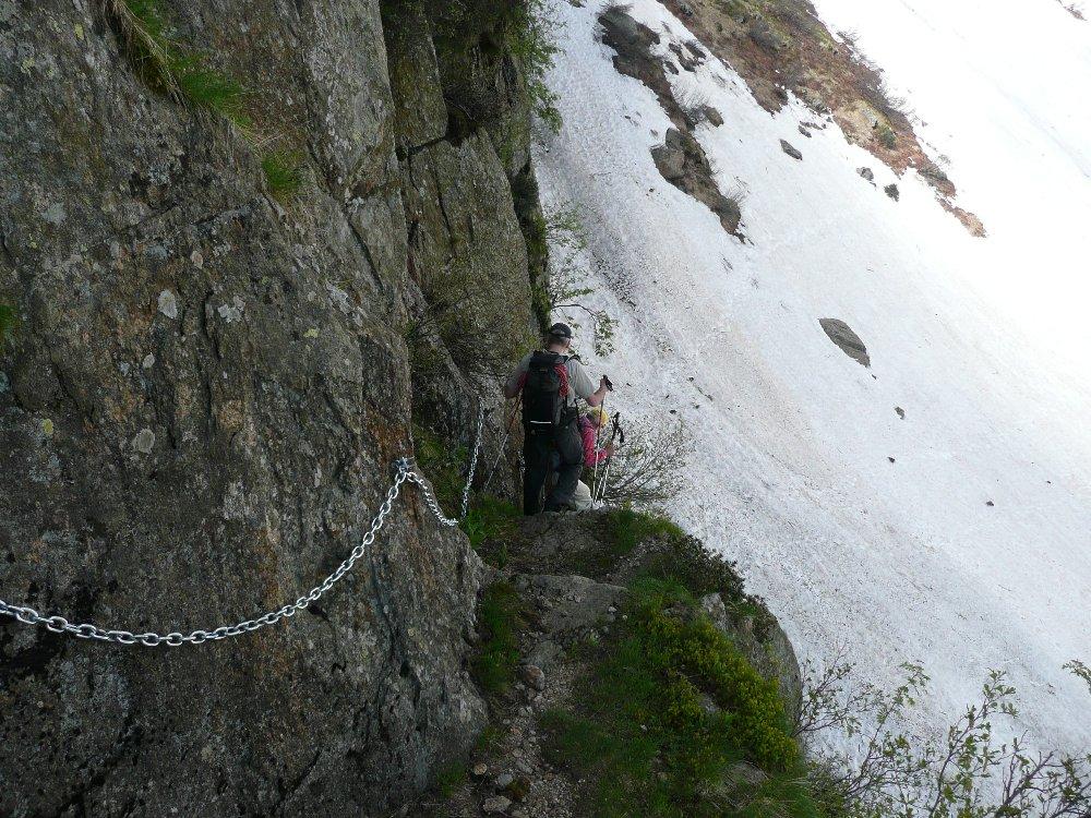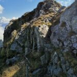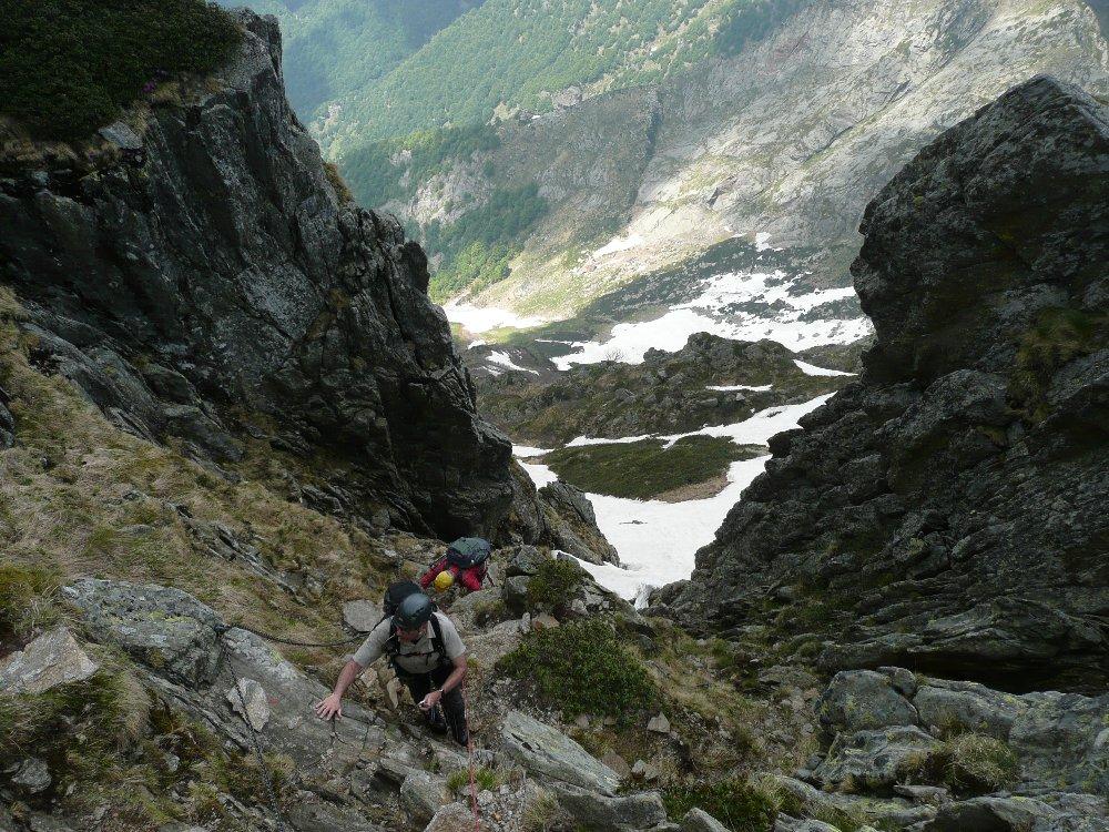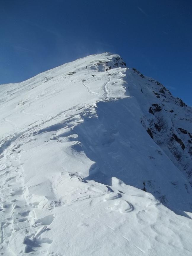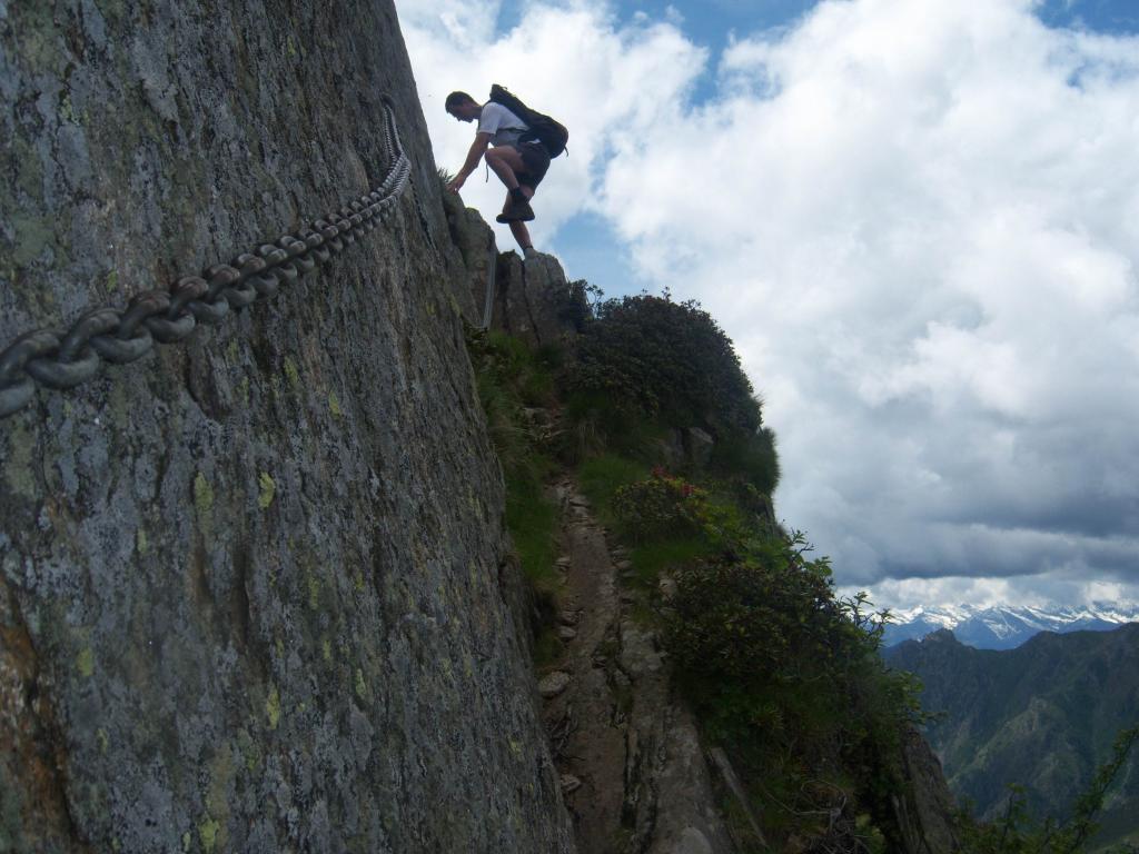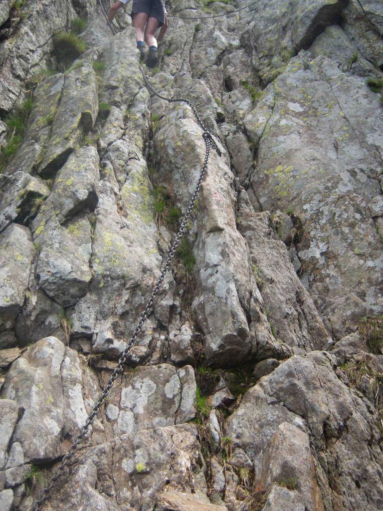 Qui la cresta diviene più impegnativa con alcuni tratti di arrampicata (II) anche esposta. I passaggi più delicati sono comunque resi sicuri dalle catene. La croce di vetta (2156 m) è raggiunta dopo aver superato una piccola cengia molto esposta ed un bel canalino con roccia ben appigliata.
