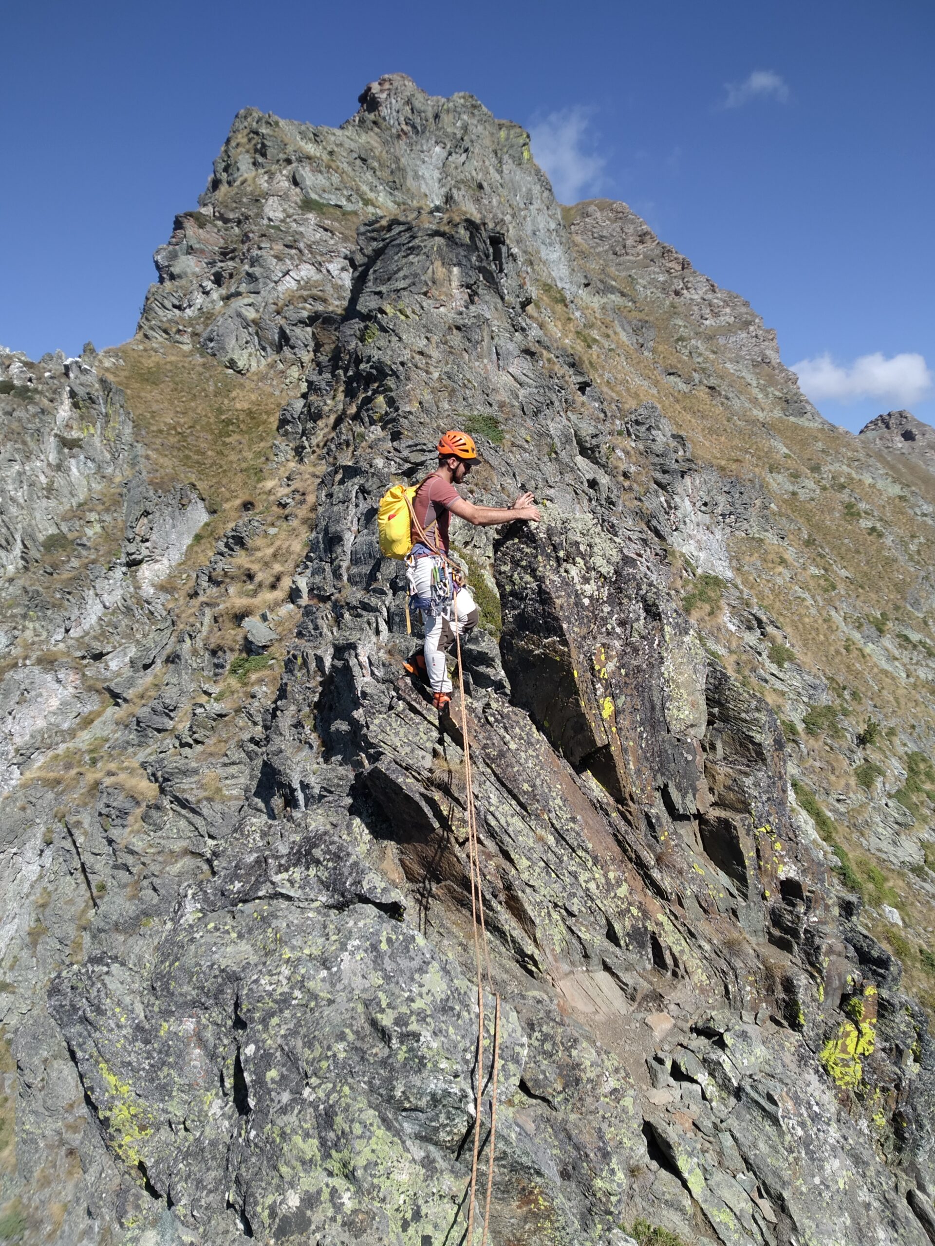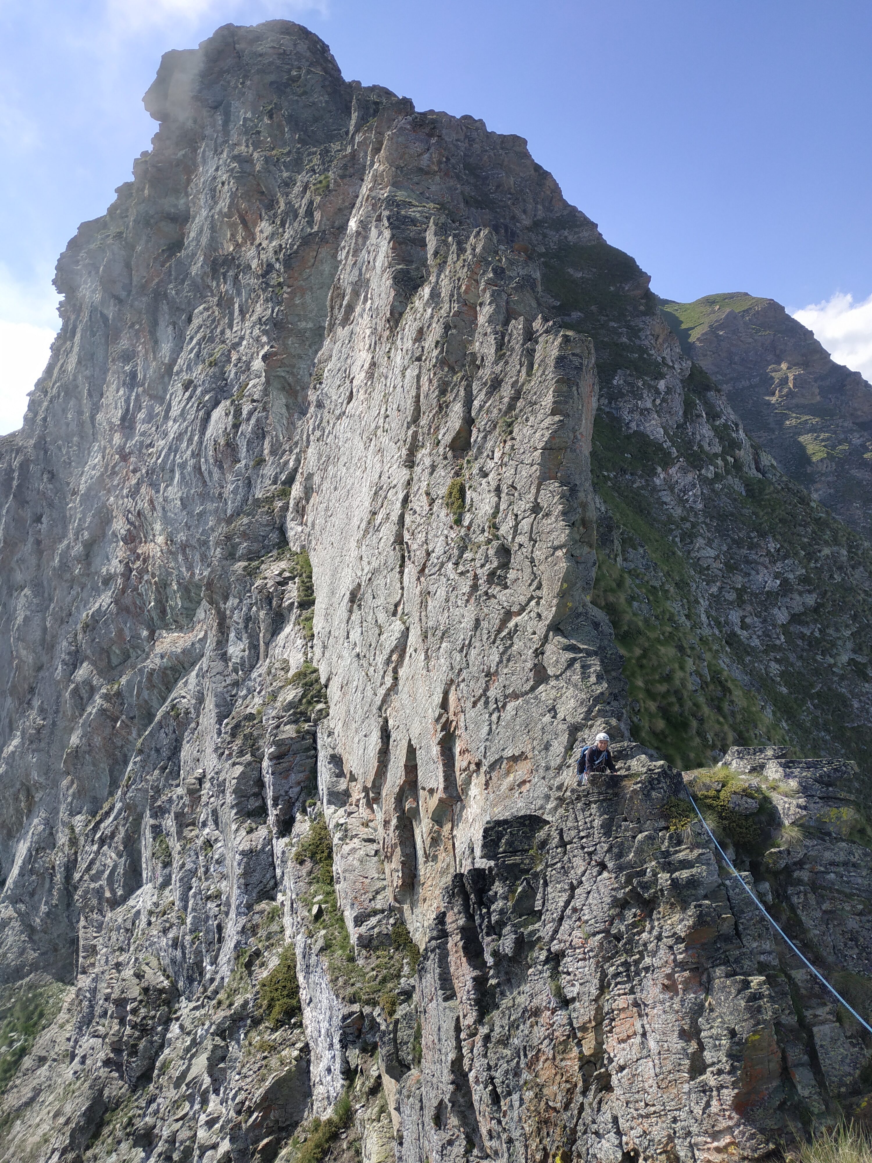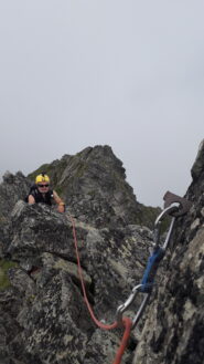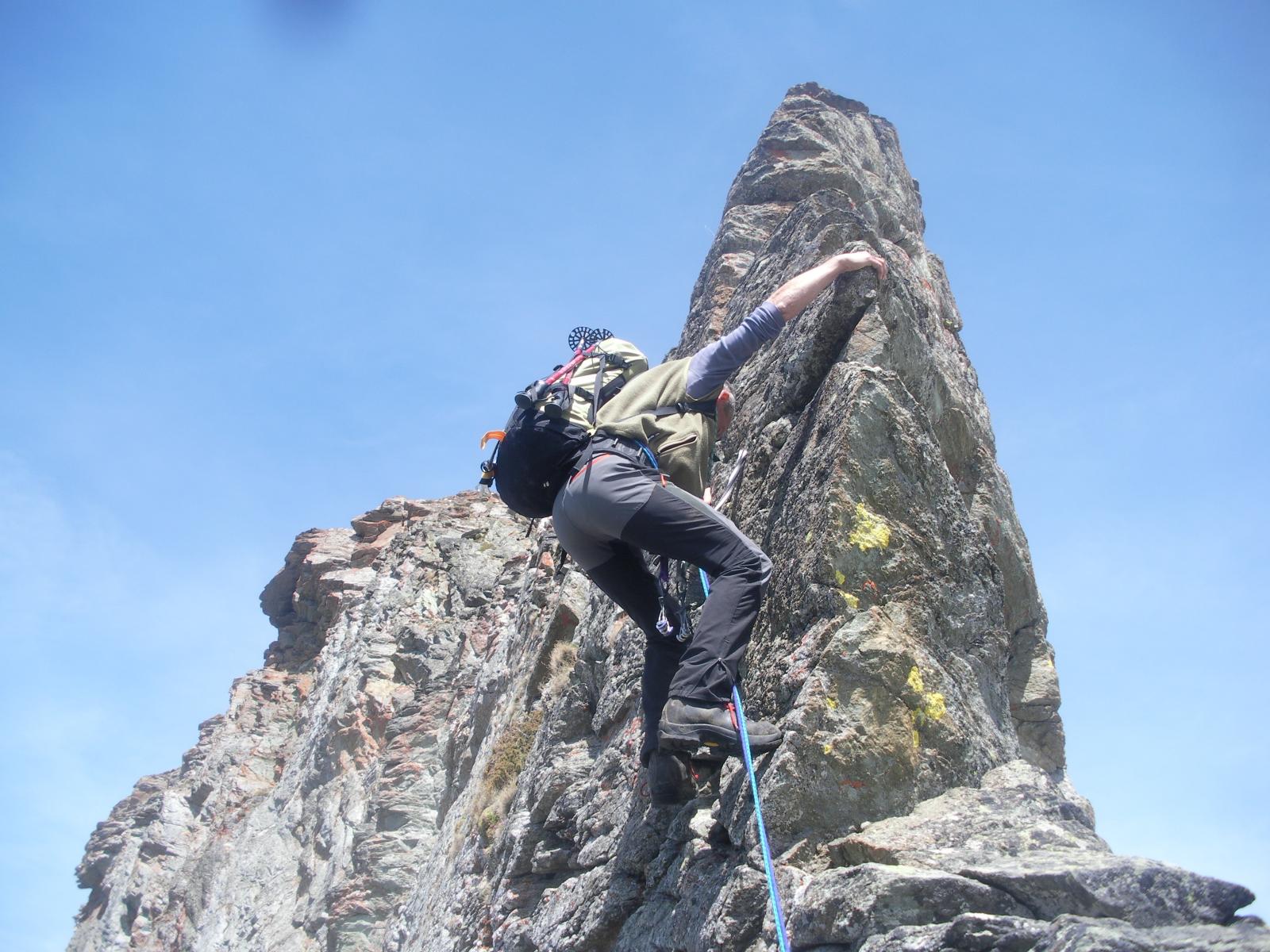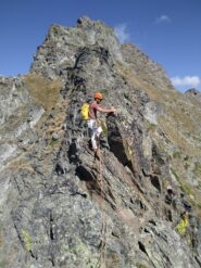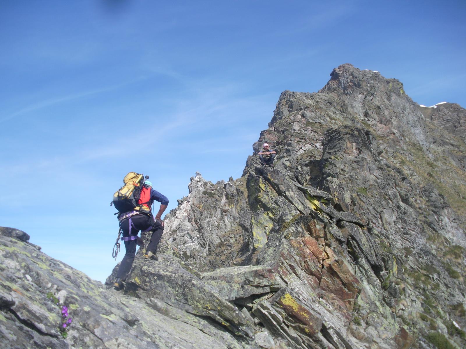 Dal colle inizia subito la cresta da percorrere. Ci si porta sotto le prime roccette e si inizia a risalire senza percorso obbligato cercando però di rimanere il più possibile sul filo di cresta. Si passano i primi salti facili in cui si può procedere in conserva o slegati fin quando iniziano le difficoltà più serie.