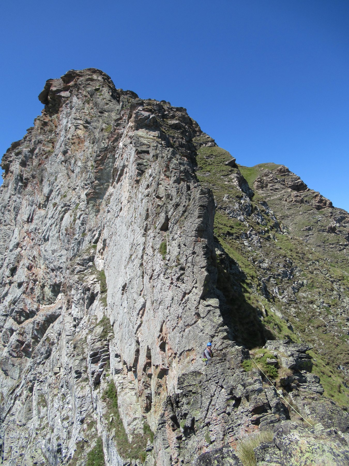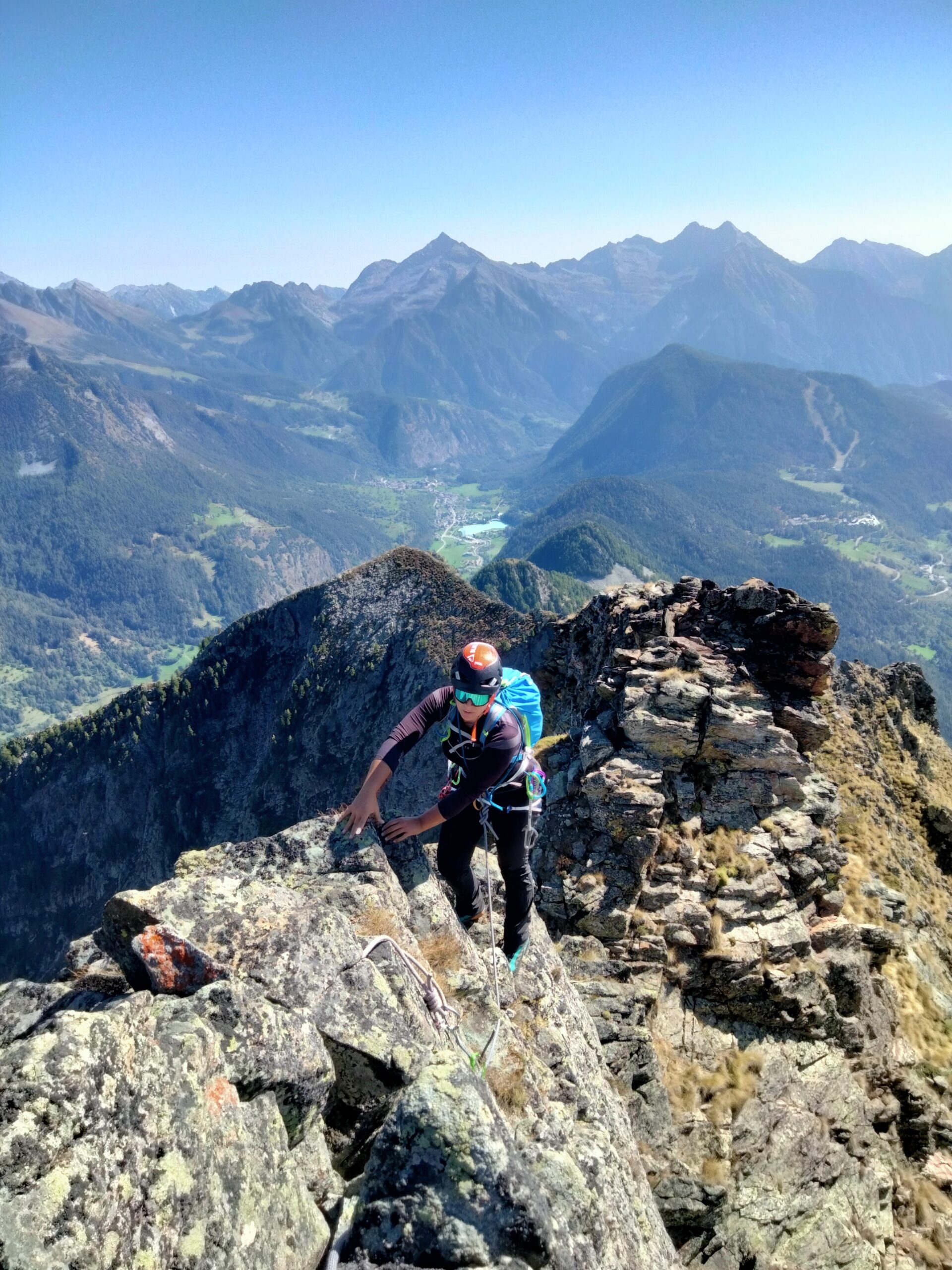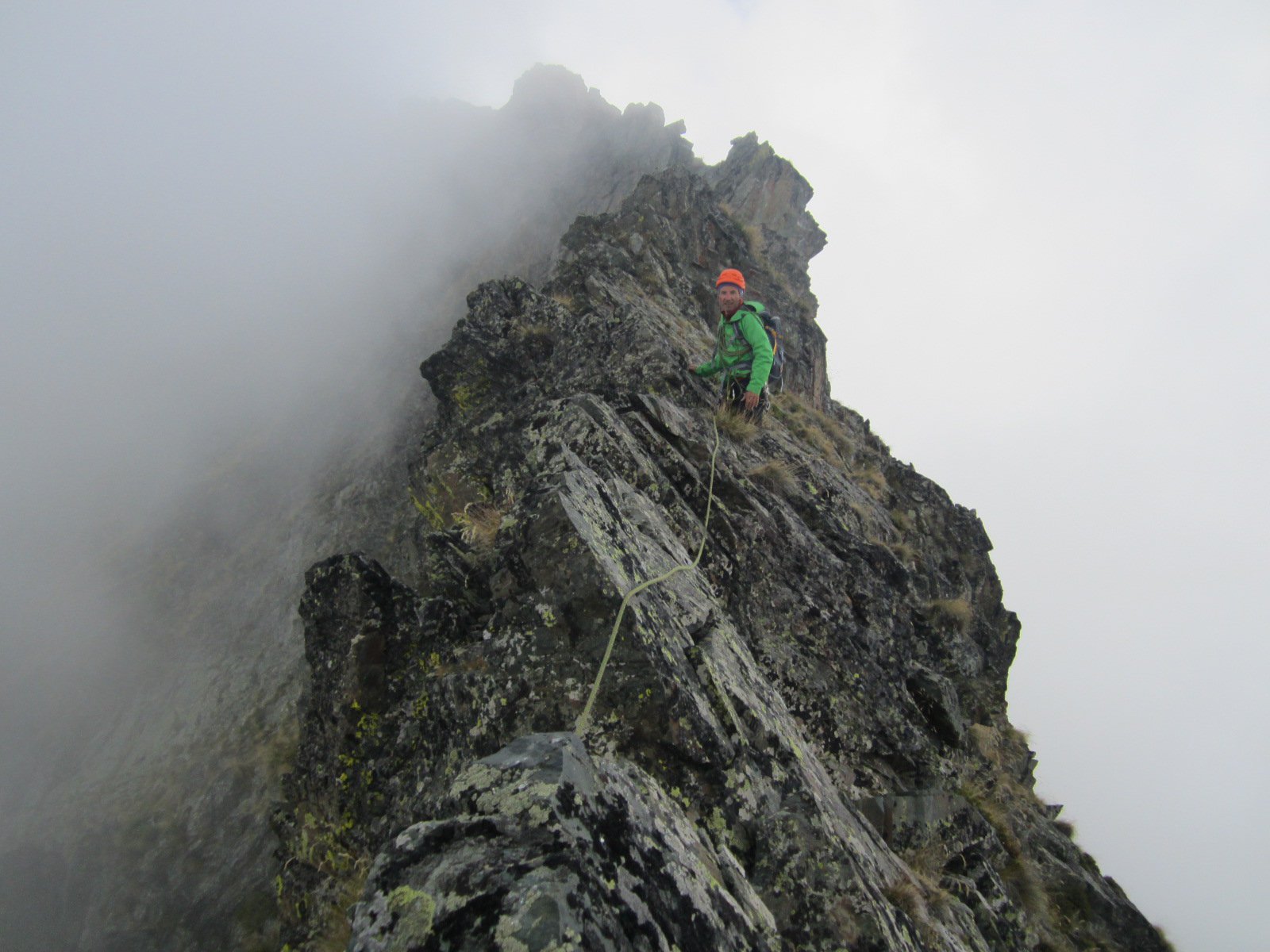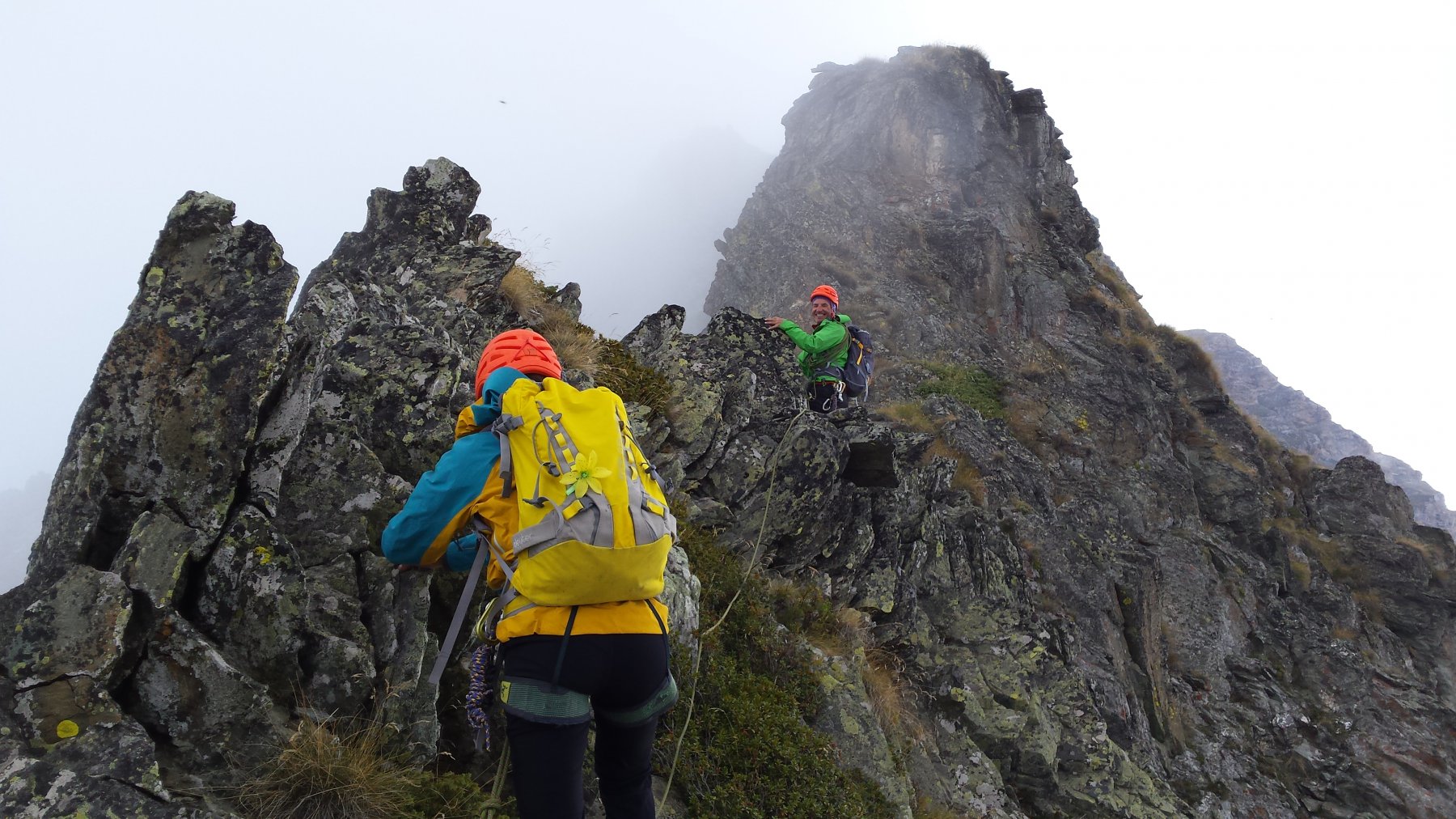 Dal colle inizia subito la cresta da percorrere. Ci si porta sotto le prime roccette e si inizia a risalire senza percorso obbligato cercando però di rimanere il più possibile sul filo di cresta. Si passano i primi salti facili in cui si può procedere in conserva o slegati fin quando iniziano le difficoltà più serie.