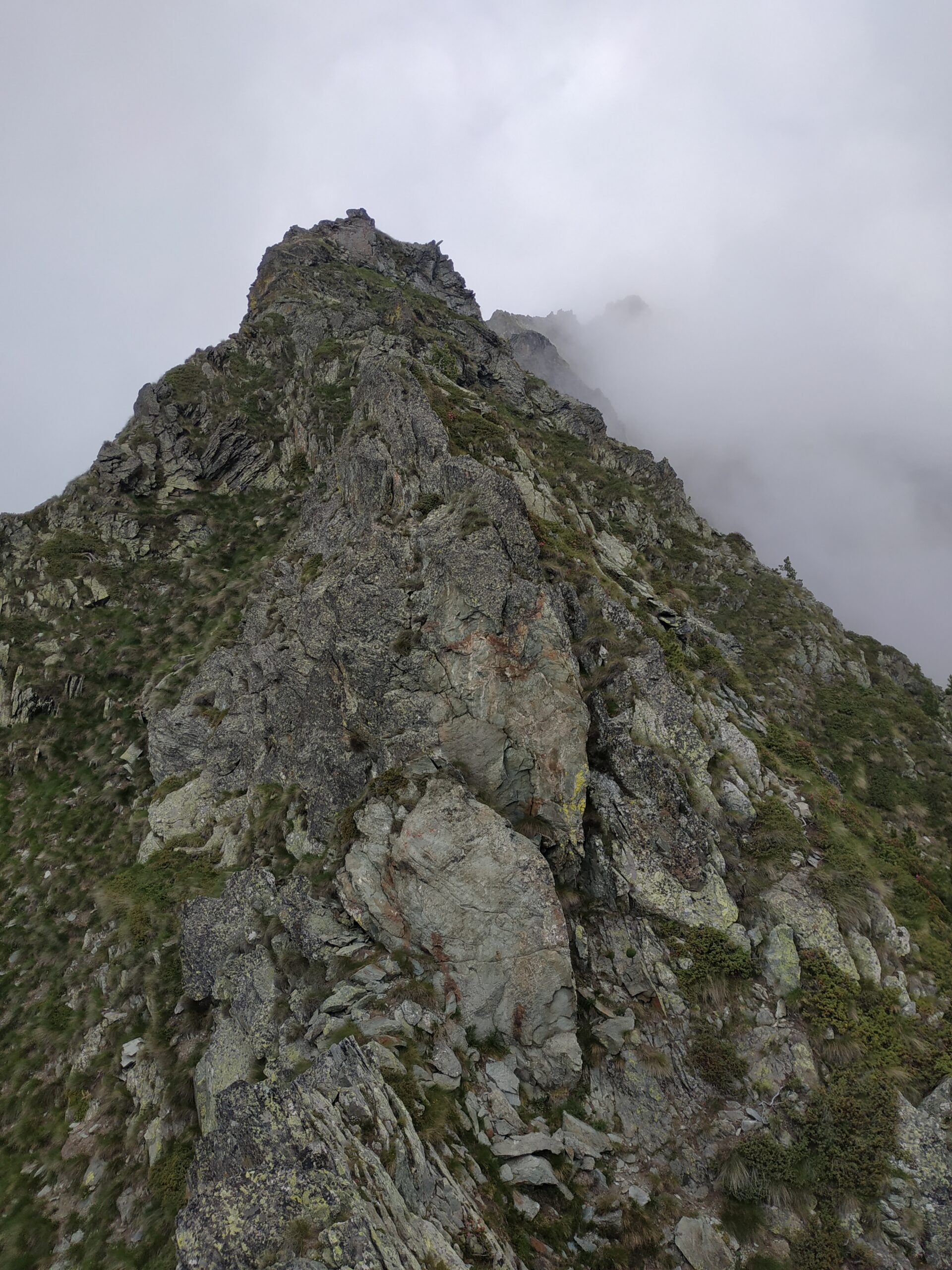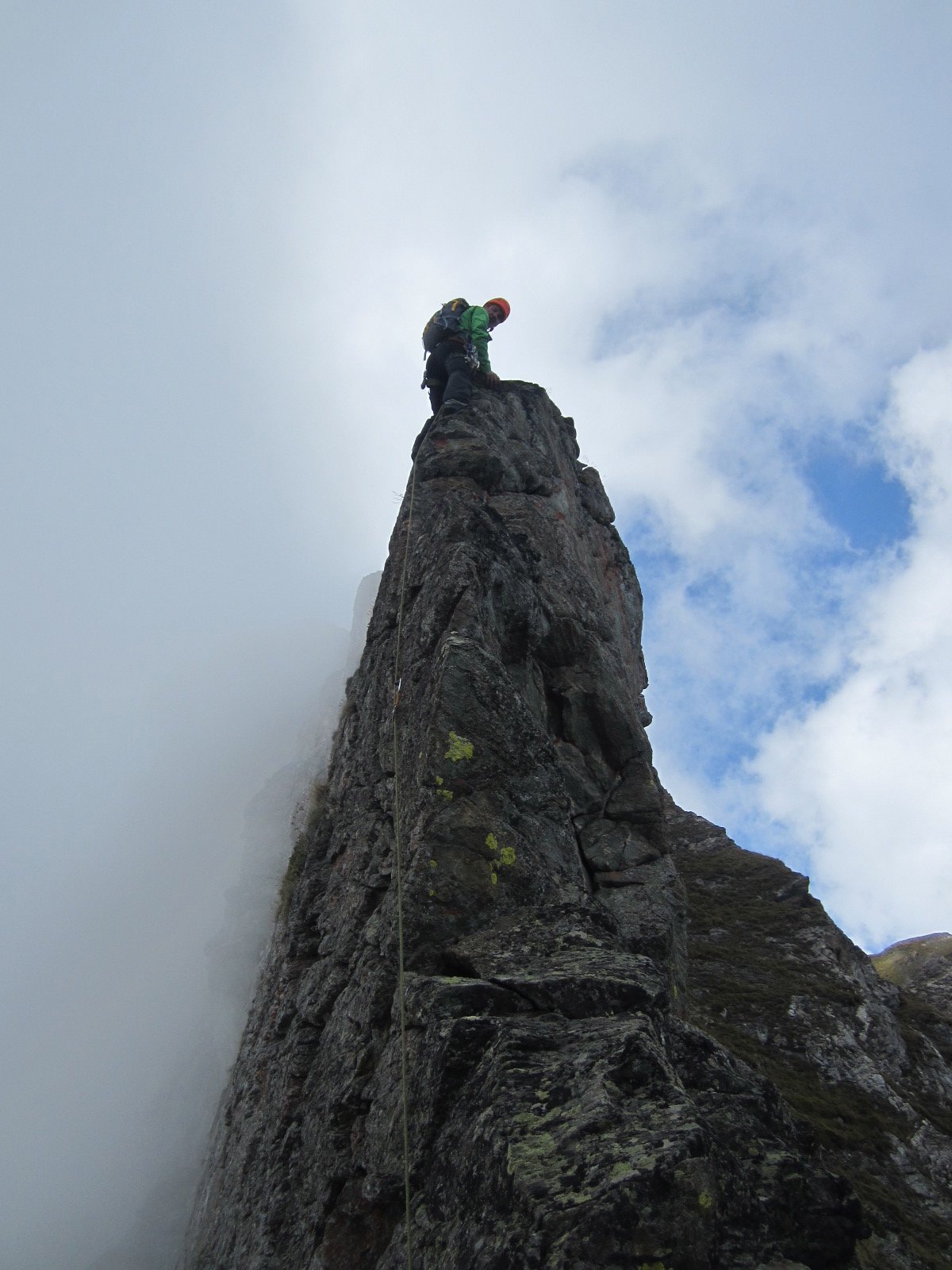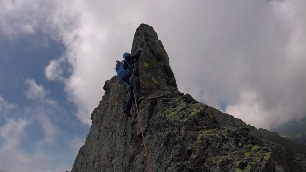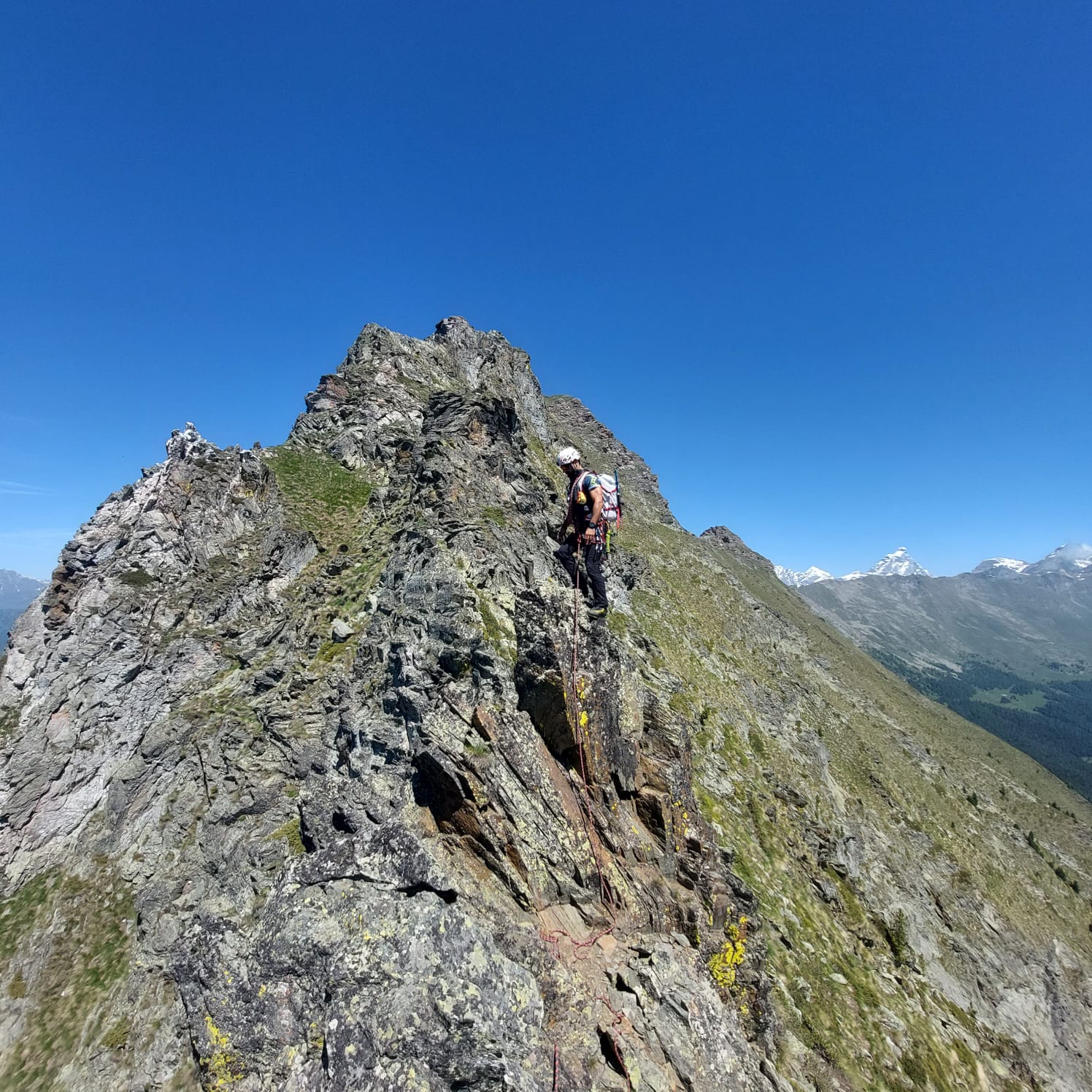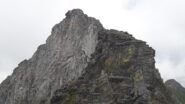 Dal colle inizia subito la cresta da percorrere. Ci si porta sotto le prime roccette e si inizia a risalire senza percorso obbligato cercando però di rimanere il più possibile sul filo di cresta. Si passano i primi salti facili in cui si può procedere in conserva o slegati fin quando iniziano le difficoltà più serie.