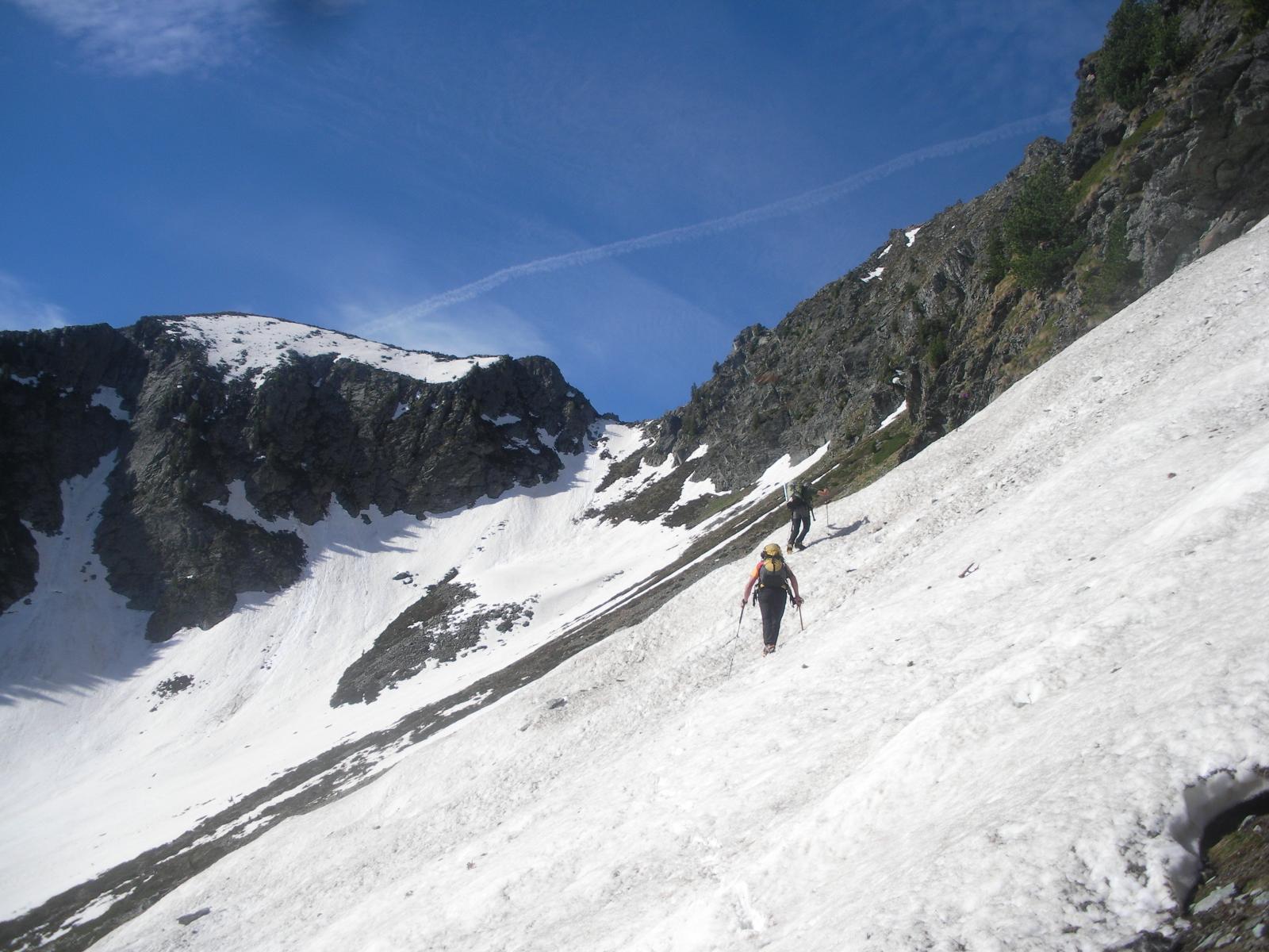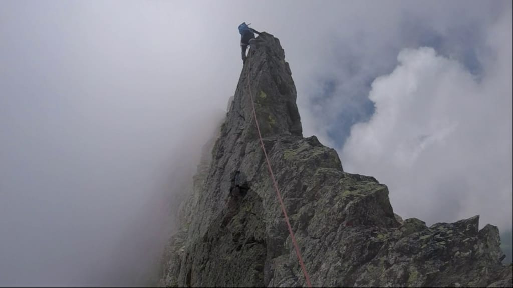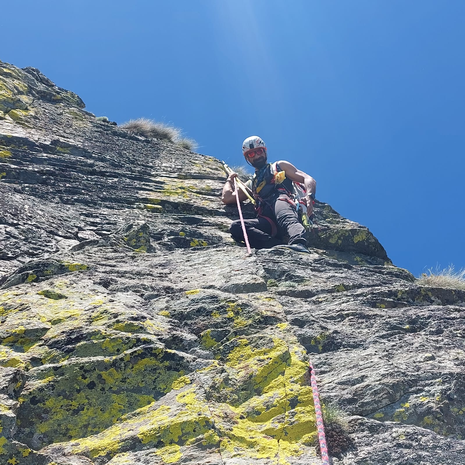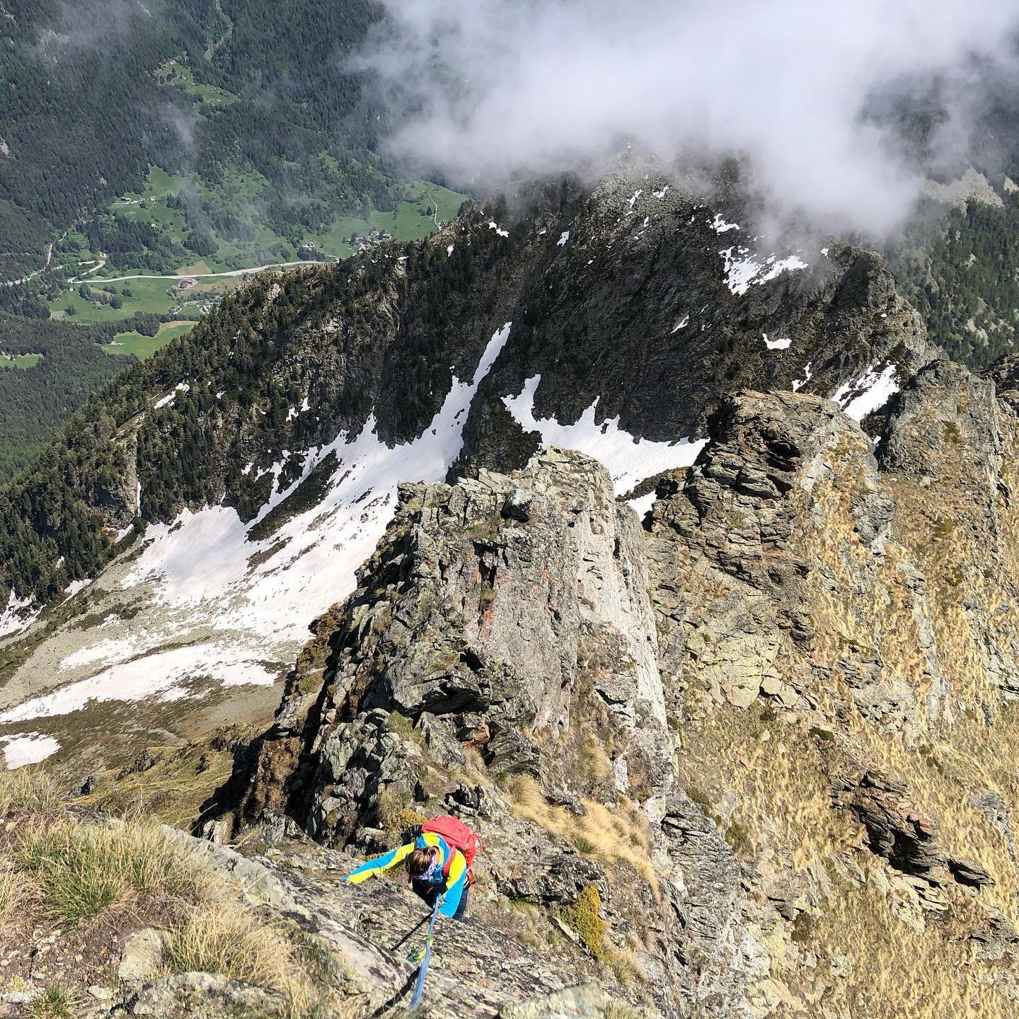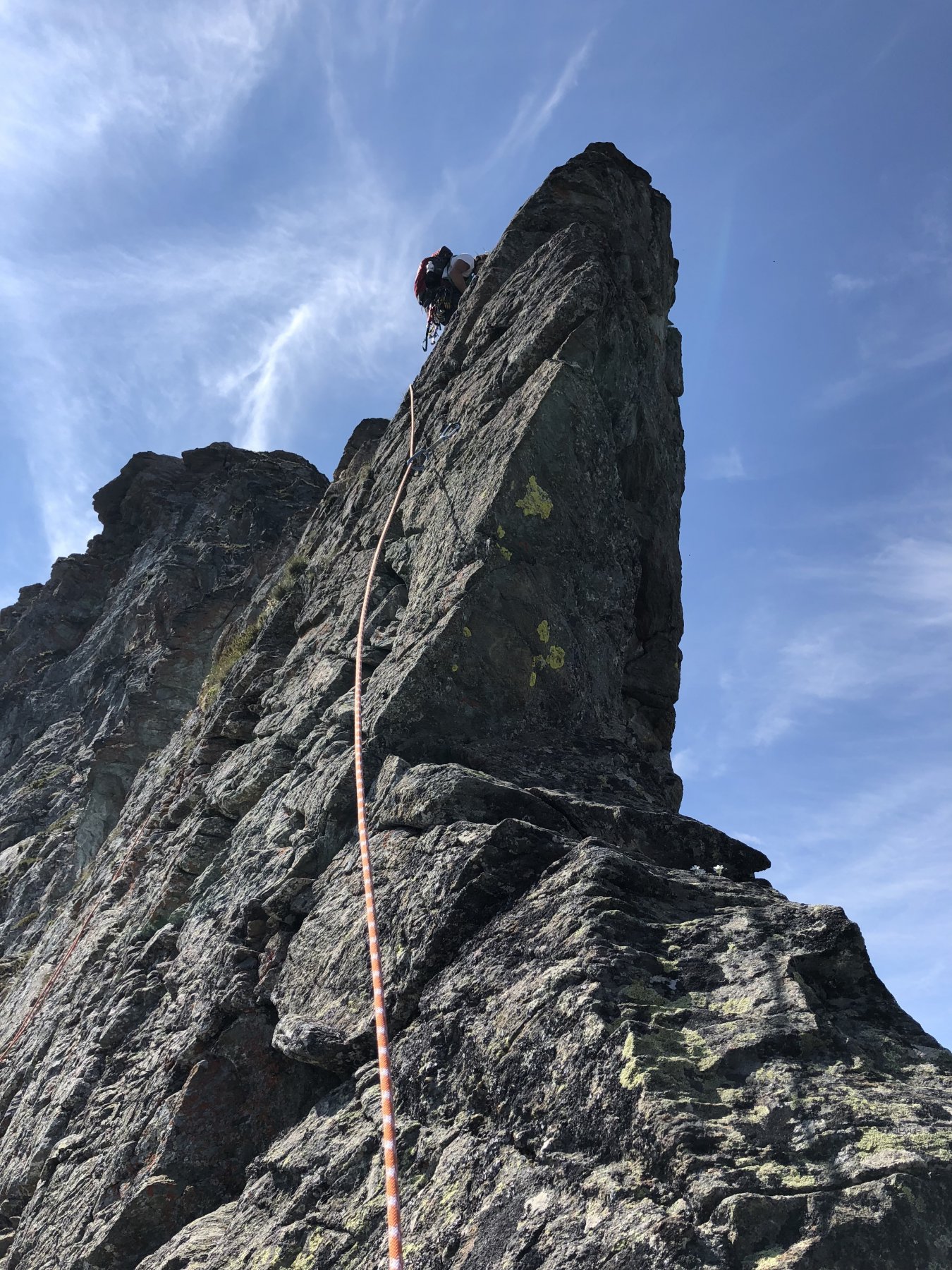 Dal colle inizia subito la cresta da percorrere. Ci si porta sotto le prime roccette e si inizia a risalire senza percorso obbligato cercando però di rimanere il più possibile sul filo di cresta. Si passano i primi salti facili in cui si può procedere in conserva o slegati fin quando iniziano le difficoltà più serie.