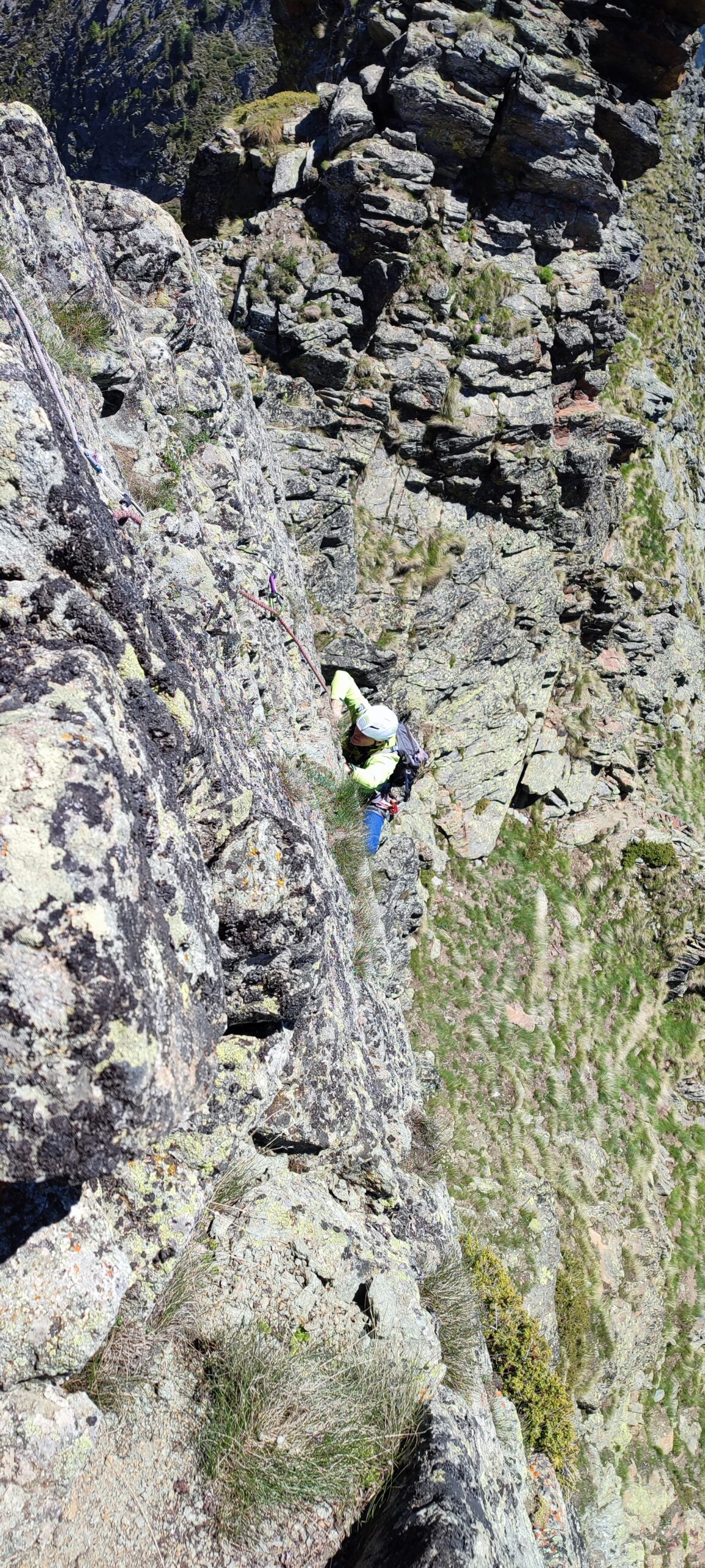 Segue ancora un tratto affilato facile e un ultimo breve muretto che si supera sulla dx o sulla sx (esposto, chiodo alla base, III+).