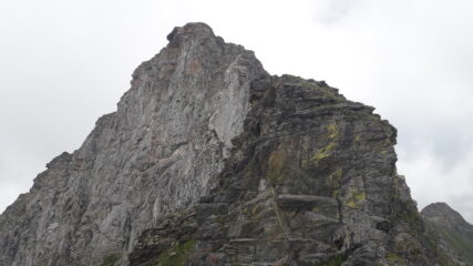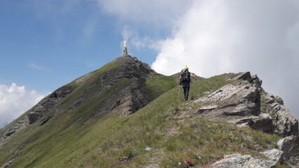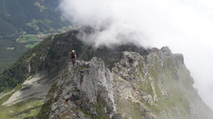Ravanoso all’inverosimile giungere al colletto dove attacca la cresta, da quando terminata la stradina all’altezza dell’aquedotto si sale per una ripida traccia nella vegetazione rigogliosa a costituire serio ostacolo al procedere. La cresta bella nel suo insieme oppone difficolta’ di un certo rilievo che in due tratti del suo lungo sviluppo: la lama e un monolito subito dopo quando ormai poco rimane a uscire dalle difficolta’ definitivamente.
