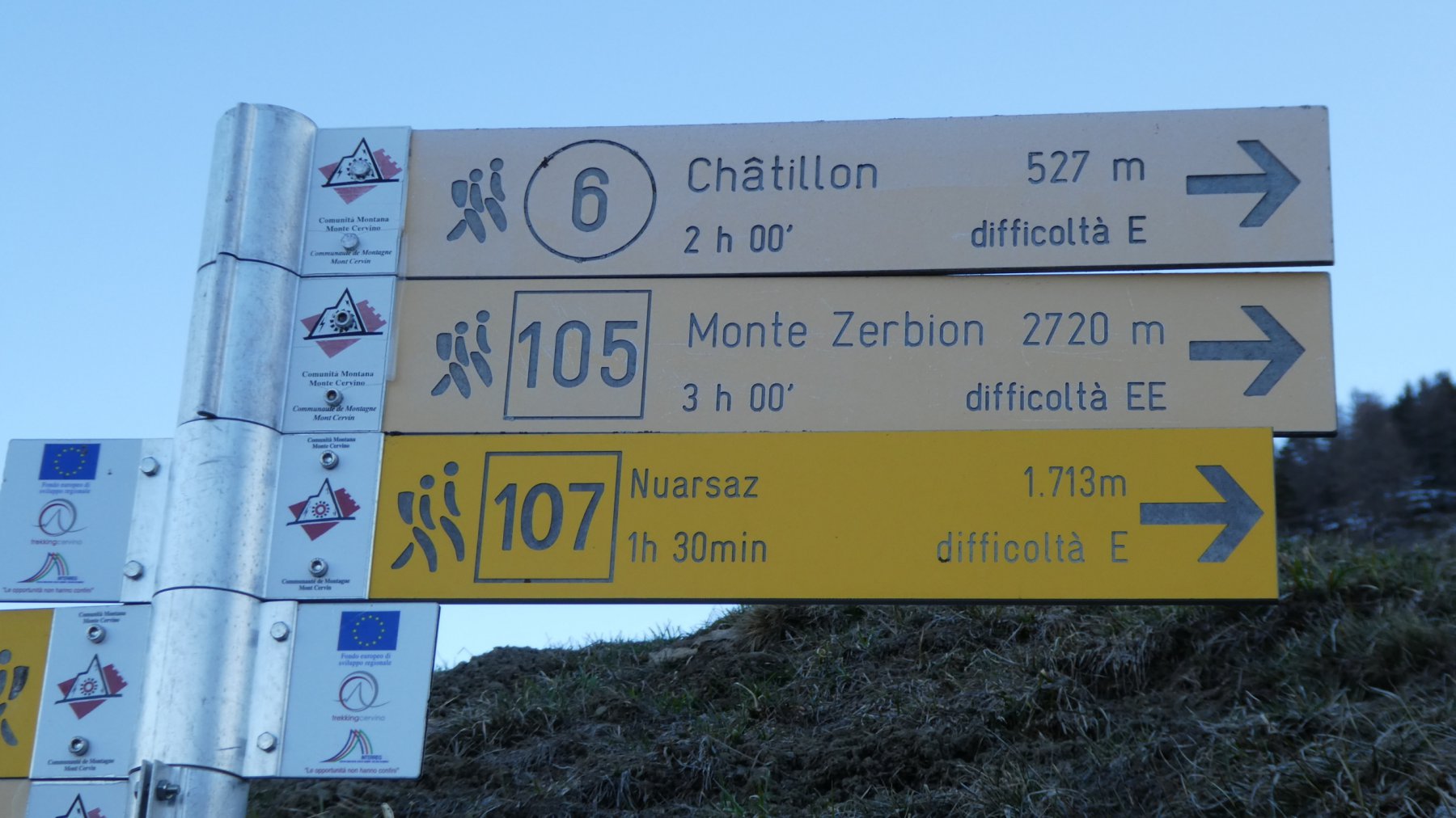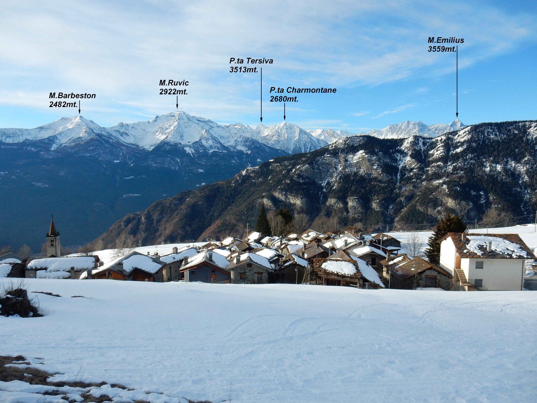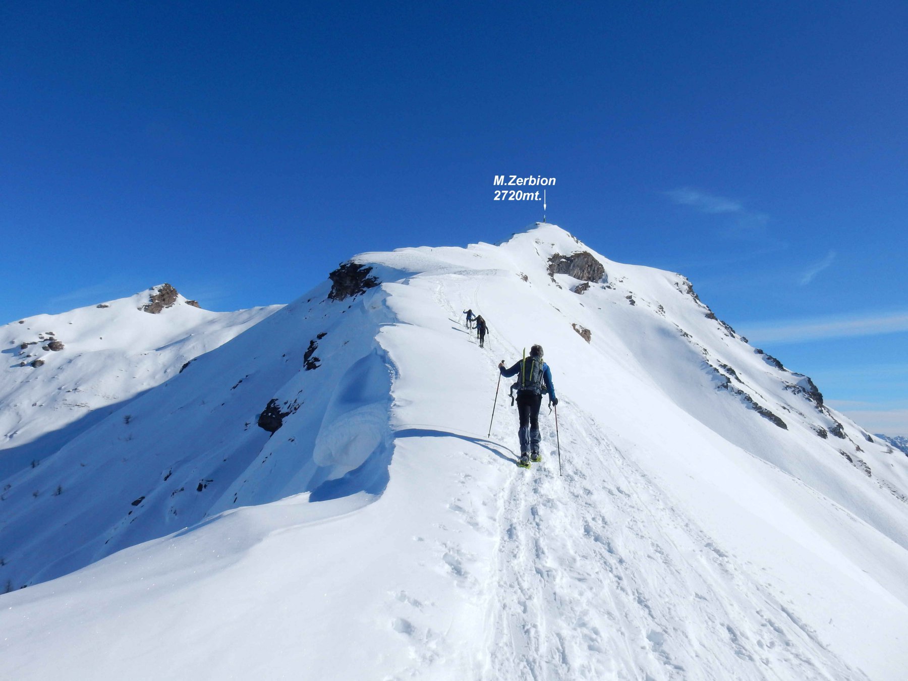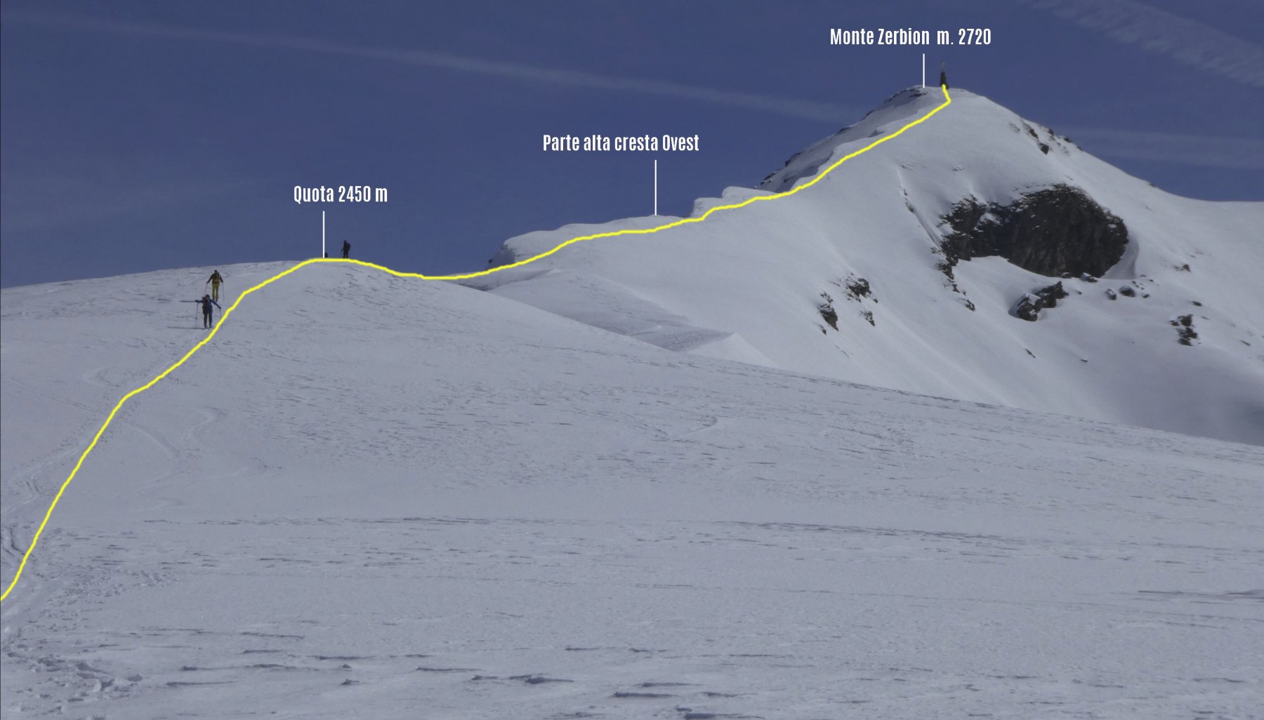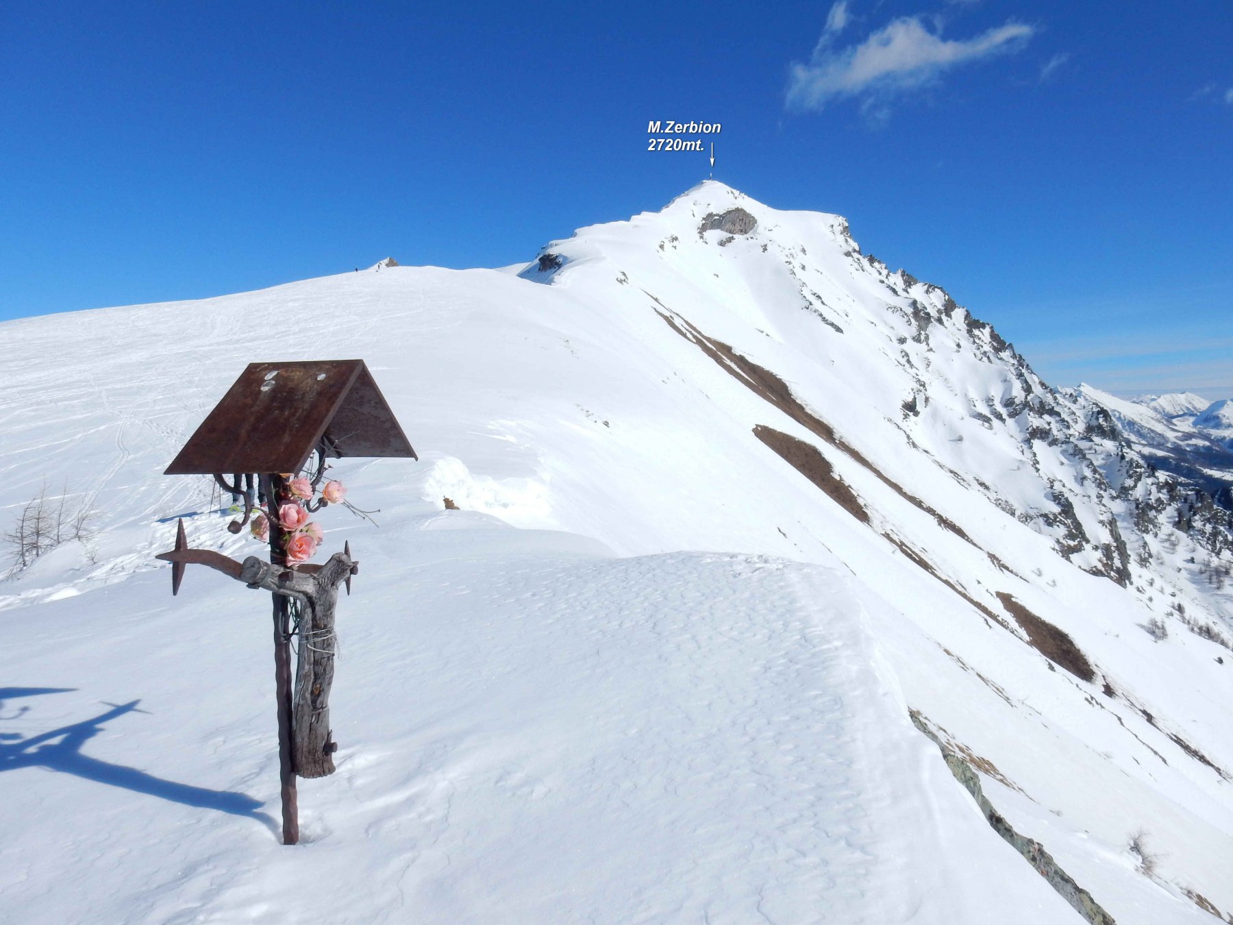 Dal parcheggio all’ingresso del paese si sale lungo una comoda mulattiera (cartelli indicatori per il Monte Zerbion, con segnavia n. 6 e 105) oltrepassando il centro abitato, poi direttamente lungo i prati prima, tagliando in alcuni punti i vari tornanti della strada interpoderale, per riprenderla più in alto, quando si inoltra in un valloncello. Proseguendo lungo la stradina, a quota 1730 m si raggiunge un bivio con cartelli indicatori, si trascura la diramazione di sinistra (indicazione per il Monte Zerbion passando per il Colle della Portola, segnavia n. 6) e si prosegue invece a destra (altro cartello indicatore per lo Zerbion, segnavia 105). La stradina si inoltra ora in una ampia fascia boscosa che risale verso destra, supera il Torrente Promiod, raggiunge una radura dove si trova l’Alpe Arsine m. 1837. Oltre la radura il bosco si infittisce nuovamente, si prende quota con varie serpentine, uscendo su una seconda radura senza vegetazione, nei pressi dell’Alpe Francou m. 2035, dove ci sono alcune baite ormai diroccate. Si prosegue inoltrandosi in una seconda fascia boscosa, con la traccia che sale verso destra, e poi con una serie di serpentine si sbuca alla base dell’ampia dorsale Ovest dello Zerbion a quota 2200 m circa. A questo punto non rimane che proseguire lungo l’ampia e poco inclinata dorsale, molto agevole e sicura, non presenta alcun problema fino alla spalla di quota 2450 m. Da questo punto l’itinerario diventa più impegnativo, la cresta inizia a restringersi, badando alle eventuali cornici rivolte a sinistra e ai ripidi pendii che scendono sulla destra, si prosegue qualche metro sotto il filo, fino a quota 2600 m è normalmente possibile salire con le ciaspole ai piedi, poi la cresta diventa più sottile, ripida, esposta, e con alcune cornici, questo tratto richiede attenzione e una corretta valutazione delle condizioni di innevamento, quasi sempre sono necessari piccozza e ramponi, un ultimo ripido pendio porta in vetta, dove si trova la grande statua della Madonna e un piccolo altare.
