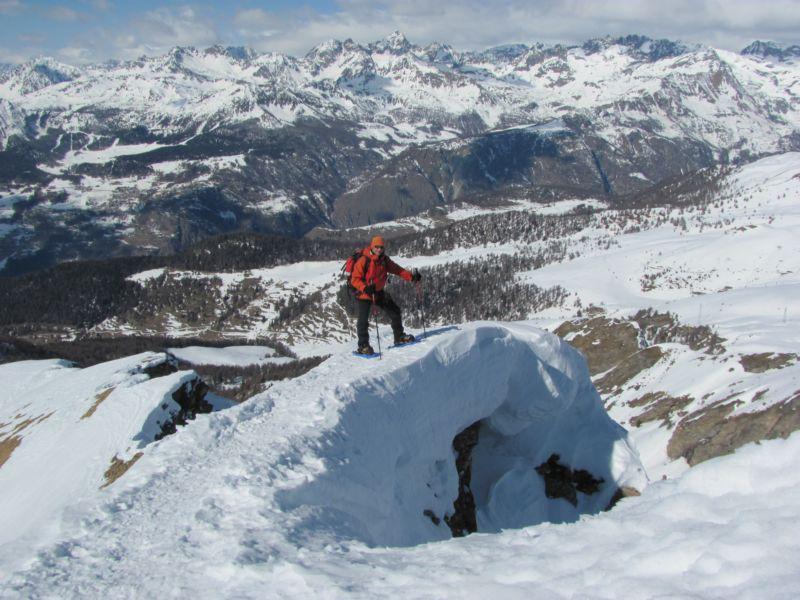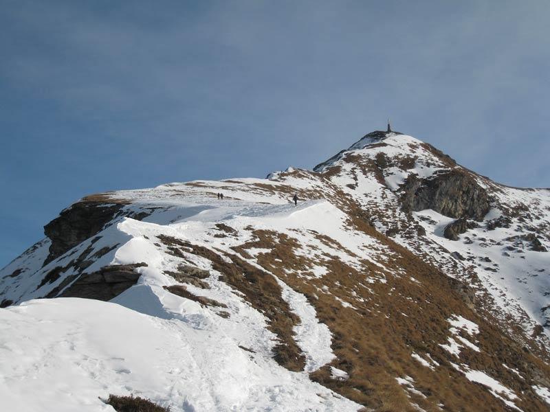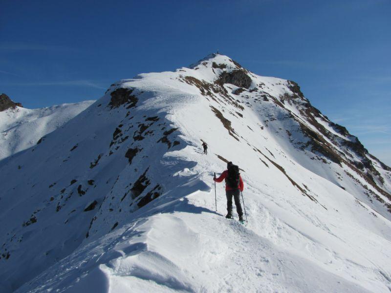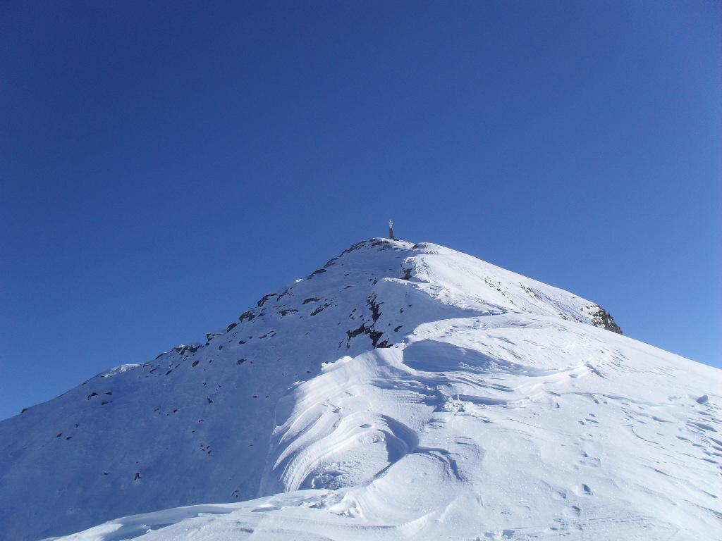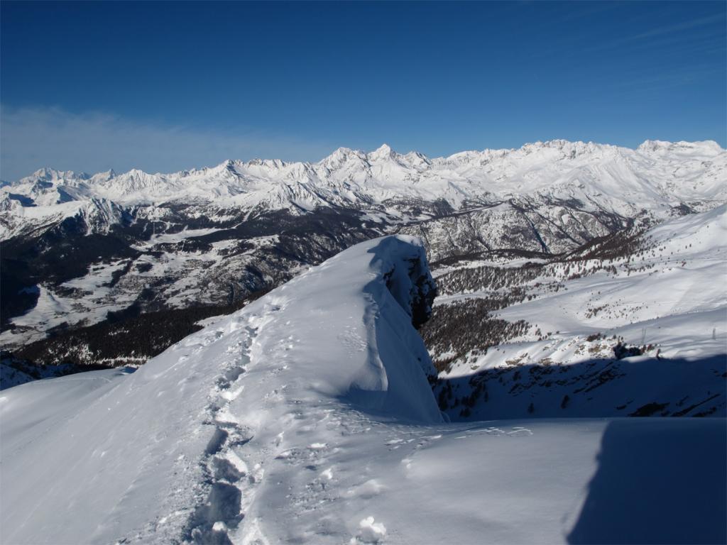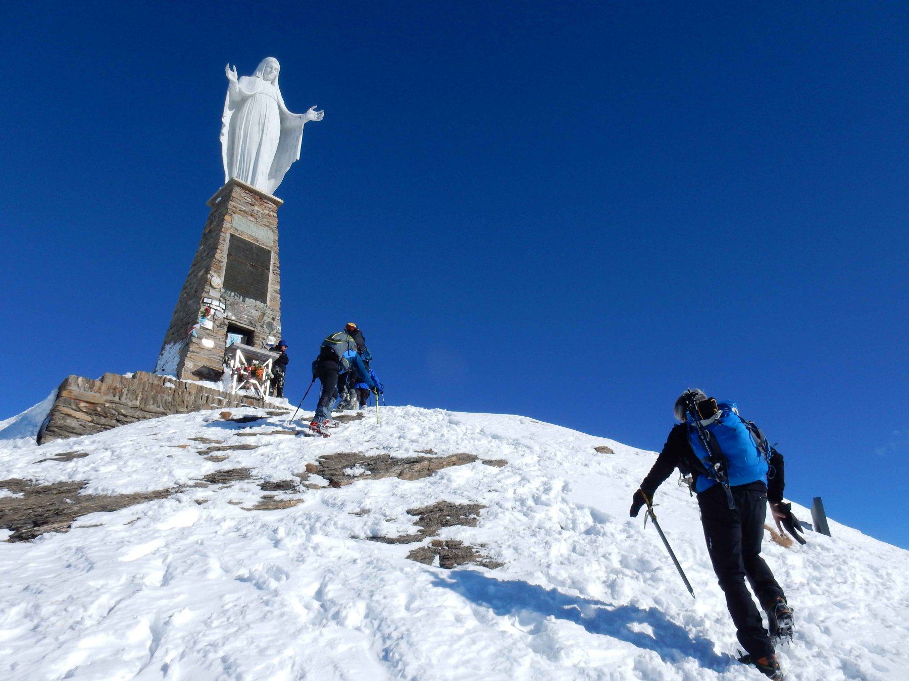 Dal parcheggio all’ingresso del paese si sale lungo una comoda mulattiera (cartelli indicatori per il Monte Zerbion, con segnavia n. 6 e 105) oltrepassando il centro abitato, poi direttamente lungo i prati prima, tagliando in alcuni punti i vari tornanti della strada interpoderale, per riprenderla più in alto, quando si inoltra in un valloncello. Proseguendo lungo la stradina, a quota 1730 m si raggiunge un bivio con cartelli indicatori, si trascura la diramazione di sinistra (indicazione per il Monte Zerbion passando per il Colle della Portola, segnavia n. 6) e si prosegue invece a destra (altro cartello indicatore per lo Zerbion, segnavia 105). La stradina si inoltra ora in una ampia fascia boscosa che risale verso destra, supera il Torrente Promiod, raggiunge una radura dove si trova l’Alpe Arsine m. 1837. Oltre la radura il bosco si infittisce nuovamente, si prende quota con varie serpentine, uscendo su una seconda radura senza vegetazione, nei pressi dell’Alpe Francou m. 2035, dove ci sono alcune baite ormai diroccate. Si prosegue inoltrandosi in una seconda fascia boscosa, con la traccia che sale verso destra, e poi con una serie di serpentine si sbuca alla base dell’ampia dorsale Ovest dello Zerbion a quota 2200 m circa. A questo punto non rimane che proseguire lungo l’ampia e poco inclinata dorsale, molto agevole e sicura, non presenta alcun problema fino alla spalla di quota 2450 m. Da questo punto l’itinerario diventa più impegnativo, la cresta inizia a restringersi, badando alle eventuali cornici rivolte a sinistra e ai ripidi pendii che scendono sulla destra, si prosegue qualche metro sotto il filo, fino a quota 2600 m è normalmente possibile salire con le ciaspole ai piedi, poi la cresta diventa più sottile, ripida, esposta, e con alcune cornici, questo tratto richiede attenzione e una corretta valutazione delle condizioni di innevamento, quasi sempre sono necessari piccozza e ramponi, un ultimo ripido pendio porta in vetta, dove si trova la grande statua della Madonna e un piccolo altare.