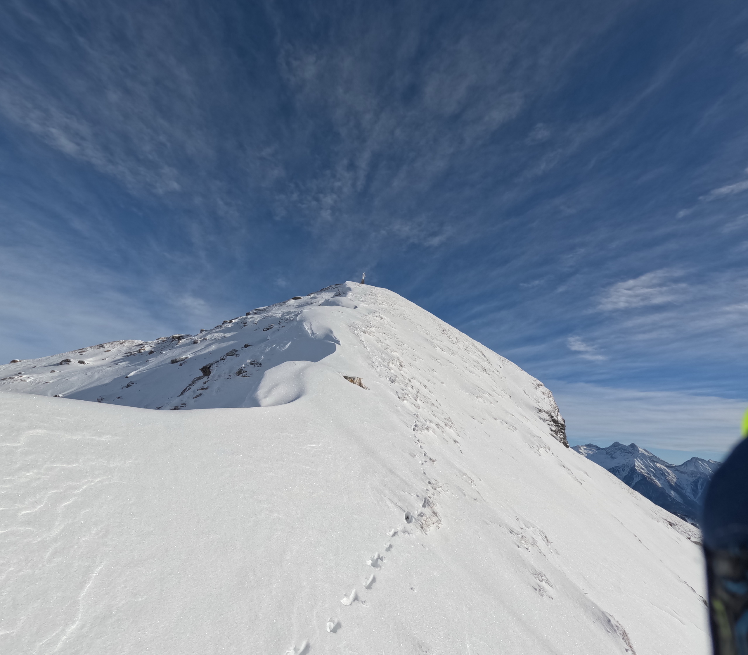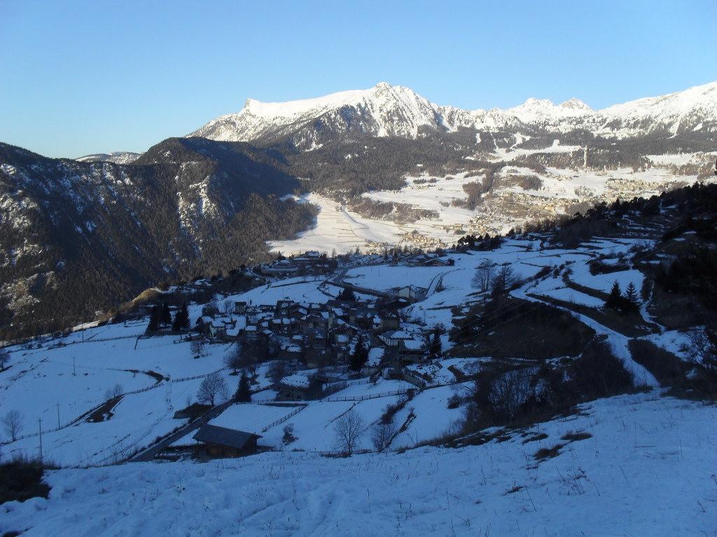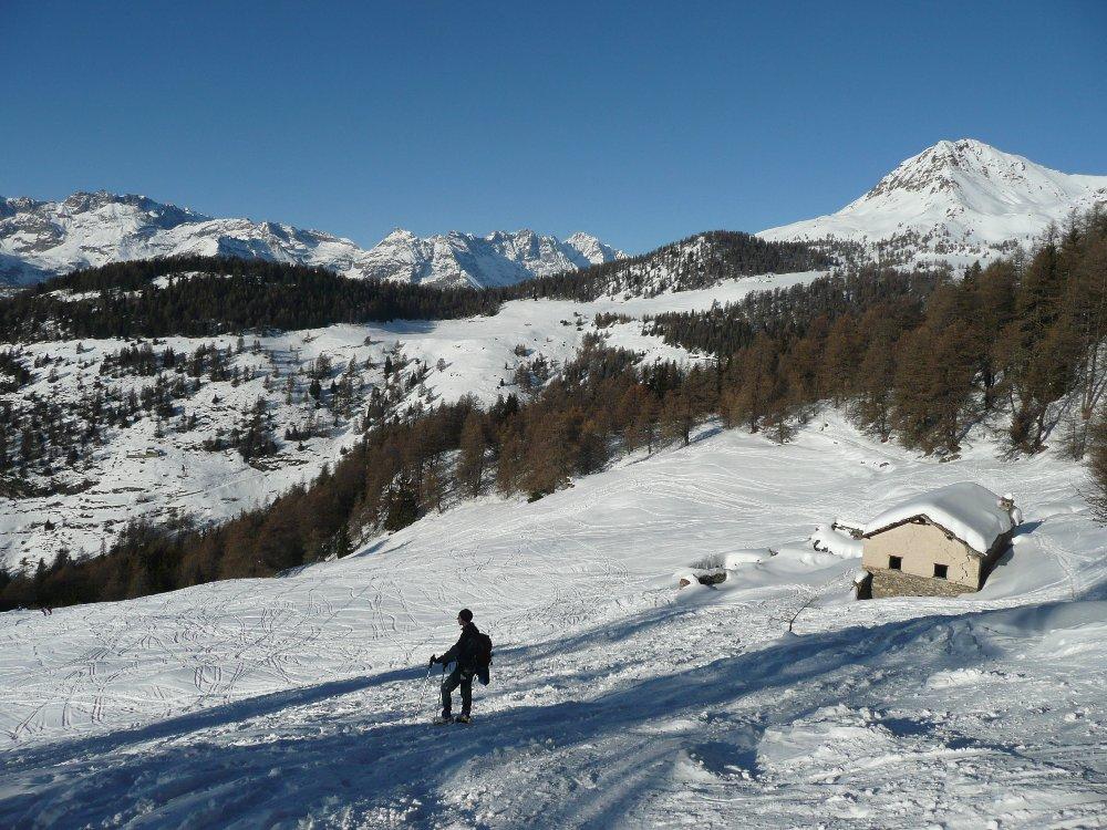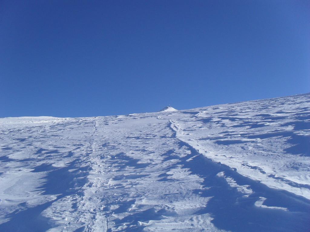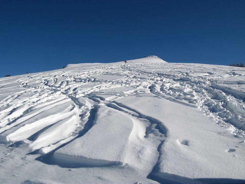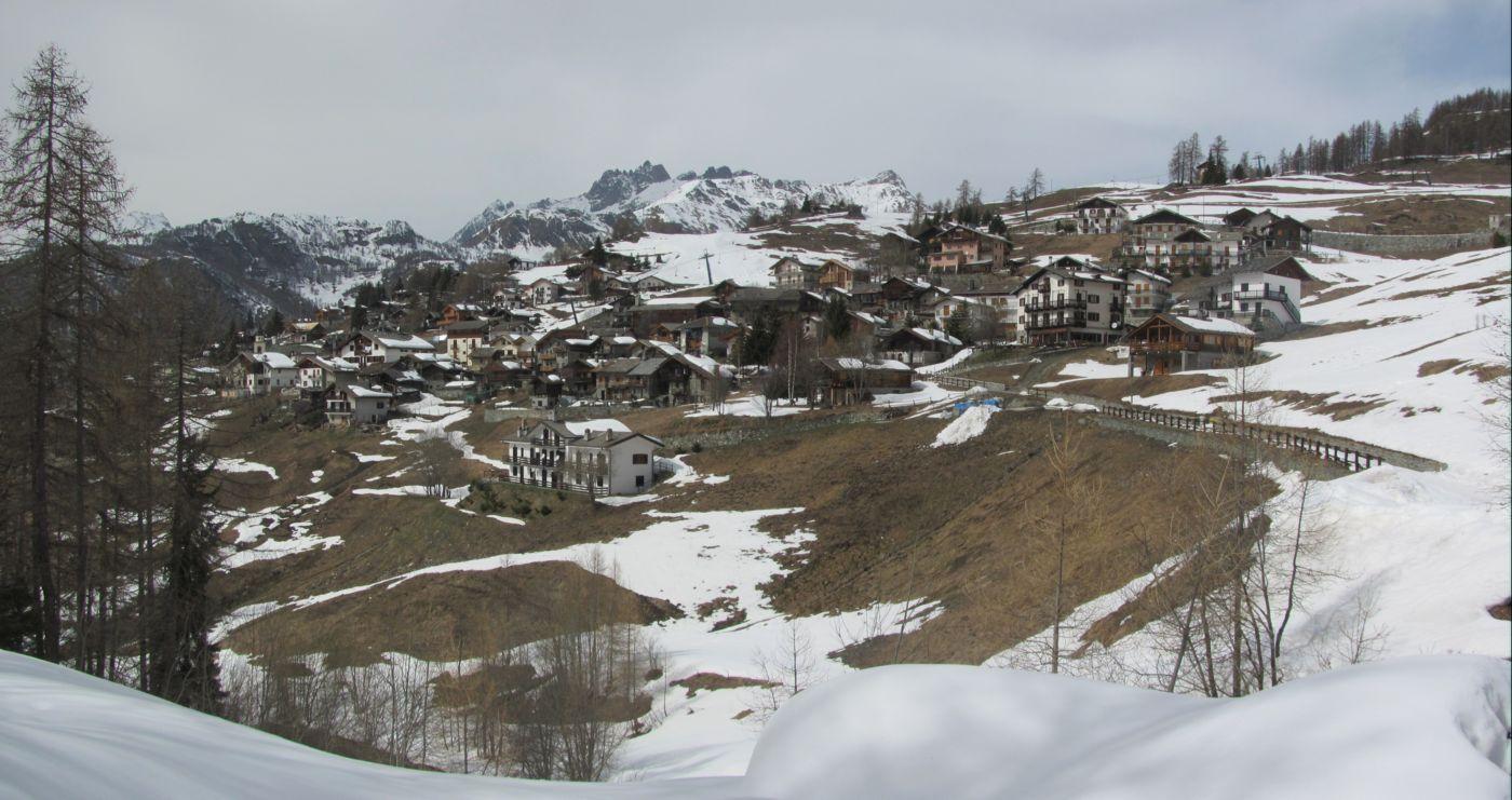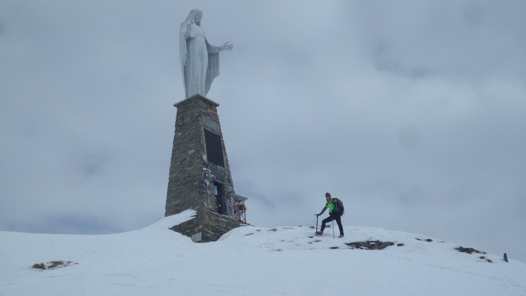 Dal parcheggio all’ingresso del paese si sale lungo una comoda mulattiera (cartelli indicatori per il Monte Zerbion, con segnavia n. 6 e 105) oltrepassando il centro abitato, poi direttamente lungo i prati prima, tagliando in alcuni punti i vari tornanti della strada interpoderale, per riprenderla più in alto, quando si inoltra in un valloncello. Proseguendo lungo la stradina, a quota 1730 m si raggiunge un bivio con cartelli indicatori, si trascura la diramazione di sinistra (indicazione per il Monte Zerbion passando per il Colle della Portola, segnavia n. 6) e si prosegue invece a destra (altro cartello indicatore per lo Zerbion, segnavia 105). La stradina si inoltra ora in una ampia fascia boscosa che risale verso destra, supera il Torrente Promiod, raggiunge una radura dove si trova l’Alpe Arsine m. 1837. Oltre la radura il bosco si infittisce nuovamente, si prende quota con varie serpentine, uscendo su una seconda radura senza vegetazione, nei pressi dell’Alpe Francou m. 2035, dove ci sono alcune baite ormai diroccate. Si prosegue inoltrandosi in una seconda fascia boscosa, con la traccia che sale verso destra, e poi con una serie di serpentine si sbuca alla base dell’ampia dorsale Ovest dello Zerbion a quota 2200 m circa. A questo punto non rimane che proseguire lungo l’ampia e poco inclinata dorsale, molto agevole e sicura, non presenta alcun problema fino alla spalla di quota 2450 m. Da questo punto l’itinerario diventa più impegnativo, la cresta inizia a restringersi, badando alle eventuali cornici rivolte a sinistra e ai ripidi pendii che scendono sulla destra, si prosegue qualche metro sotto il filo, fino a quota 2600 m è normalmente possibile salire con le ciaspole ai piedi, poi la cresta diventa più sottile, ripida, esposta, e con alcune cornici, questo tratto richiede attenzione e una corretta valutazione delle condizioni di innevamento, quasi sempre sono necessari piccozza e ramponi, un ultimo ripido pendio porta in vetta, dove si trova la grande statua della Madonna e un piccolo altare.