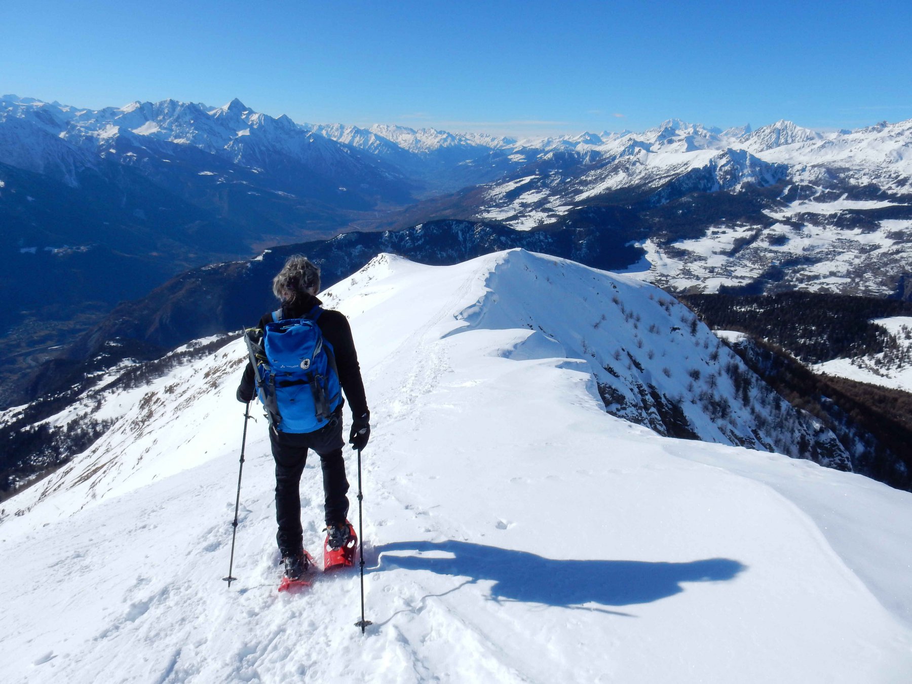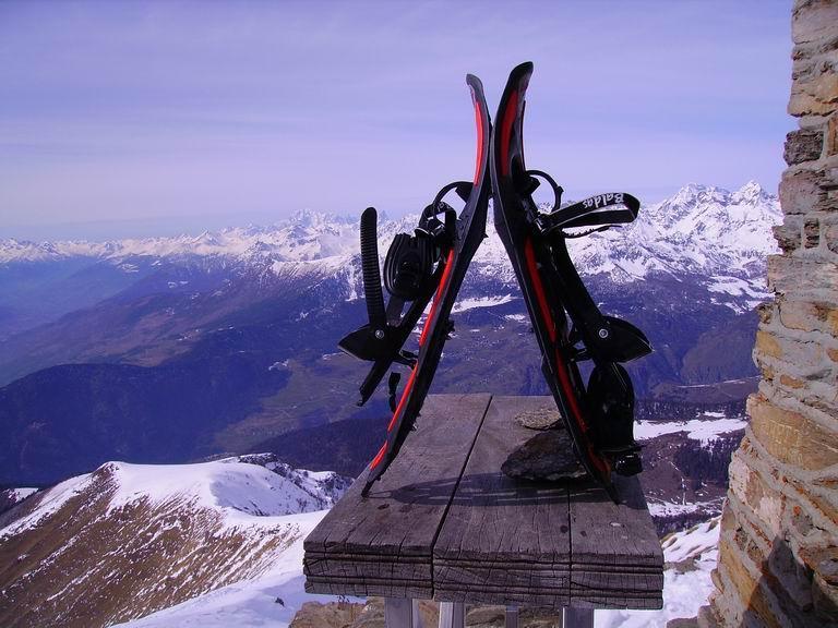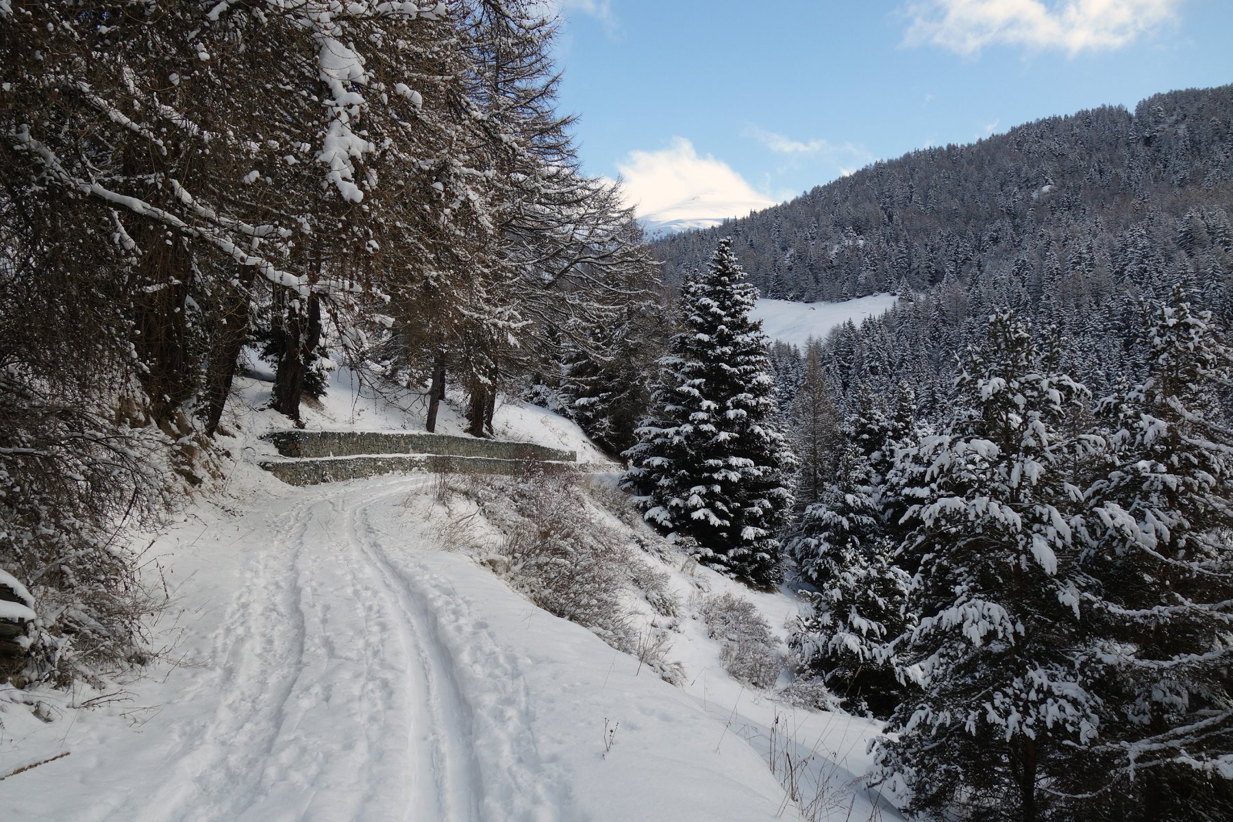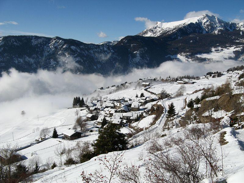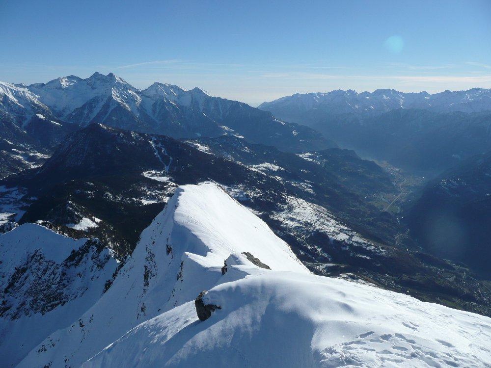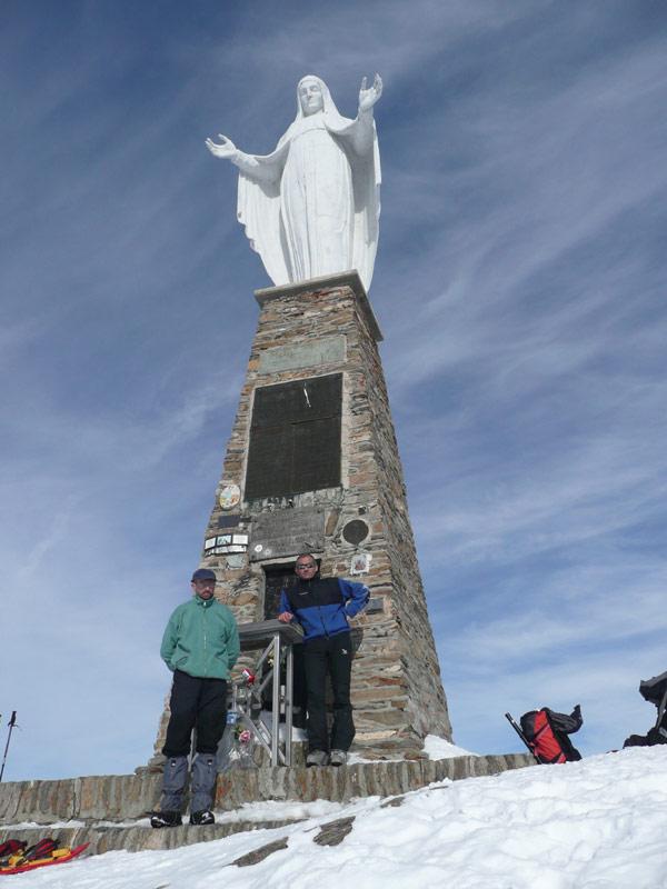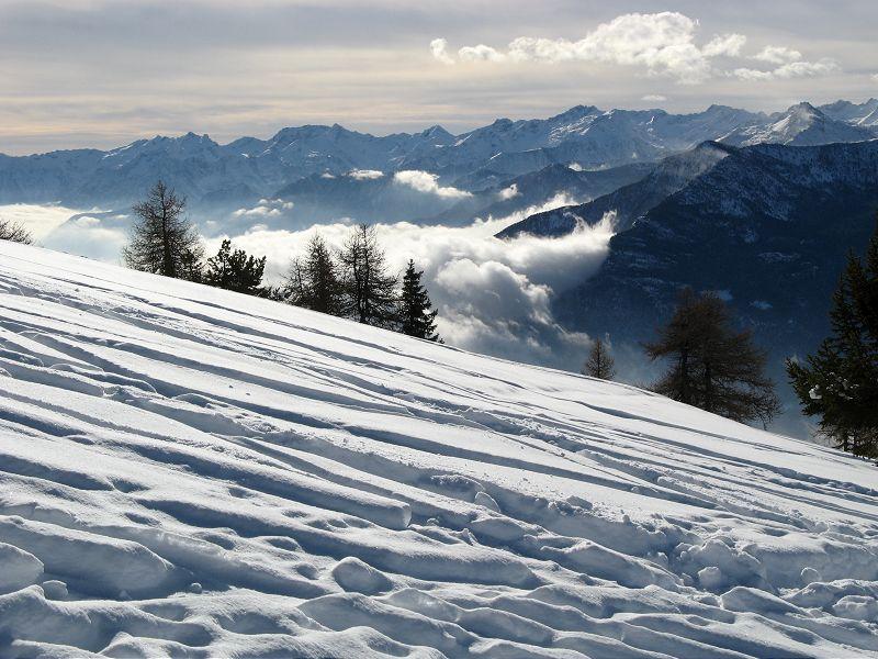 Dal parcheggio all’ingresso del paese si sale lungo una comoda mulattiera (cartelli indicatori per il Monte Zerbion, con segnavia n. 6 e 105) oltrepassando il centro abitato, poi direttamente lungo i prati prima, tagliando in alcuni punti i vari tornanti della strada interpoderale, per riprenderla più in alto, quando si inoltra in un valloncello. Proseguendo lungo la stradina, a quota 1730 m si raggiunge un bivio con cartelli indicatori, si trascura la diramazione di sinistra (indicazione per il Monte Zerbion passando per il Colle della Portola, segnavia n. 6) e si prosegue invece a destra (altro cartello indicatore per lo Zerbion, segnavia 105). La stradina si inoltra ora in una ampia fascia boscosa che risale verso destra, supera il Torrente Promiod, raggiunge una radura dove si trova l’Alpe Arsine m. 1837. Oltre la radura il bosco si infittisce nuovamente, si prende quota con varie serpentine, uscendo su una seconda radura senza vegetazione, nei pressi dell’Alpe Francou m. 2035, dove ci sono alcune baite ormai diroccate. Si prosegue inoltrandosi in una seconda fascia boscosa, con la traccia che sale verso destra, e poi con una serie di serpentine si sbuca alla base dell’ampia dorsale Ovest dello Zerbion a quota 2200 m circa. A questo punto non rimane che proseguire lungo l’ampia e poco inclinata dorsale, molto agevole e sicura, non presenta alcun problema fino alla spalla di quota 2450 m. Da questo punto l’itinerario diventa più impegnativo, la cresta inizia a restringersi, badando alle eventuali cornici rivolte a sinistra e ai ripidi pendii che scendono sulla destra, si prosegue qualche metro sotto il filo, fino a quota 2600 m è normalmente possibile salire con le ciaspole ai piedi, poi la cresta diventa più sottile, ripida, esposta, e con alcune cornici, questo tratto richiede attenzione e una corretta valutazione delle condizioni di innevamento, quasi sempre sono necessari piccozza e ramponi, un ultimo ripido pendio porta in vetta, dove si trova la grande statua della Madonna e un piccolo altare.