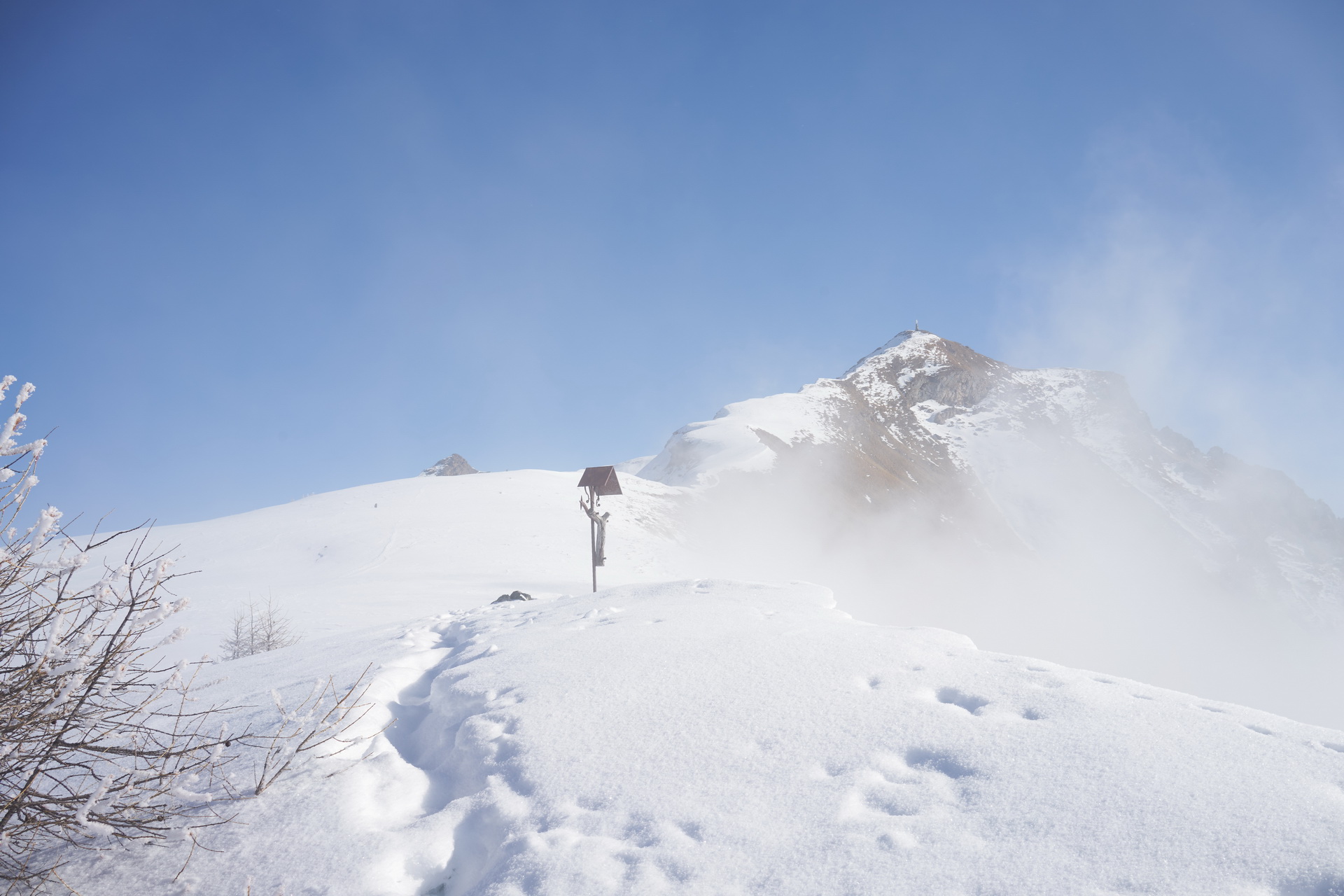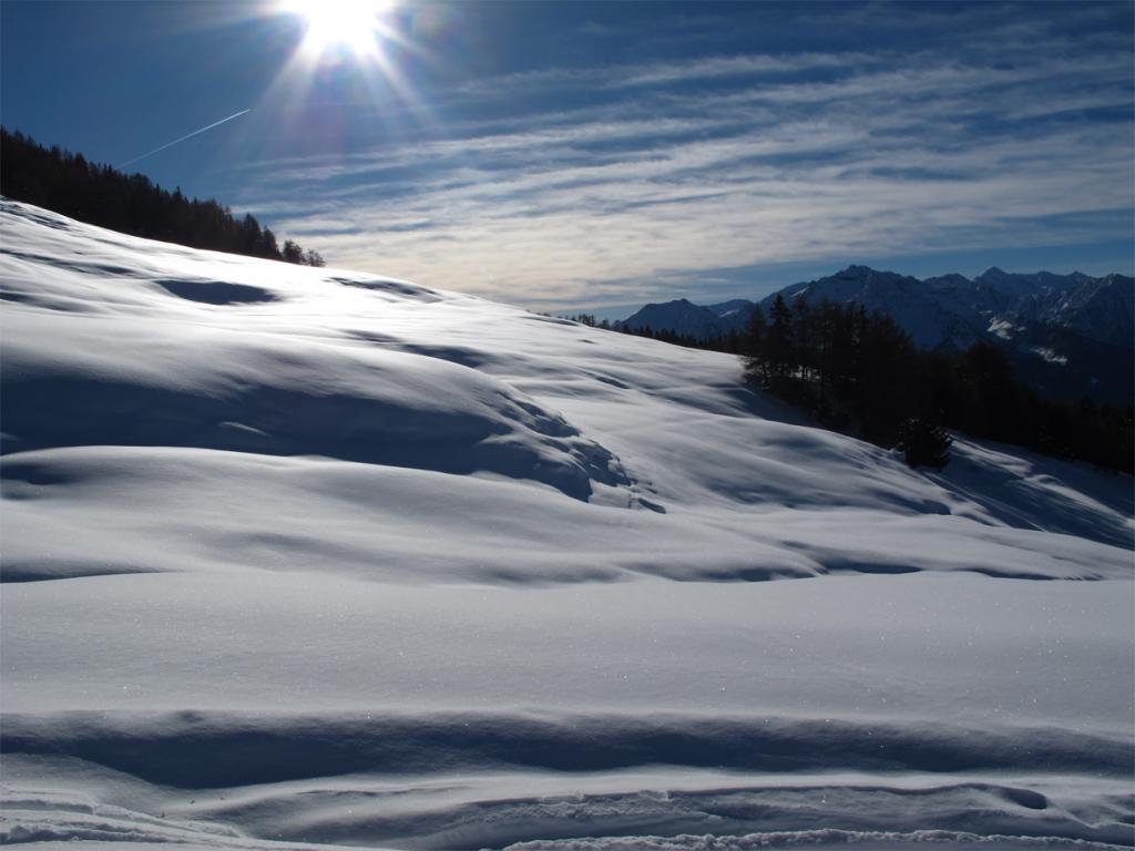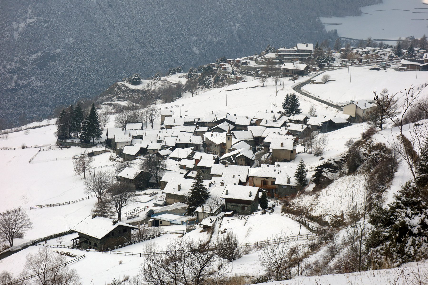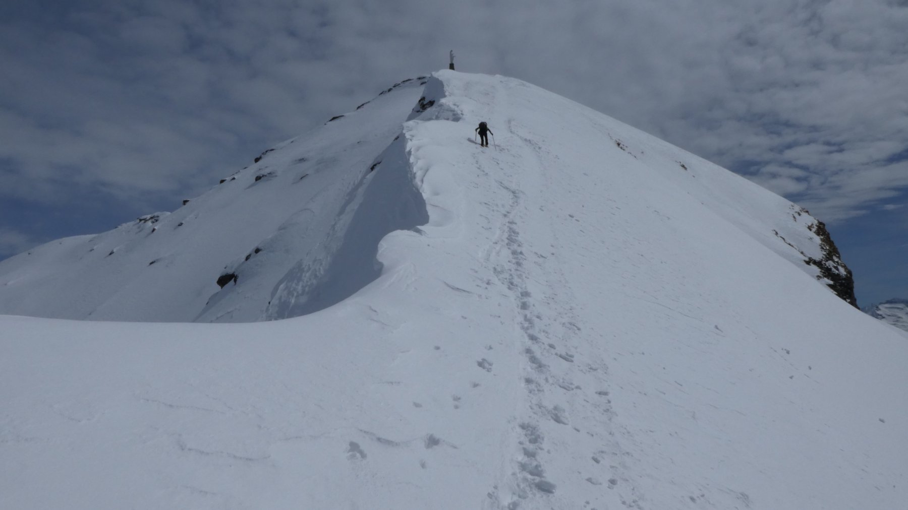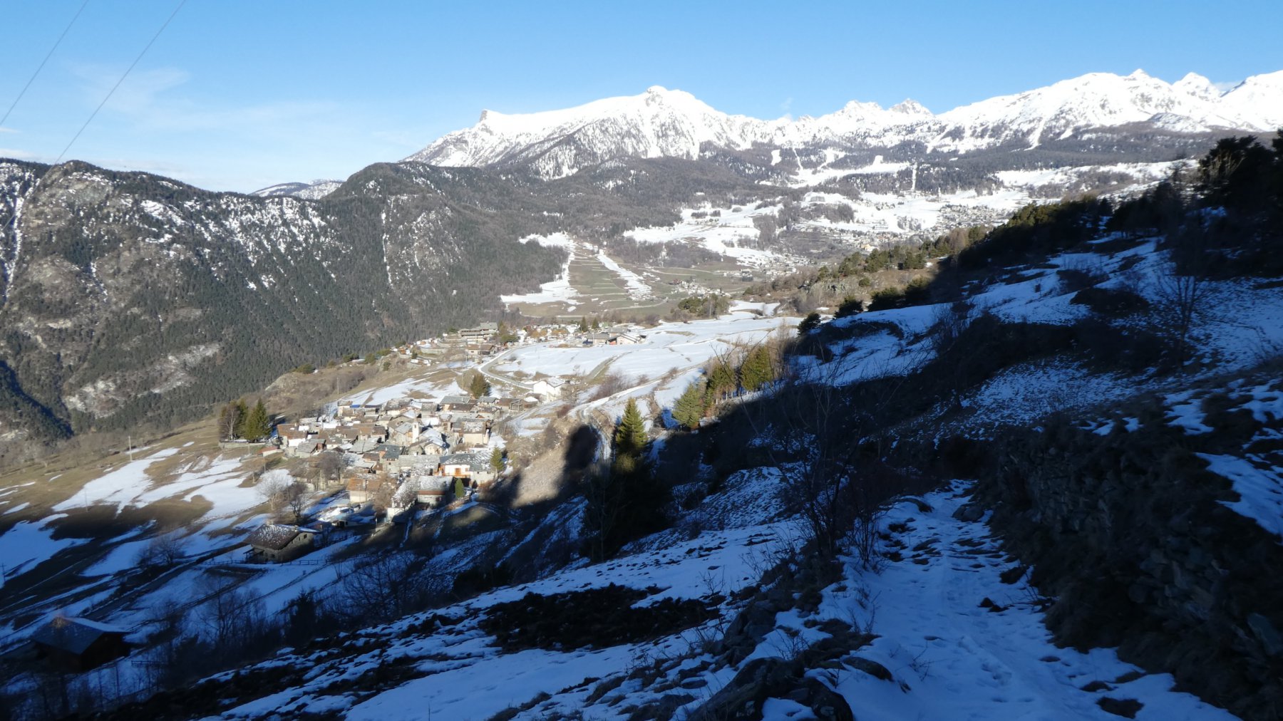 Dal parcheggio all’ingresso del paese si sale lungo una comoda mulattiera (cartelli indicatori per il Monte Zerbion, con segnavia n. 6 e 105) oltrepassando il centro abitato, poi direttamente lungo i prati prima, tagliando in alcuni punti i vari tornanti della strada interpoderale, per riprenderla più in alto, quando si inoltra in un valloncello. Proseguendo lungo la stradina, a quota 1730 m si raggiunge un bivio con cartelli indicatori, si trascura la diramazione di sinistra (indicazione per il Monte Zerbion passando per il Colle della Portola, segnavia n. 6) e si prosegue invece a destra (altro cartello indicatore per lo Zerbion, segnavia 105). La stradina si inoltra ora in una ampia fascia boscosa che risale verso destra, supera il Torrente Promiod, raggiunge una radura dove si trova l’Alpe Arsine m. 1837. Oltre la radura il bosco si infittisce nuovamente, si prende quota con varie serpentine, uscendo su una seconda radura senza vegetazione, nei pressi dell’Alpe Francou m. 2035, dove ci sono alcune baite ormai diroccate. Si prosegue inoltrandosi in una seconda fascia boscosa, con la traccia che sale verso destra, e poi con una serie di serpentine si sbuca alla base dell’ampia dorsale Ovest dello Zerbion a quota 2200 m circa. A questo punto non rimane che proseguire lungo l’ampia e poco inclinata dorsale, molto agevole e sicura, non presenta alcun problema fino alla spalla di quota 2450 m. Da questo punto l’itinerario diventa più impegnativo, la cresta inizia a restringersi, badando alle eventuali cornici rivolte a sinistra e ai ripidi pendii che scendono sulla destra, si prosegue qualche metro sotto il filo, fino a quota 2600 m è normalmente possibile salire con le ciaspole ai piedi, poi la cresta diventa più sottile, ripida, esposta, e con alcune cornici, questo tratto richiede attenzione e una corretta valutazione delle condizioni di innevamento, quasi sempre sono necessari piccozza e ramponi, un ultimo ripido pendio porta in vetta, dove si trova la grande statua della Madonna e un piccolo altare.