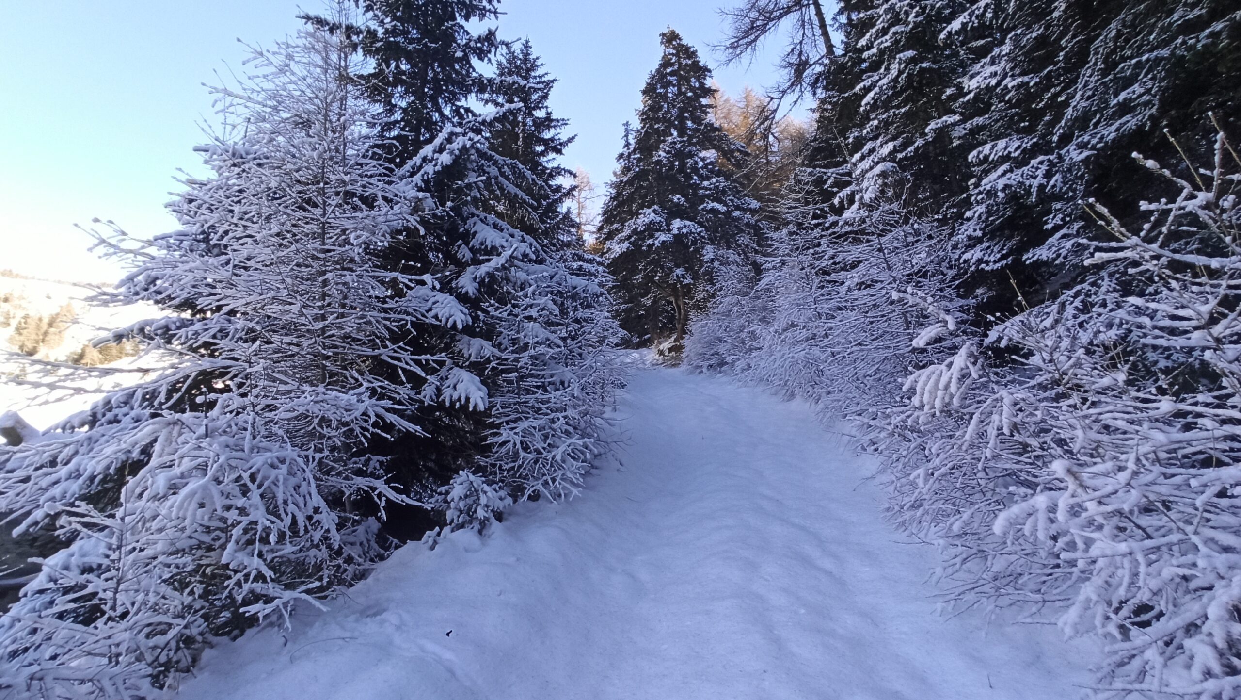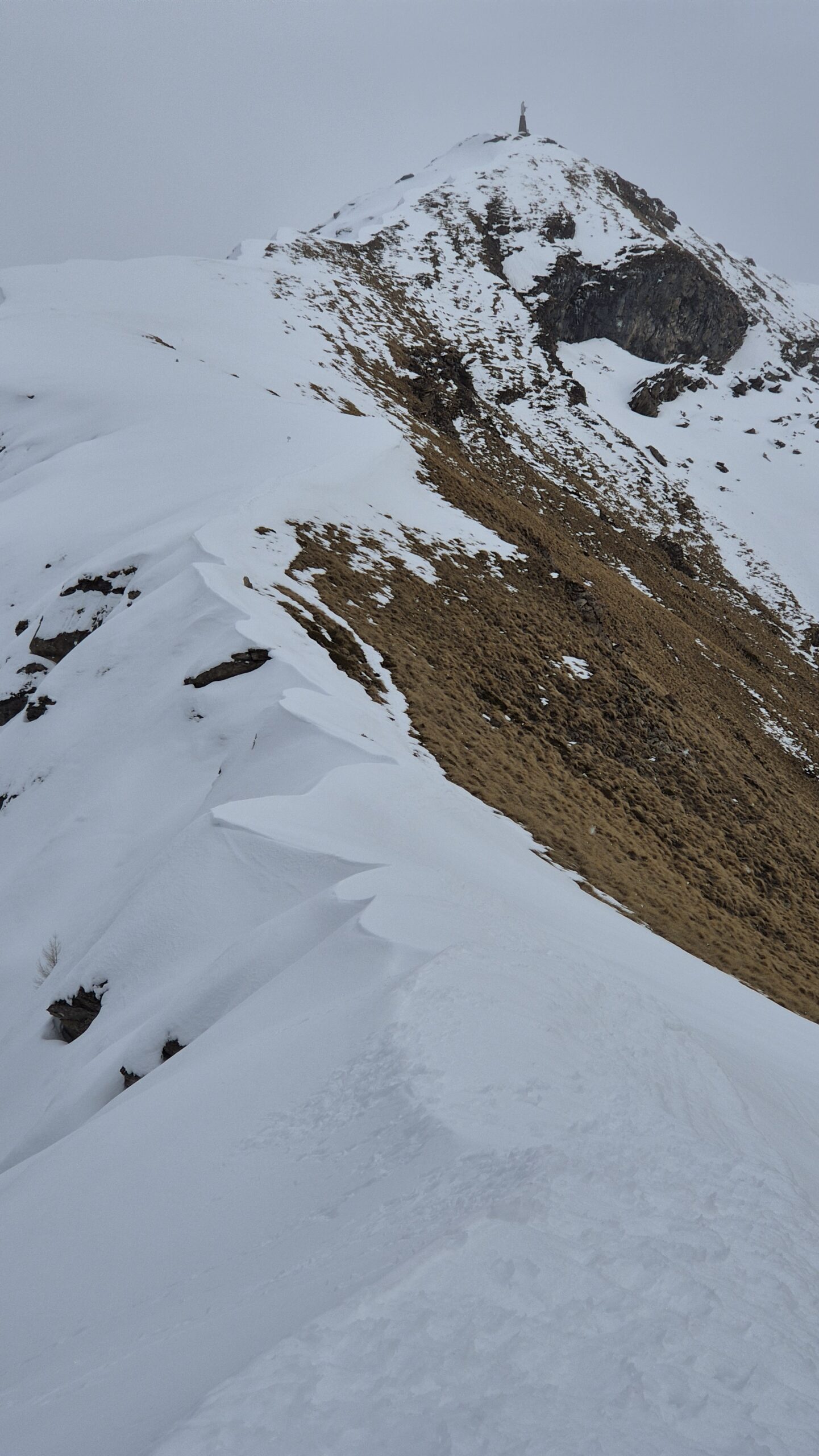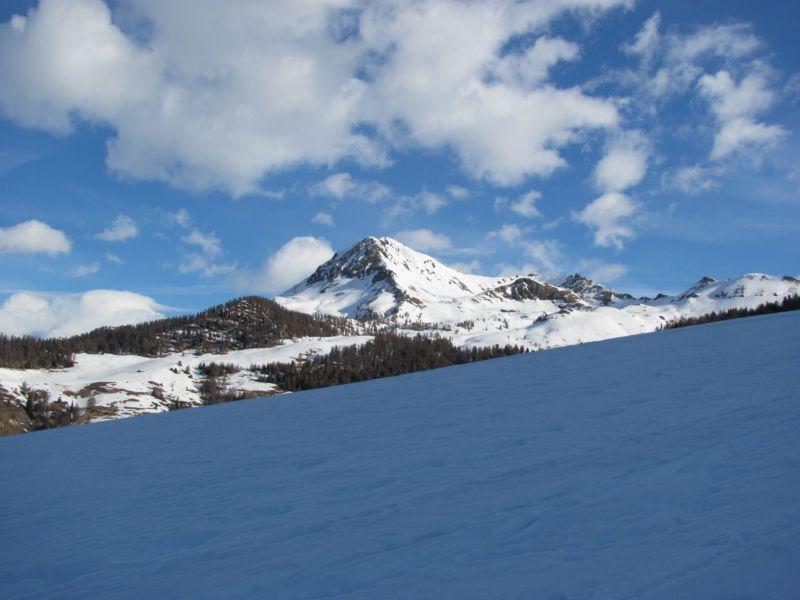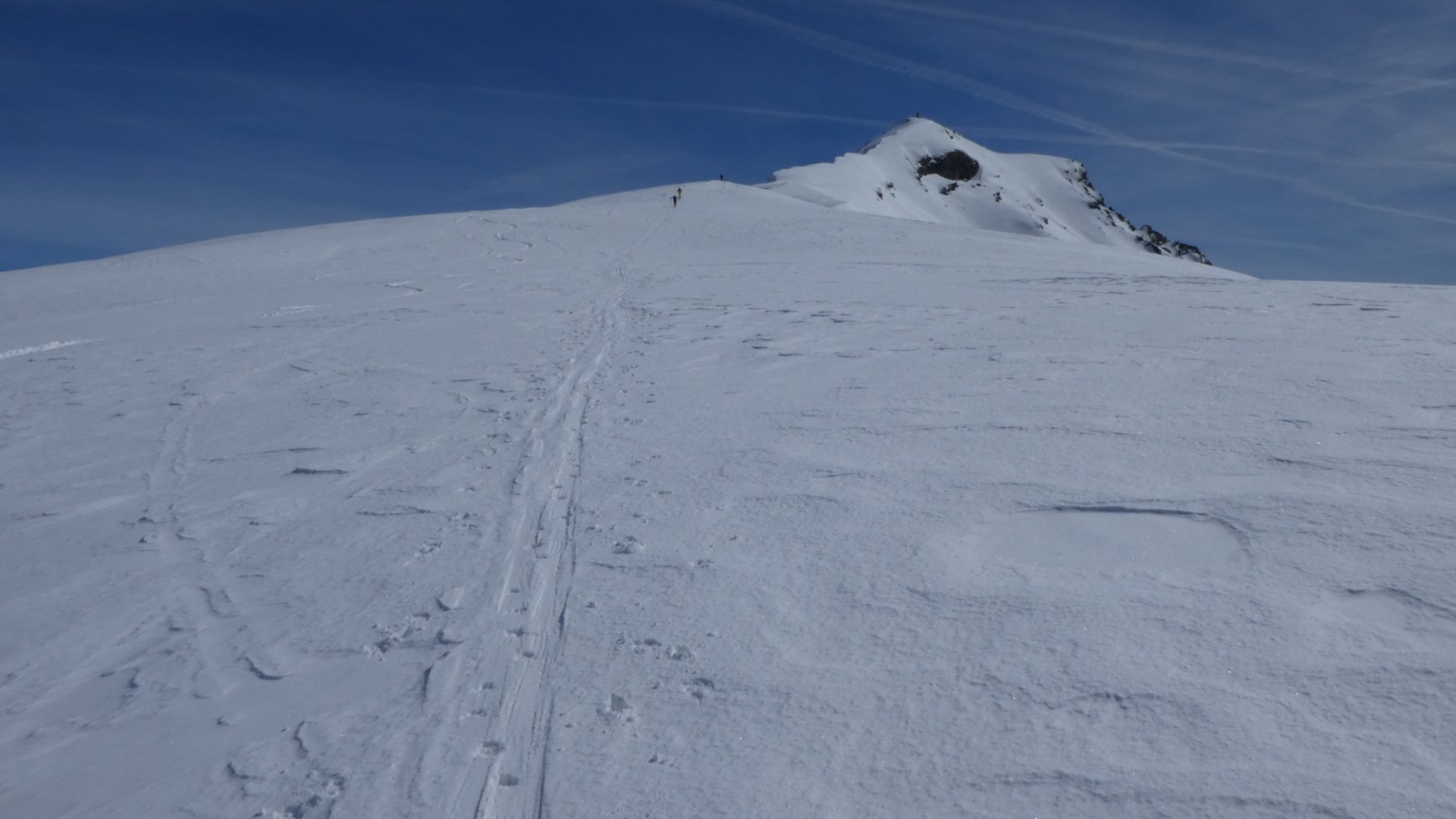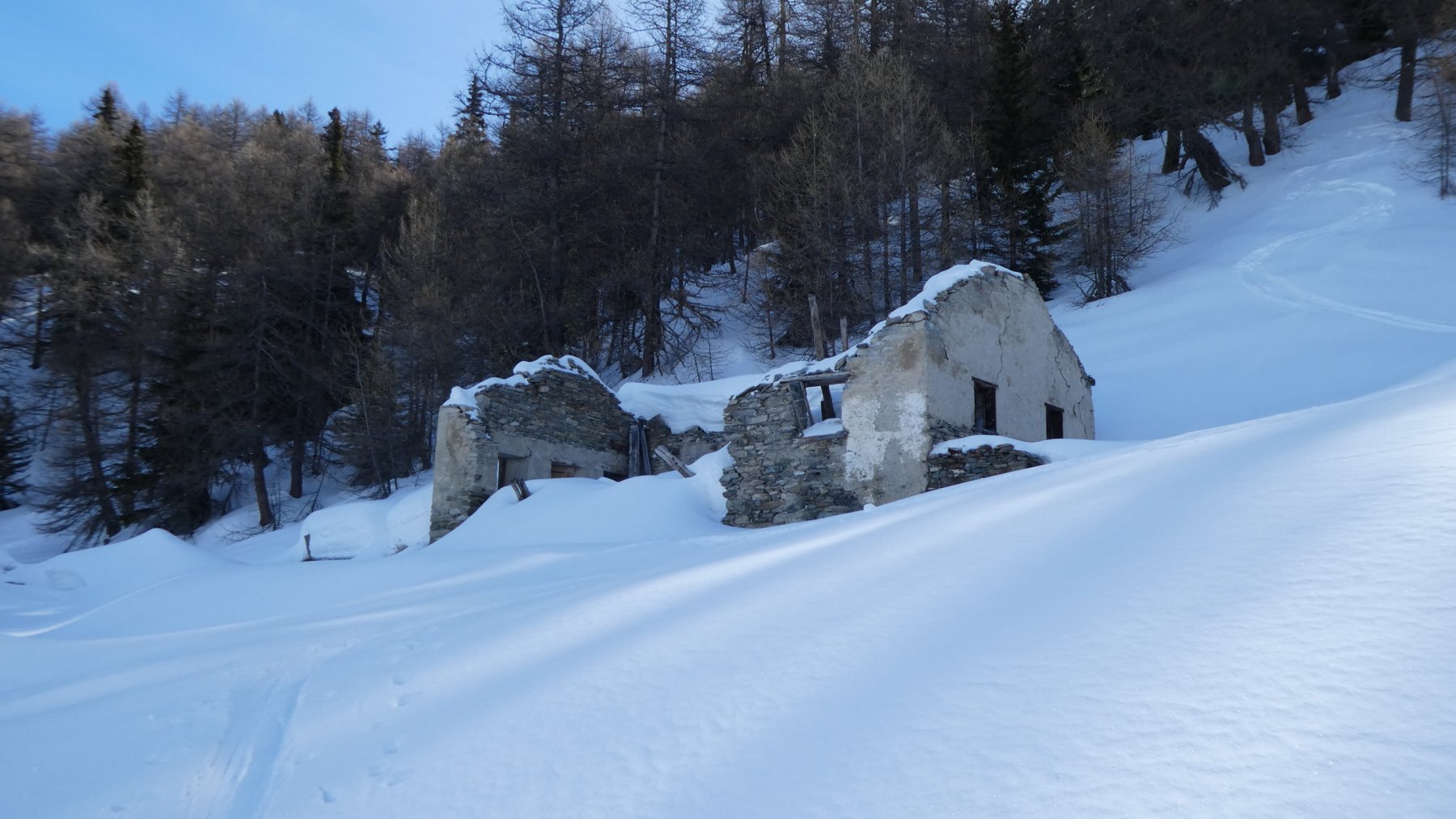 Dal parcheggio all’ingresso del paese si sale lungo una comoda mulattiera (cartelli indicatori per il Monte Zerbion, con segnavia n. 6 e 105) oltrepassando il centro abitato, poi direttamente lungo i prati prima, tagliando in alcuni punti i vari tornanti della strada interpoderale, per riprenderla più in alto, quando si inoltra in un valloncello. Proseguendo lungo la stradina, a quota 1730 m si raggiunge un bivio con cartelli indicatori, si trascura la diramazione di sinistra (indicazione per il Monte Zerbion passando per il Colle della Portola, segnavia n. 6) e si prosegue invece a destra (altro cartello indicatore per lo Zerbion, segnavia 105). La stradina si inoltra ora in una ampia fascia boscosa che risale verso destra, supera il Torrente Promiod, raggiunge una radura dove si trova l’Alpe Arsine m. 1837. Oltre la radura il bosco si infittisce nuovamente, si prende quota con varie serpentine, uscendo su una seconda radura senza vegetazione, nei pressi dell’Alpe Francou m. 2035, dove ci sono alcune baite ormai diroccate. Si prosegue inoltrandosi in una seconda fascia boscosa, con la traccia che sale verso destra, e poi con una serie di serpentine si sbuca alla base dell’ampia dorsale Ovest dello Zerbion a quota 2200 m circa. A questo punto non rimane che proseguire lungo l’ampia e poco inclinata dorsale, molto agevole e sicura, non presenta alcun problema fino alla spalla di quota 2450 m. Da questo punto l’itinerario diventa più impegnativo, la cresta inizia a restringersi, badando alle eventuali cornici rivolte a sinistra e ai ripidi pendii che scendono sulla destra, si prosegue qualche metro sotto il filo, fino a quota 2600 m è normalmente possibile salire con le ciaspole ai piedi, poi la cresta diventa più sottile, ripida, esposta, e con alcune cornici, questo tratto richiede attenzione e una corretta valutazione delle condizioni di innevamento, quasi sempre sono necessari piccozza e ramponi, un ultimo ripido pendio porta in vetta, dove si trova la grande statua della Madonna e un piccolo altare.
