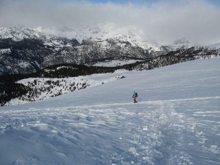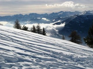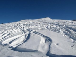 Neve fresca su tutto il percorso, più abbondante oltre il primo tratto di bosco, dove si sprofondava alla grande appena fuori dalla traccia. Nel complesso neve più bella per gli scialpinisti che per i ciaspolatori. Fuori dal bosco vento fastidioso che ci ha accompagnati fino alla croce dell’antecima. Più in alto vento forte che spazzava la cresta e ha fatto desistere molti scialpinisti dal raggiungere la cima (oggi fattibile).