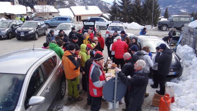 Freddo, grigio, raffiche di vento; saliti poco oltre il bosco e poi di corsa al parcheggio all’appuntamento con la tradizionale pasta all’amatriciana ( ottima, abbondante …. e tanti altri prodotti locali….) organizzata e offerta dal CAI Chatillon per questa uscita di inizio attività 2014!. 5* per la compagnia; 2* per il meteo. Neve buona per racchette.