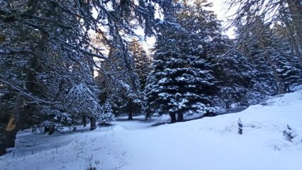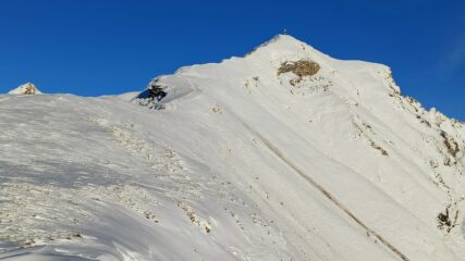 Facile escursione fino all’uscita dal Bosco a quota 2100m. Dopo ampio pendio e inizia l’impegno fisico. A circa quota 2380m finalmente si vede la vetta che sembra vicina ma in termini di tempo e fatica non lo è. Da qui diventa decisamente BR per il passaggio in cresta e la valutazione della neve. Di suo lo spazio in cresta è nei passaggi più delicati giusto per una persona. Dal lato sud pendenza di circa 45°. Strapiombo dal lato nord. Con sufficiente neve adatta (non troppo dura) si va bene con le ciaspole, ma fare molta cautela in qualche passaggio più ripido per tendenza a scivolare all’indietro, quindi puntare bene.