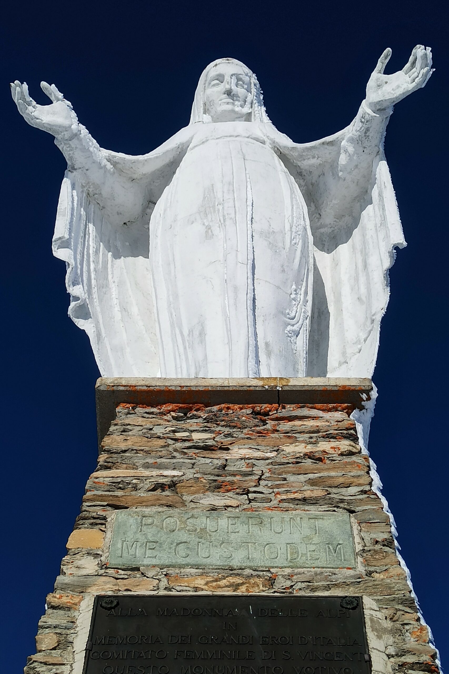 Dopo tanto tempo che aspettavo di fare questa meravigliosa cima (per conformazione, panorama e grande statua di vetta) mi ritrovo a farla prima in invernale che in estiva! E con l’onore (oltre che grande soddisfazione) di battere interamente il percorso dopo le buone nevicate della settimana (1225m di dislivello). Non troviamo infatti nessuno (se non nel pomeriggio un avvistamento di altri più in basso) e neve immacolata dall’inizio alla vetta. Lasciata l’auto la neve inizia subito dopo le case ma aspettiamo (ben poco in realtà) a calzare le ciaspole. Stupendo bosco iniziale. Su ponderale fino alle baite. Poi seguendo il cartello, tacche sugli alberi e pietre affioranti, arriviamo all’attacco della cresta alternandoci a battere la neve intonsa. Breve sosta per valutare il da farsi. Ormai manca poco, anche se tra linea d’aria ed effettivo c’è la parte più faticosa nonché rischiosa. Più convinto degli altri valuto fattibile, oggi abbastanza agevolmente. Seppur a passo lento, valutando nei punti critici di volta in volta. Dopo un bel po’ solo un compagno mi segue. E in vetta siamo in 2. Peccato che il freddo vento giusto in cima ci intima di non attardarci troppo. E dopo qualche foto, si scende subito. Discesa sulla via di andata (cresta – ma ormai seguendo le nostre tracce di salita) per riunire il gruppo. Breve sosta su un’anticima panoramica con un piccola statua in legno e croce e infine discesa veloce sempre sulla via dell’andata.