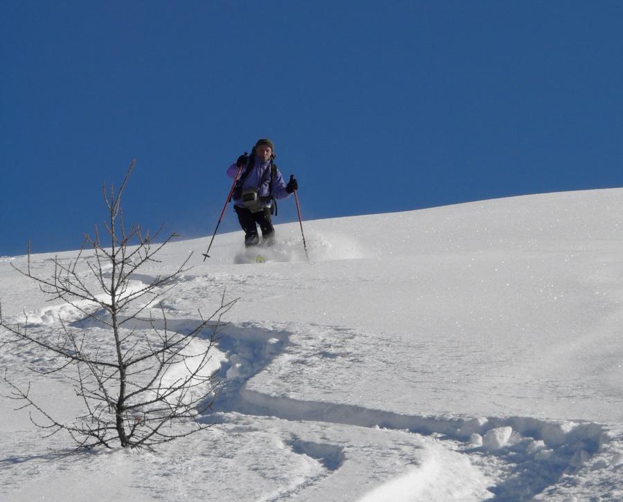 in discesa la neve è inizialmente un po’ lavorata dal vento, poi diventa farina compatta e infine polverosa. è scesa parecchia gente con sci tavole e ciaspole, ma c’è ancora un po’ di spazio per scendere su neve vergine.