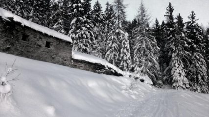 Sulla stradina iniziale, c’é pochissima neve con pietre e lastre di ghiaccio. Appena si arriva nel bosco, invece, spettacolo. Qualcuno é salito e sceso dalla punta con gli sci. Io e altri abbiamo preferito affrontare il tratto a piedi (senza ramponi). Talmente bella la discesa che, al limitar del bosco, ho ripellato. Tre biellesi incontrati lungo il percorso mi hanno regalato un po’ della loro allegria.