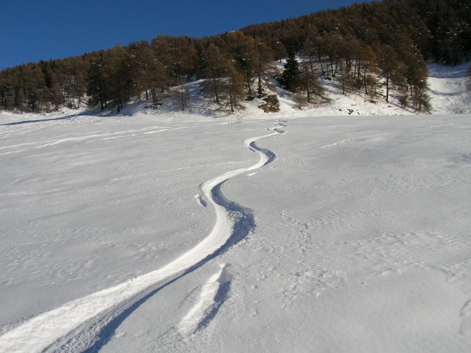 Gita di ripiego dal Torinese dove imperversava una bella bufera ovunque.Partito quindi tardi,10.45 sci ai piedi,-1° cielo sereno, sole caldissimo e assenza di vento tranne qualche leggera folata in cima.Si sale sci ai piedi dal parcheggio con qualche acrobazia ogni tanto.Pendii molto tritati dai numerosi passaggi ma cercando bene (e conoscendo) si trovano ancora spazi completamente vergini anke nel bosco.Neve ottima farina da cima a fondo anke se in rapida umidificazione (zoccolo da metà plateau in poi).Prima parte in cresta molto battuta e un po’ rognosa,poi nonostante le tracce (ancora morbide) sul plateau gran sciata,bosco fantastico e radura sottostante tralasciando le pendenze ampi spazi immacolati.La stradina è un campo minato,molte pietre appena coperte dalla neve.Sono sceso fino all’imbocco del sentiero con un po’ di maestria e qualche nuovo autografo sulle solette (da qui 15′ sci in mano.) ma consiglio appena si comincia a scendere dopo il tratto di risalita di togliere gli sci anke se invita a nn farlo. (30′ da qui).Oggi 6skialp e 2 racchettari.