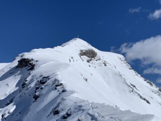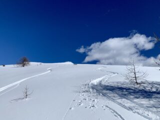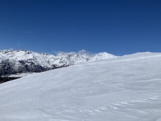 neve lungo la stradina a 10 minuti dall’auto, 20 cm in rapida liquefazione, ma oggi sufficienti a limitare lo spallaggio. Quota 1650 neve 50 cm, più o meno dove la strada si impenna verso le baite. salendo si raggiungono gli 80 cm nel bosco e 1 metro dopo la seconda radura e sui pendii sommatali. Neve appena più asciutta fuori dal bosco, ma in generale umida, profonda, lenta da sciare, ma non difficile. Innevamento abbondante in tutto il comprensorio e anche le cime all’orizzonte hanno un aspetto patagonico. Per esempio la parete EST dell’Emilius è interamente imbiancata.