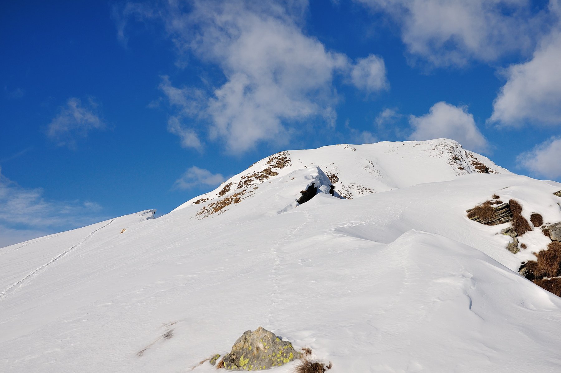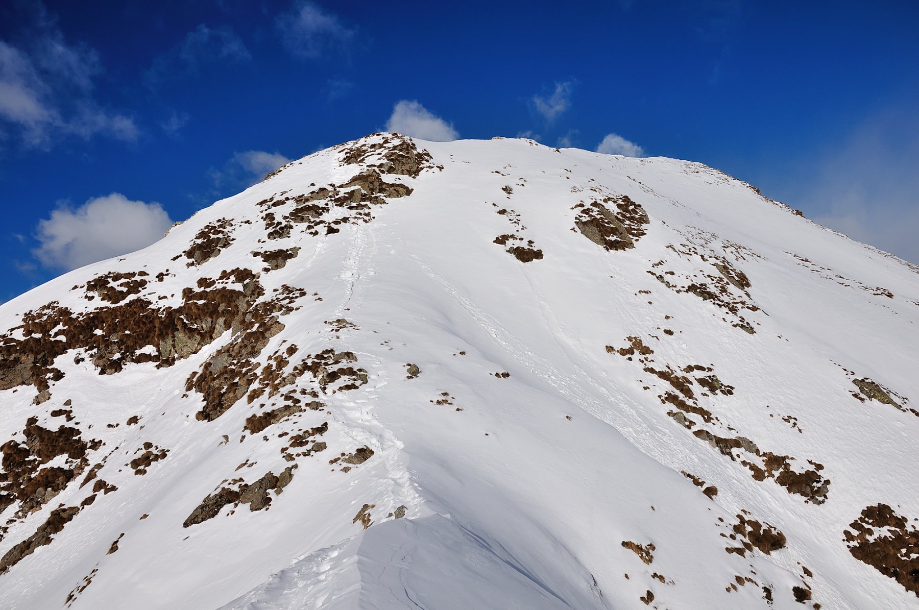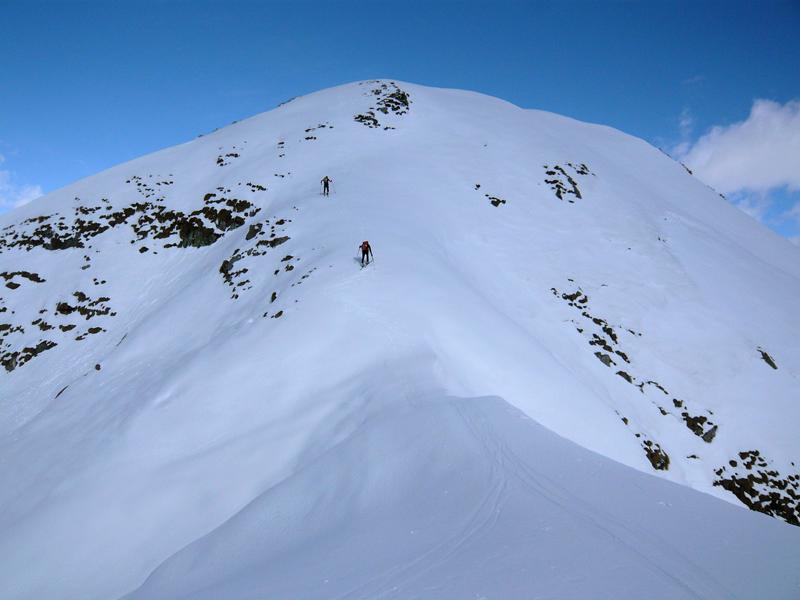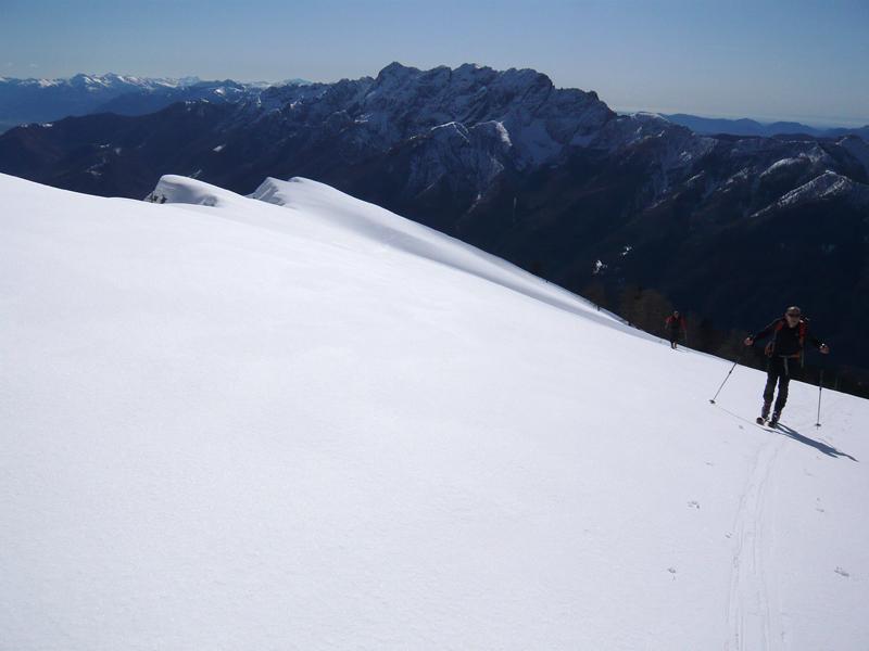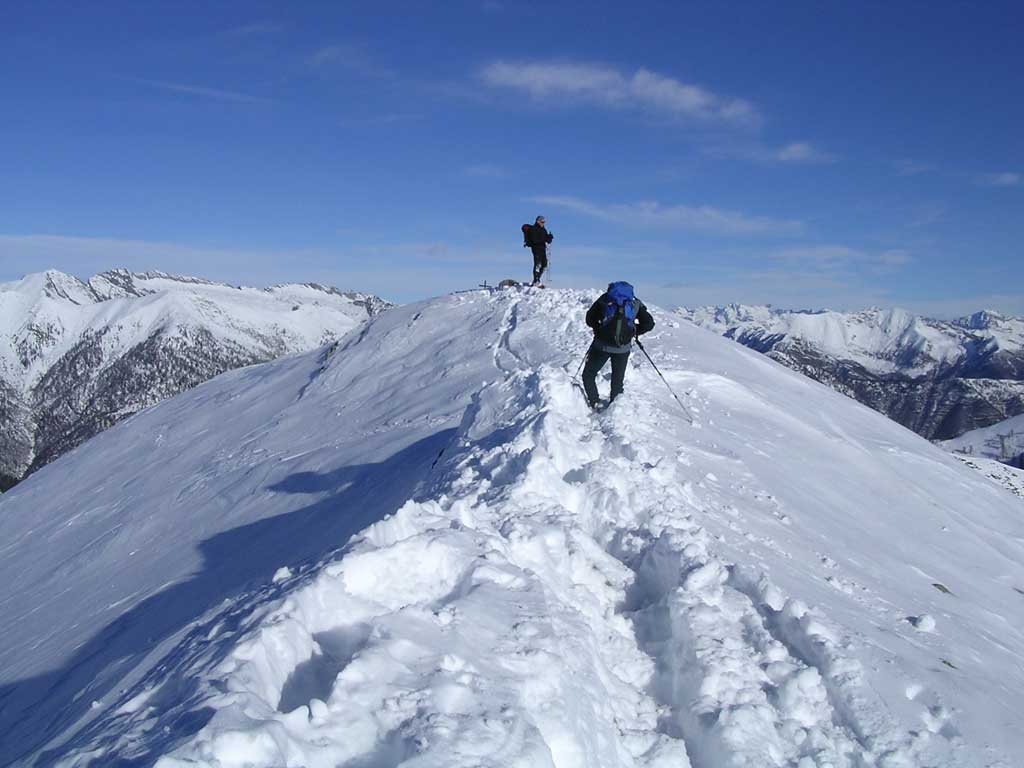 Dal parcheggio seguire la strada fino a dove si ritiene possibile salire sui prati a sinistra, da cui si raggiunge la chiesa del Blitz a 1270 m. A Monte della chiesa, in direzione Nord salire per i prati deviando poi a destra verso il gruppo di baite dell’Alpe Pragrande. Seguire se possibile le tracce del sentiero estivo che portano ad attraversare uno stretto ed incassato valloncello, passaggio che può comportare qualche difficoltà. Dopo un tratto ripido su prato e un altro attraversamento ci si alza verso l’Alpe Oro da cui in prossimità di una fontana si rientra nel bosco. Sempre seguendo, se visibile, il sentiero estivo ci si alza in direzione Nord-Nord-Ovest; spostarsi poi verso destra fino a raggiungere la dorsale che si affaccia sulla Valle degli Orti, comodo riferimento per il resto della salita. Senza sporgersi eccessivamente verso gli strapiombi del versante orientale raggiungere la cresta sommitale che con un lungo traverso a sinistra conduce alla sella sotto la cima. Gli ultimi metri si percorrono di solito senza sci; è necessario seguire il filo di cresta evitando i pendii laterali facilmente soggetti a scaricamenti. Per la discesa si consiglia di tenersi al centro degli ampi prati sotto la sella; al rientro nel bosco spostarsi poi verso sinistra per ritrovare la traccia di salita che si segue nel rientro.