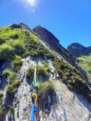 La sosta della calata dal Pizzo Altare è nuova, sufficiente corda da 30 m. Per scendere dal Pizzo di Mezzo bisogna disarrampicare un tratto di placche rocciose e cengette erbose, da fare con attenzione per il terreno delicato.