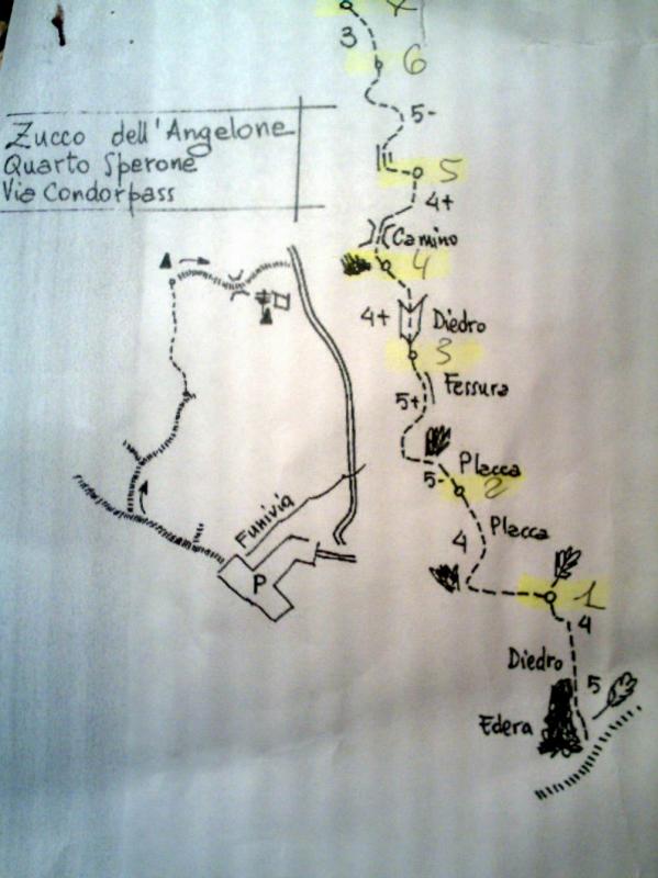 Seguire il sentiero e salire verso destra seguendo le indicazioni per il "Quarto Sperone". Salire per un centinaio di metri e proseguire ancora, lasciando sulla propria sinistra la rampa rocciosa con l'attacco della via Anabasi.