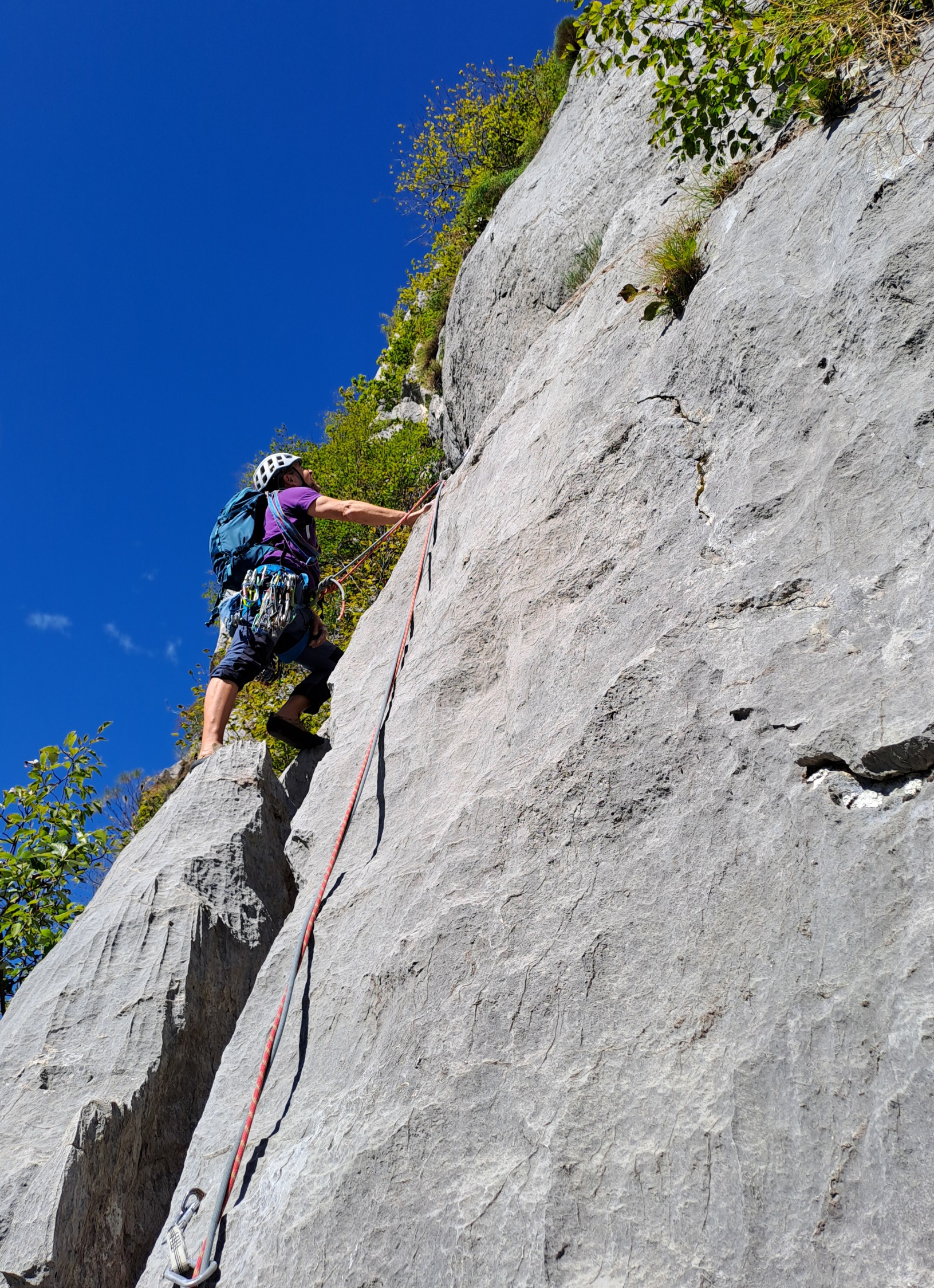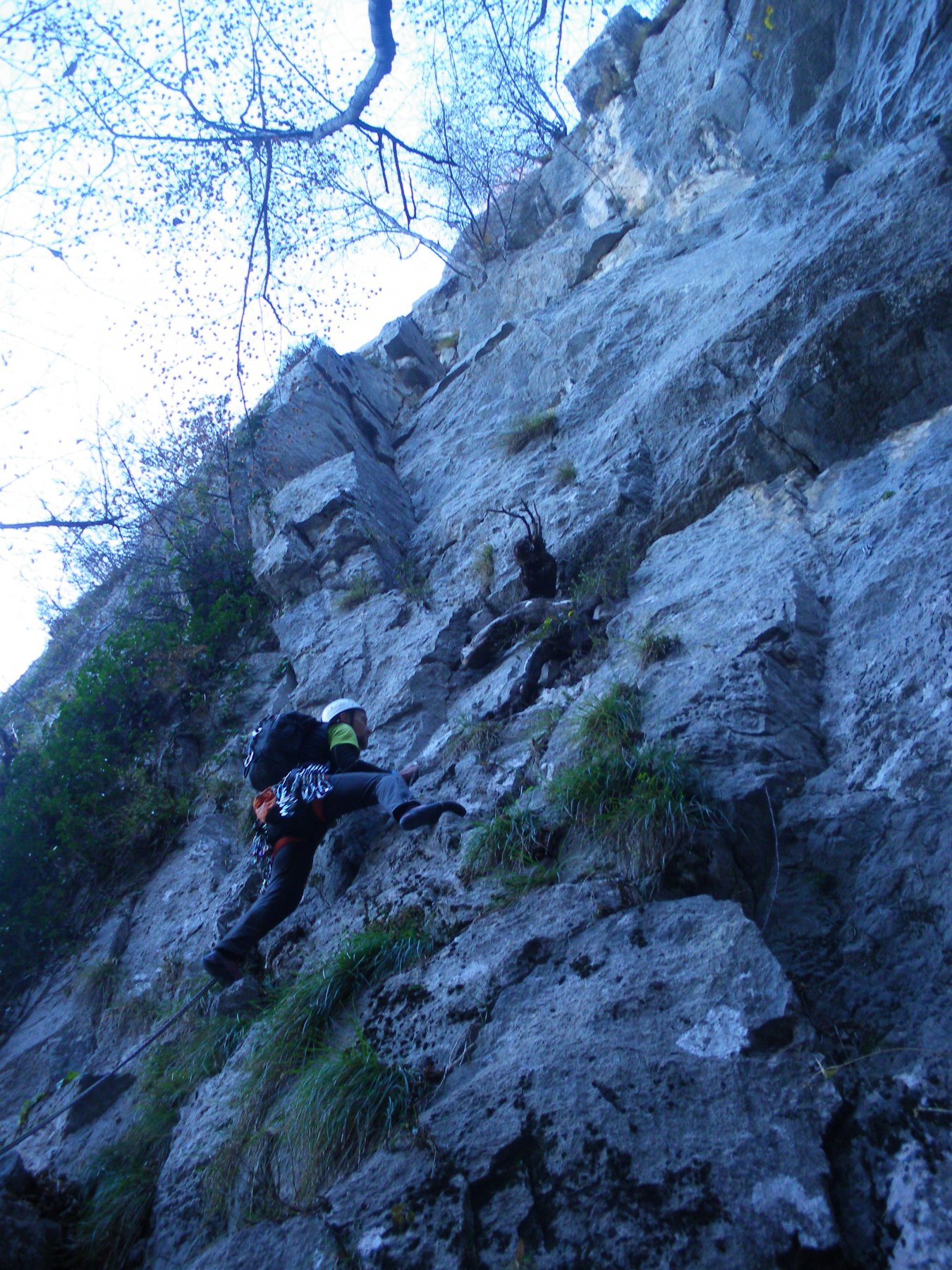 Arrivare quasi al termine del canale: la via attacca sul suo lato sinistro (viso a monte) poco dopo una folta edera, in corrispondenza di un netto diedro (piazzola alla base). (0h25)