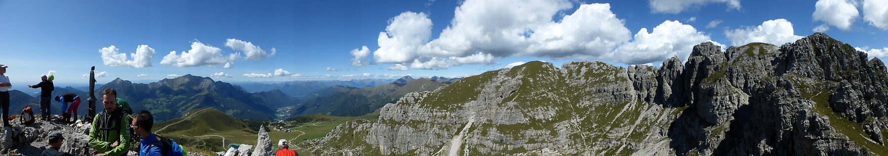 Dopo un primo tratto verticale si aggira il bastione verso destra e si scende ad una forcella dalla quale, superato un breve tratto erboso, si risale un diedro, spesso umido, sbarrato alla sua sommità da uno strapiombo che si aggira verso destra. Si sale per un canalino e con una bella spaccata si sbuca su una cresta erbosa alternata a brevi balze rocciose. giunti ad un diedro con sasso incastrato, si sale per uscire a destra con un breve traverso. Alla piazzola sovrastante il percorso si biforca: a sinistra si affronta un tratto molto impegnativo che supera una parete a tratti strapiombante; a destra, il percorso meno impegnativo, sale per una rampa, passa sotto un bellissimo arco naturale di roccia e supera con l’aiuto di una scala metallica il salto finale ricollegandosi al percorso originario. Si supera il tratto suggestivo detto delle “Torri”, si affronta un breve muro ed una facile rampa che raggiungono una piccola cengia da aggirare verso sinistra. Ci si trova ora ad affrontare un bellissimo e lungo diedro che porta deviando leggermente a destra su un ballatoio, si supera il sovrastante muro verticale, poi con minor pendenza, si prosegue per il pendio erboso che porta direttamente alla vetta sormontata da una Madonnina di bronzo.