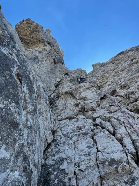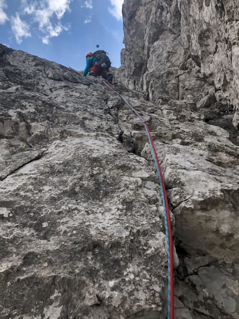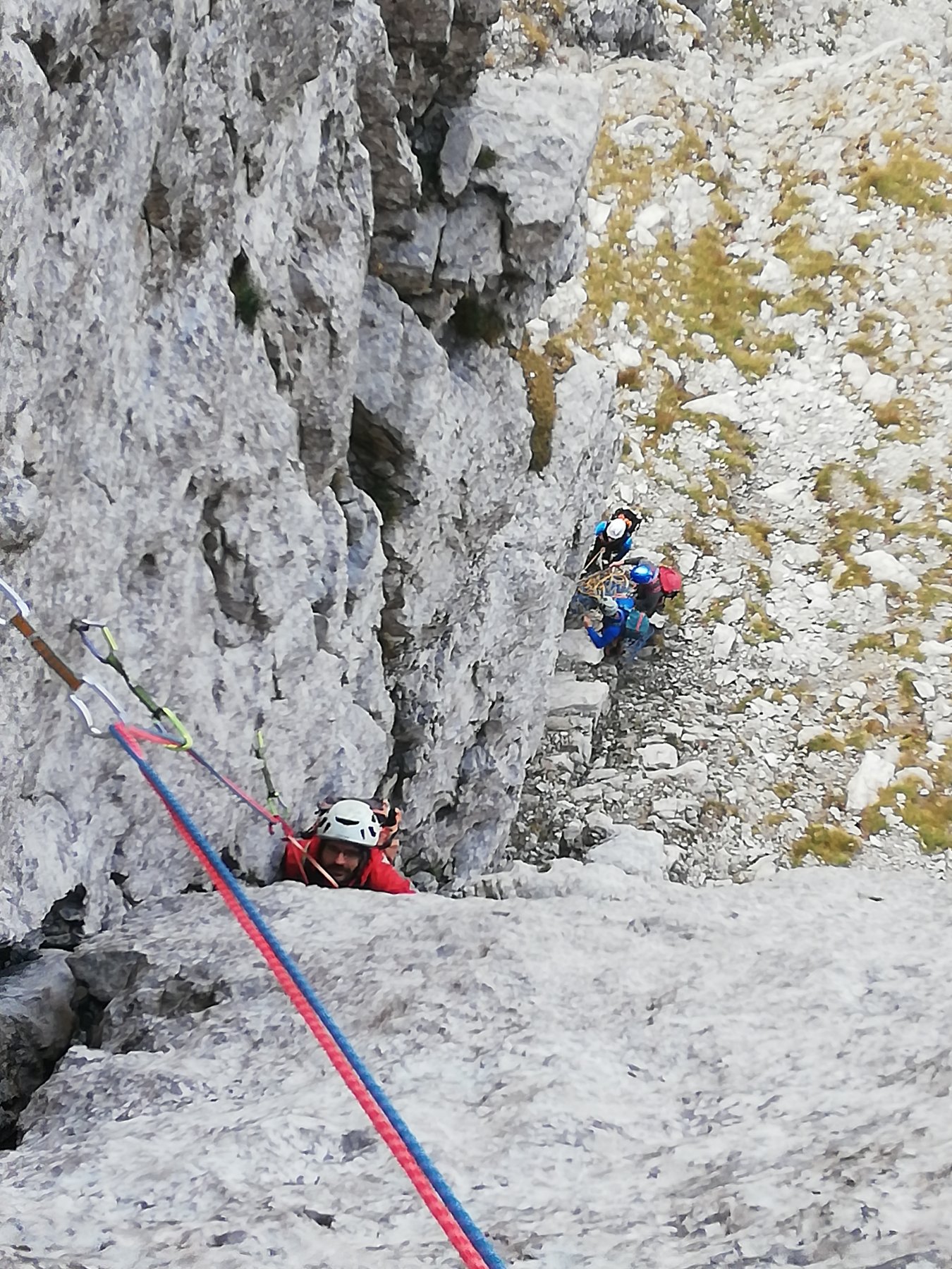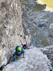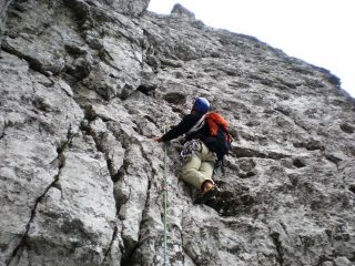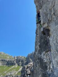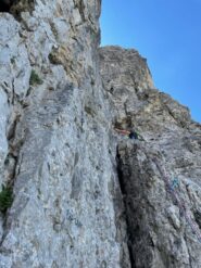 6° tiro: parete verticale sul lato destro del diedro 30 Mt., IV+, un passo obbligato di V (ben protetto)