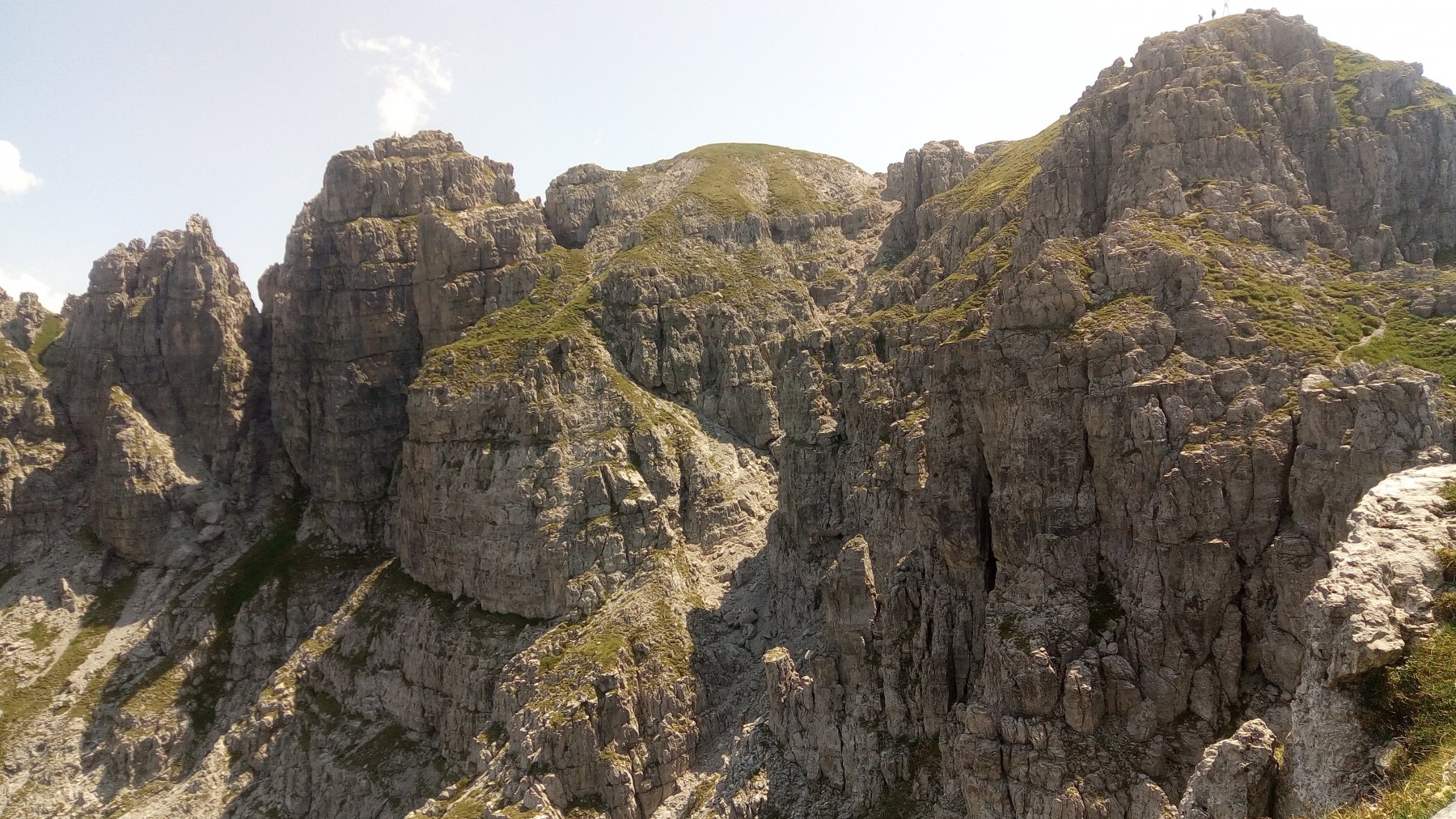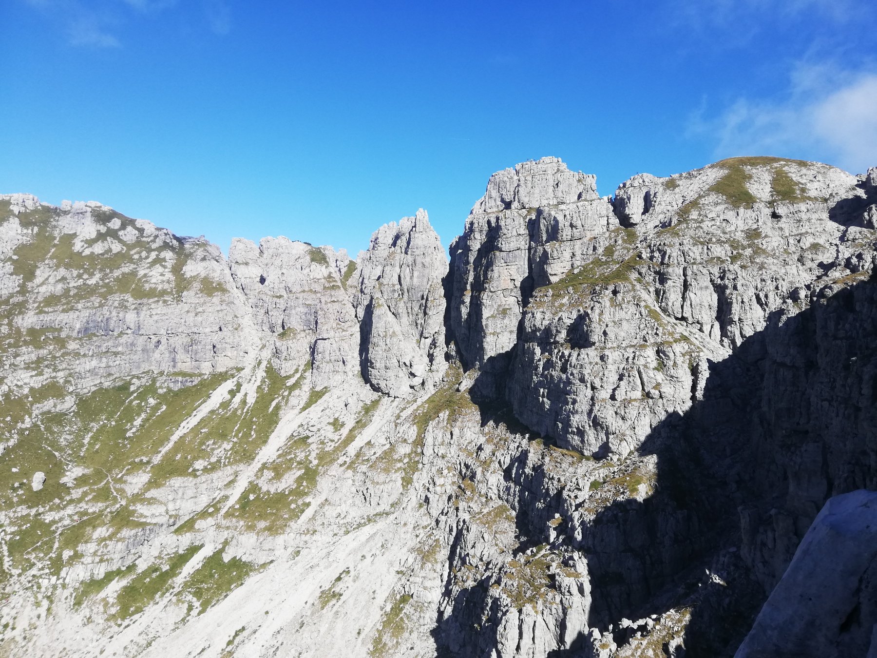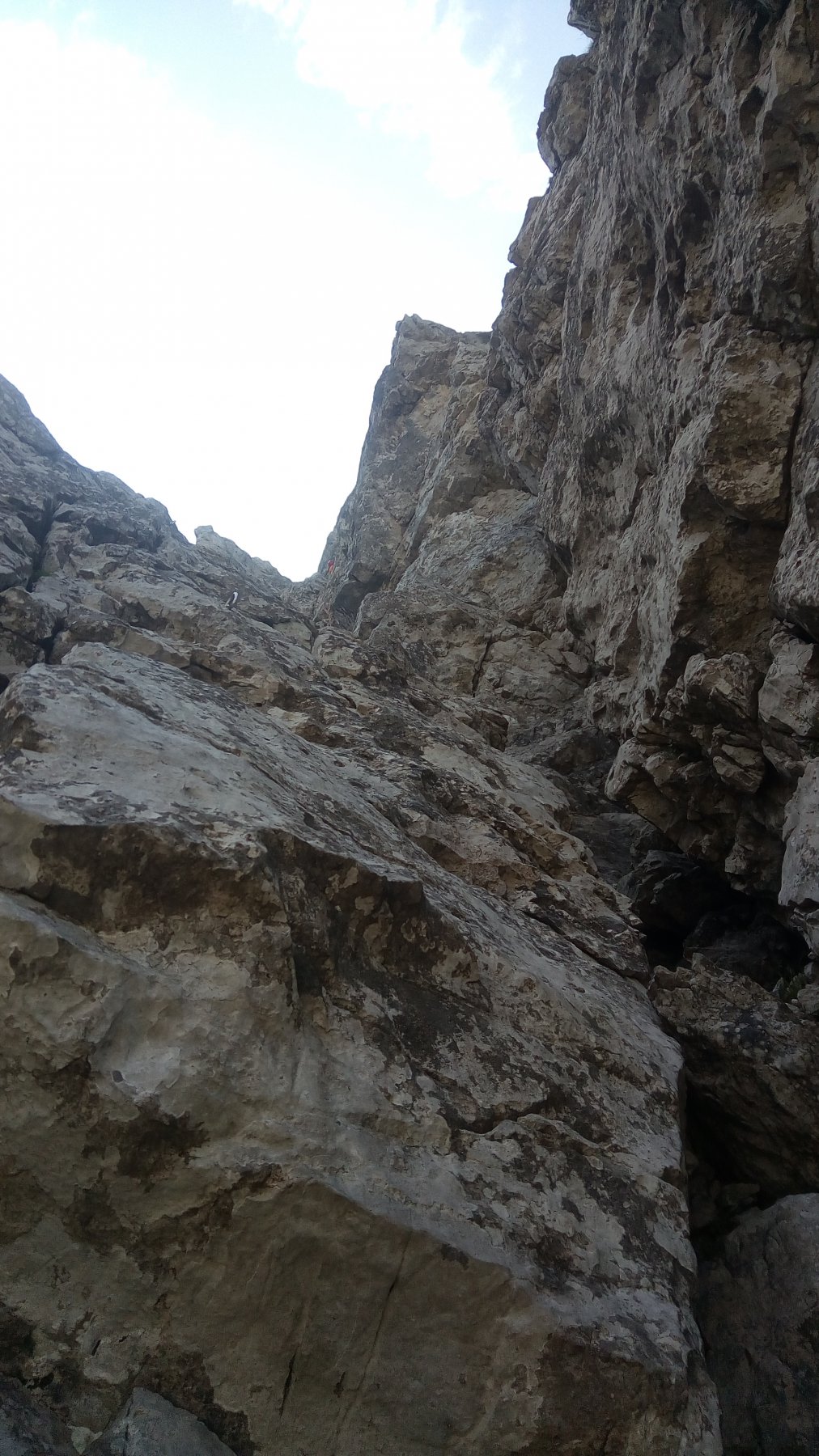 2° tiro: salire il diedro a sinistra della sosta con il passaggio più duro della via (ben spittato, stile falesia), proseguendo poi su roccette più facili. 35 Mt., V+/VI il diedro, III+ parte successiva