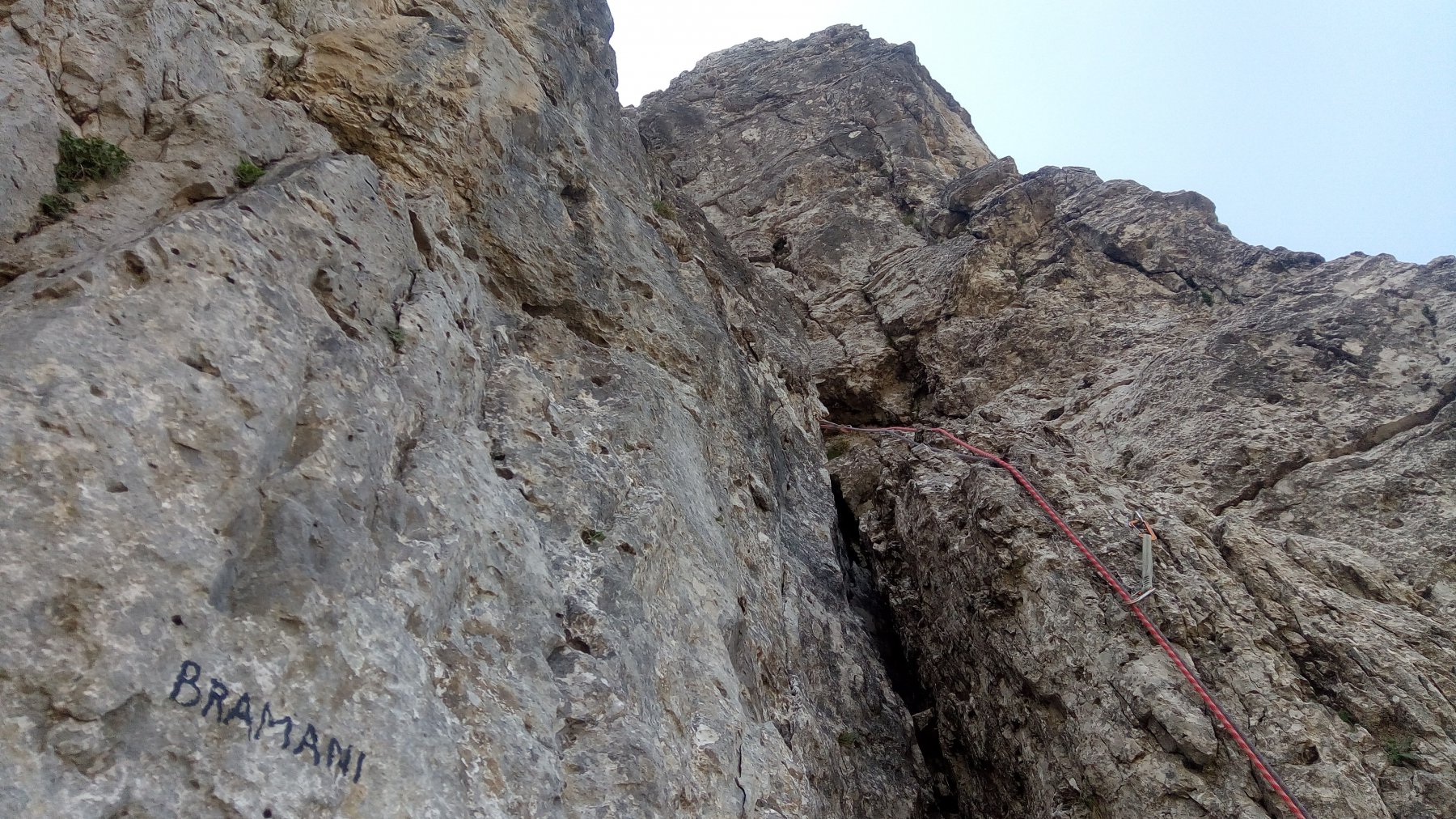 Di seguito descriviamo la variante delle guide fino alla cengia, e il diedro bramani dalla cengia alla cima.