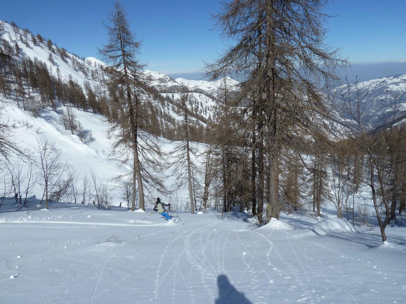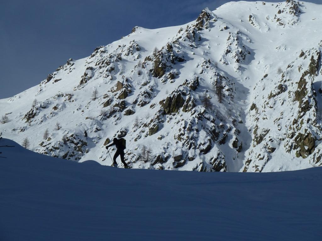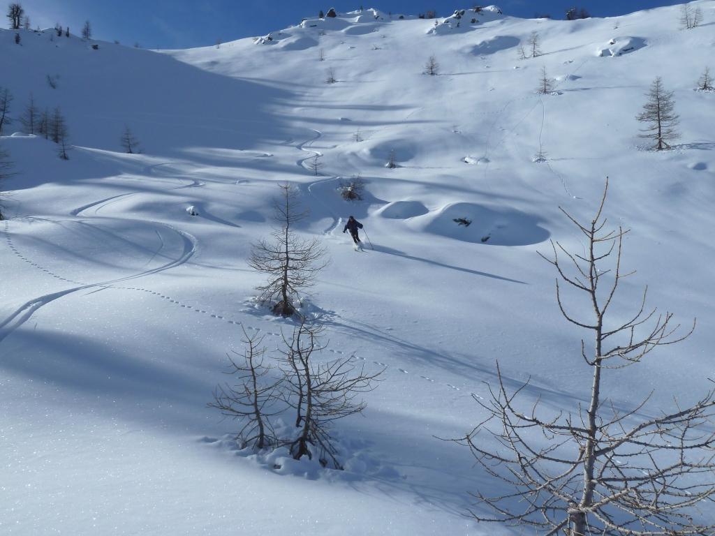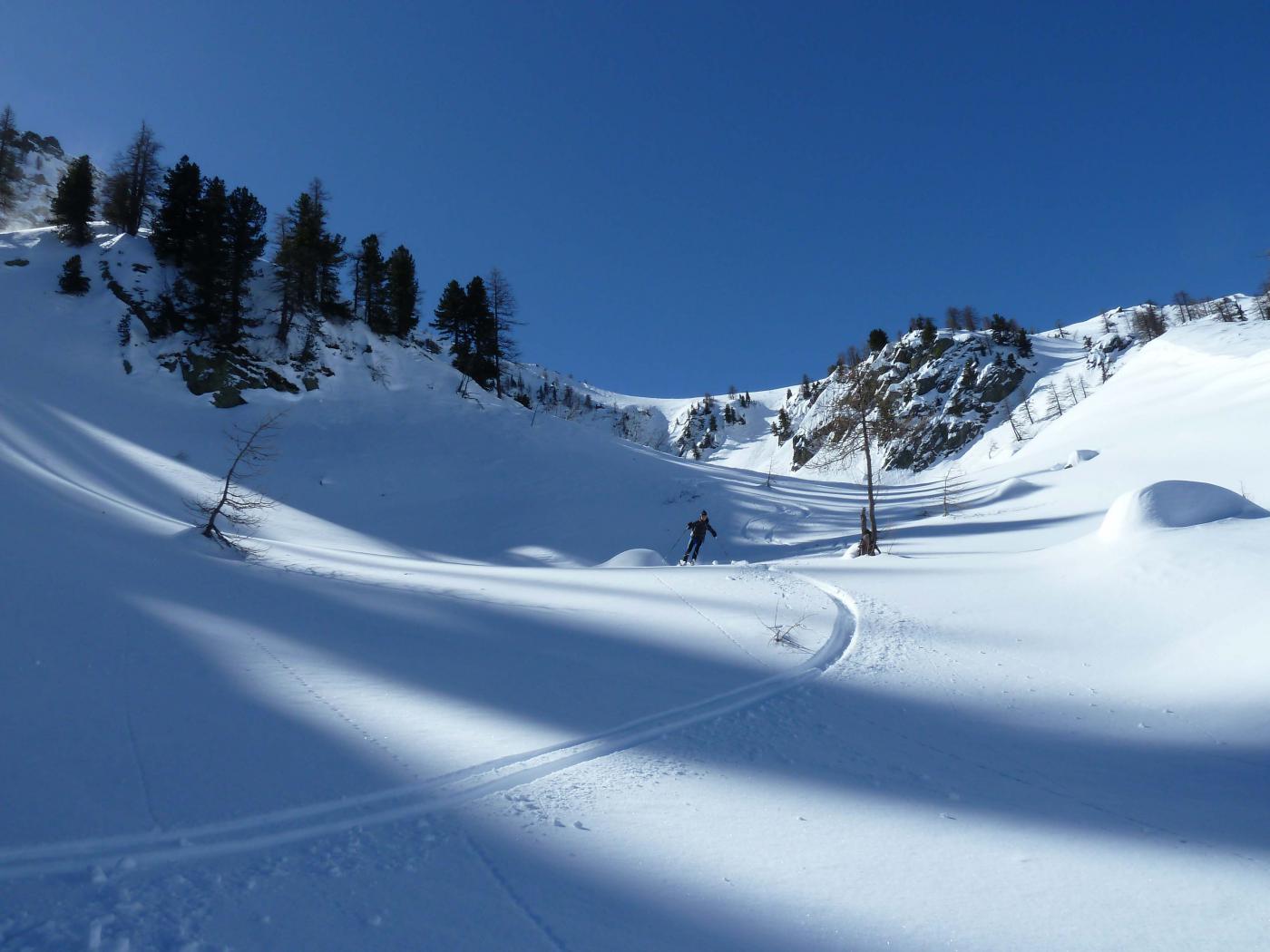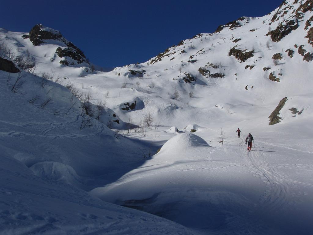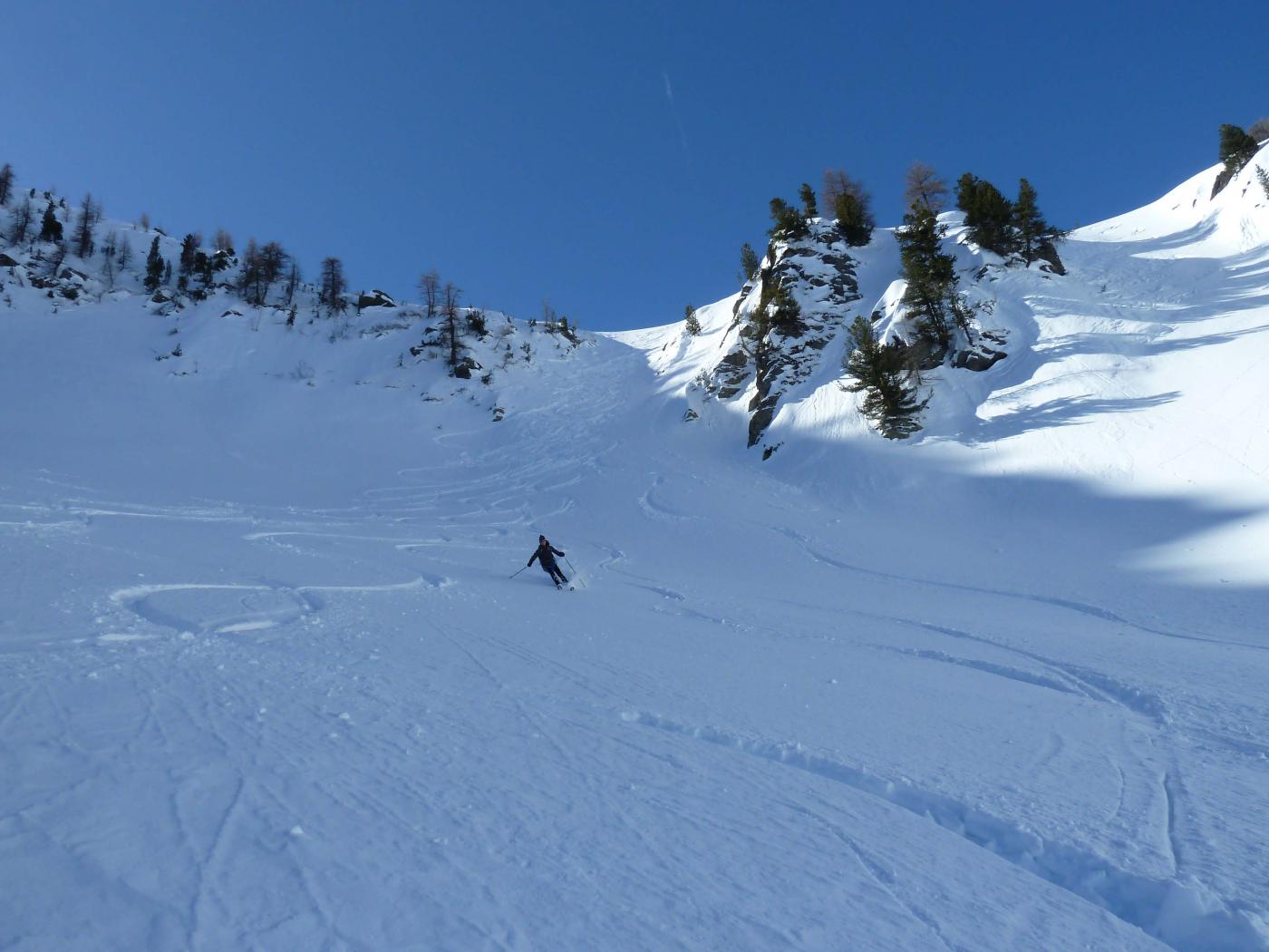 Dalla punta si seguono gli aperti pendii della dorsale NO. Per portarsi nel fondo del vallone si può prendere un ripido canalino sulla destra (BS) oppure seguire la dorsale fin verso 1950m ed immettersi nello stesso su terreno più facile.