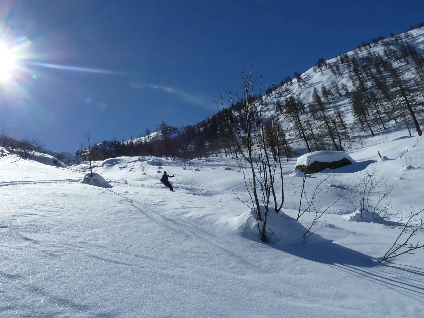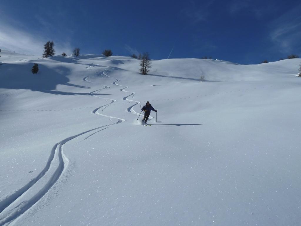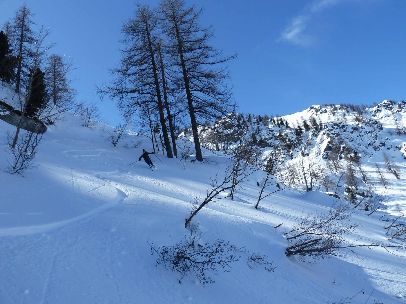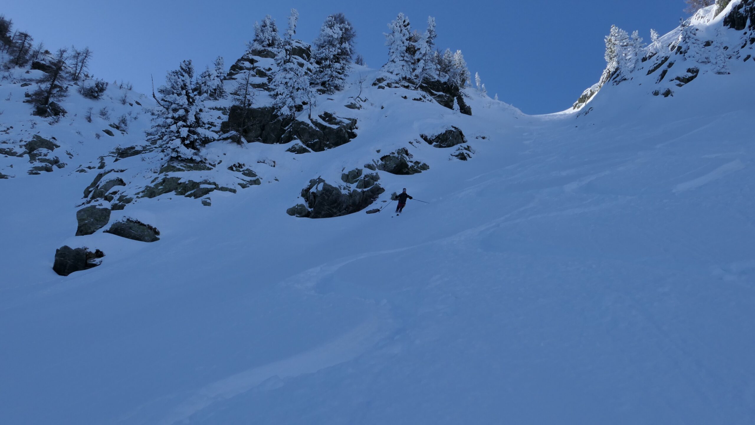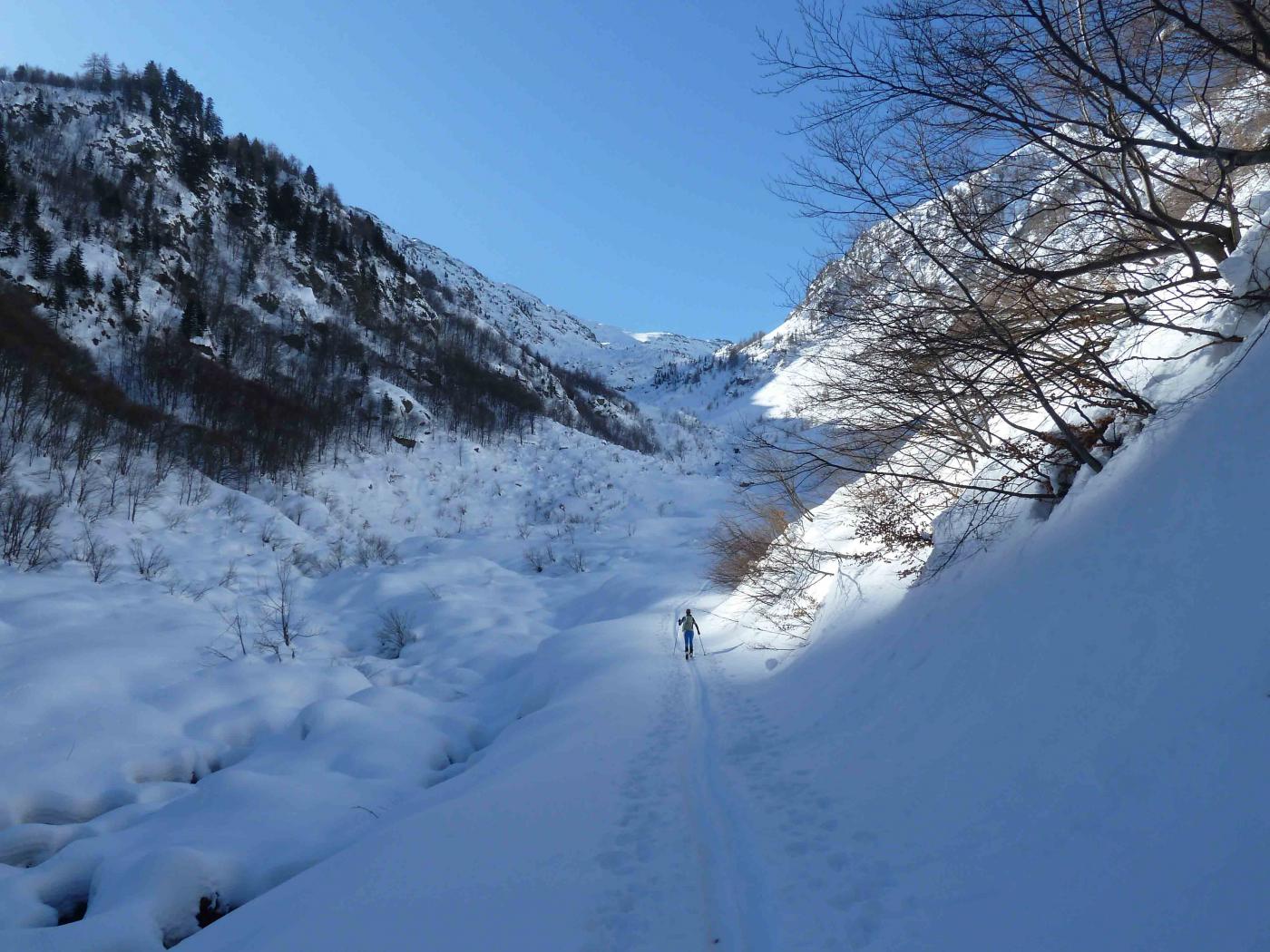 Dalla punta si seguono gli aperti pendii della dorsale NO. Per portarsi nel fondo del vallone si può prendere un ripido canalino sulla destra (BS) oppure seguire la dorsale fin verso 1950m ed immettersi nello stesso su terreno più facile.