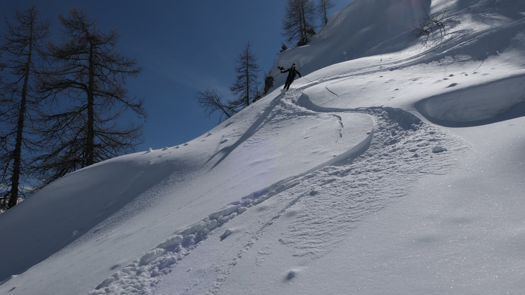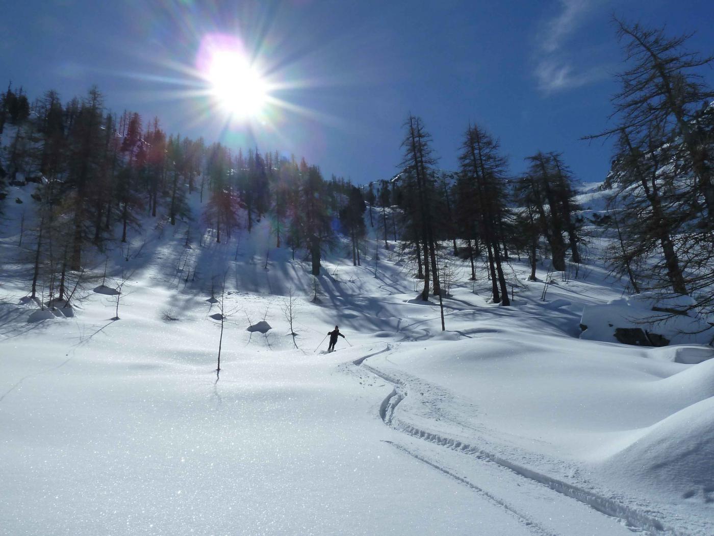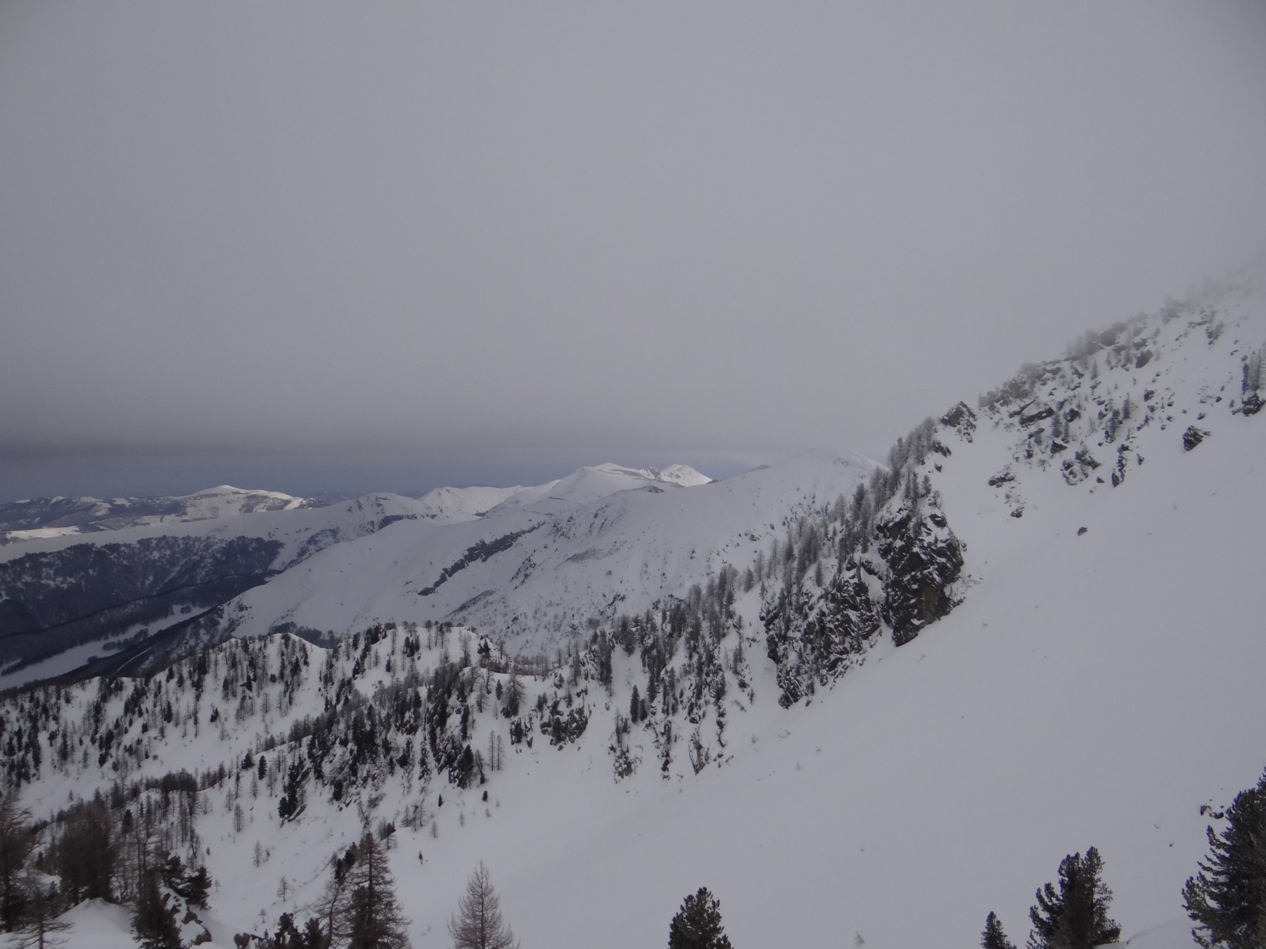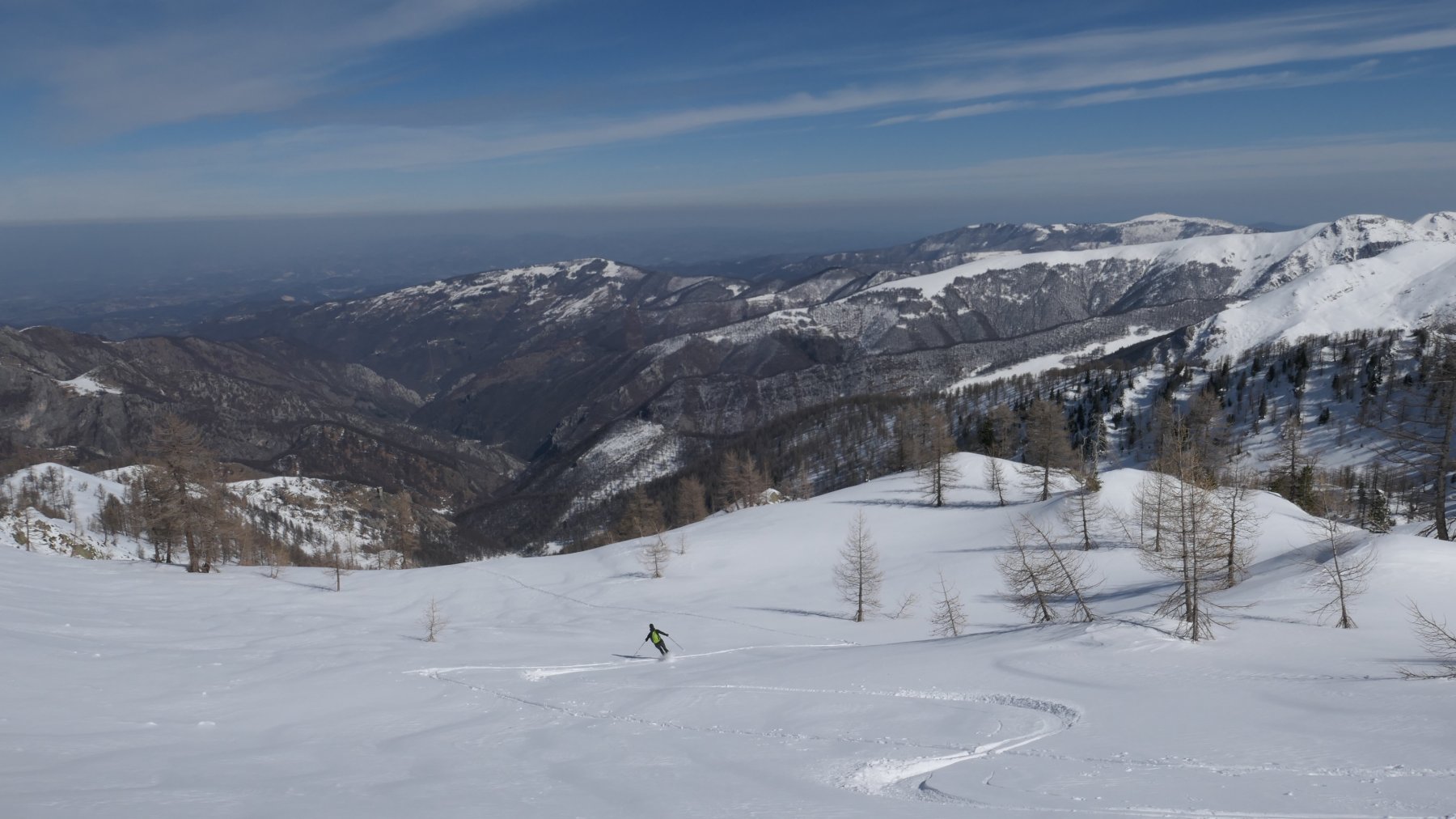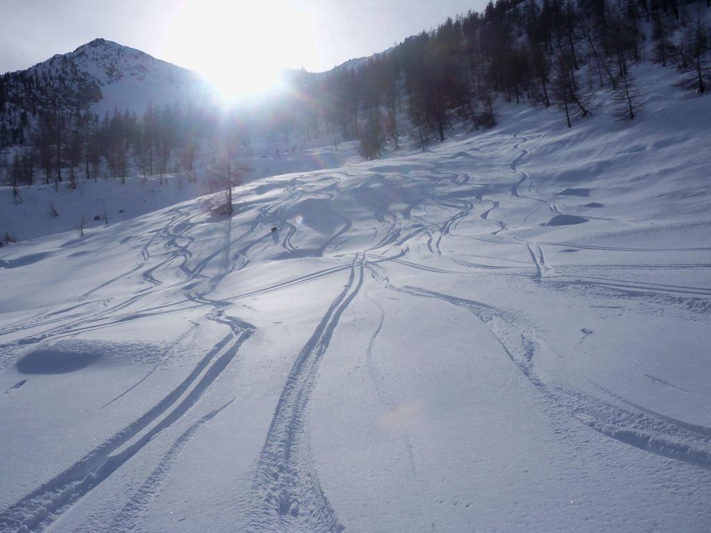 Dalla punta si seguono gli aperti pendii della dorsale NO. Per portarsi nel fondo del vallone si può prendere un ripido canalino sulla destra (BS) oppure seguire la dorsale fin verso 1950m ed immettersi nello stesso su terreno più facile.