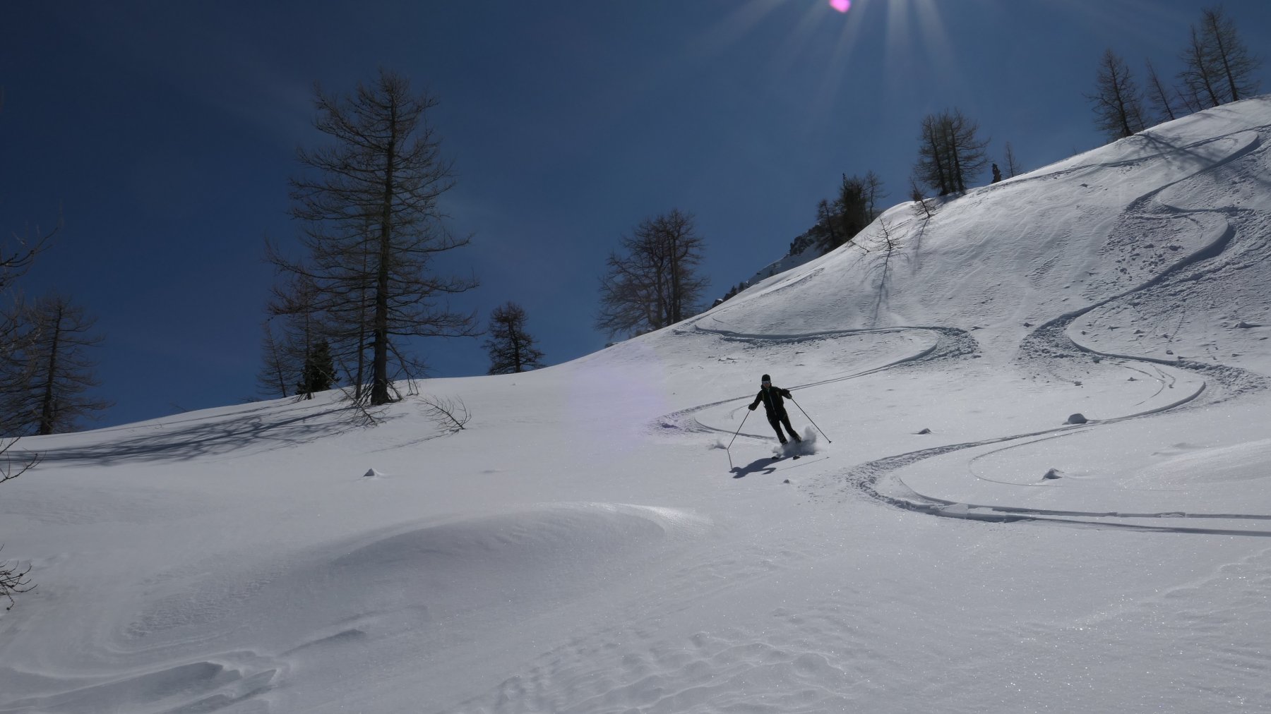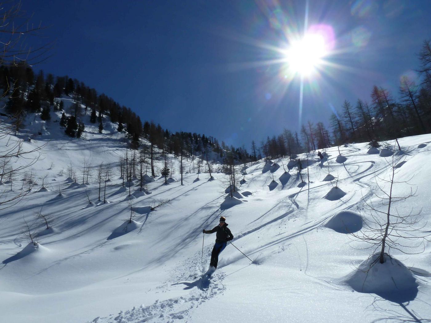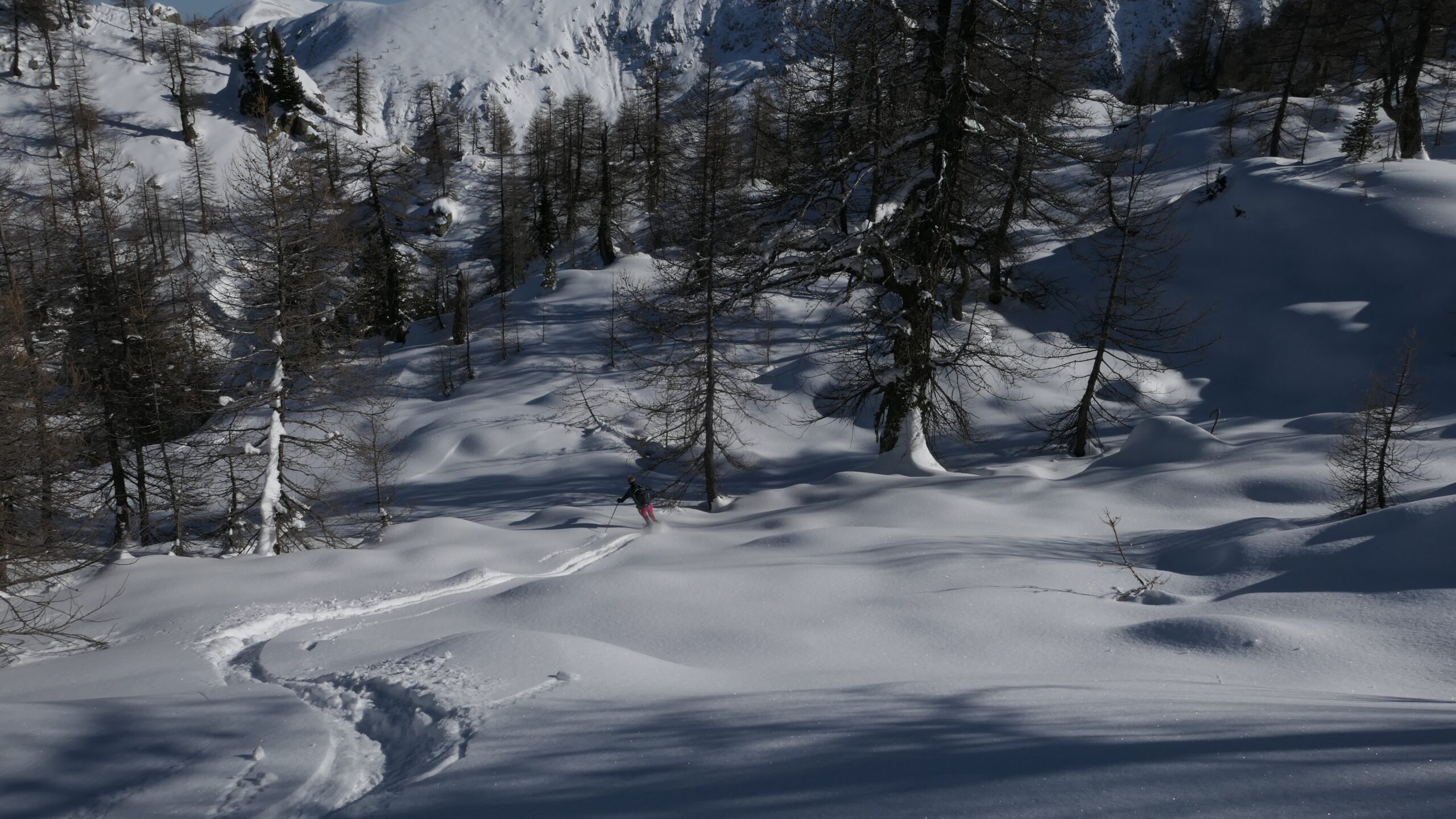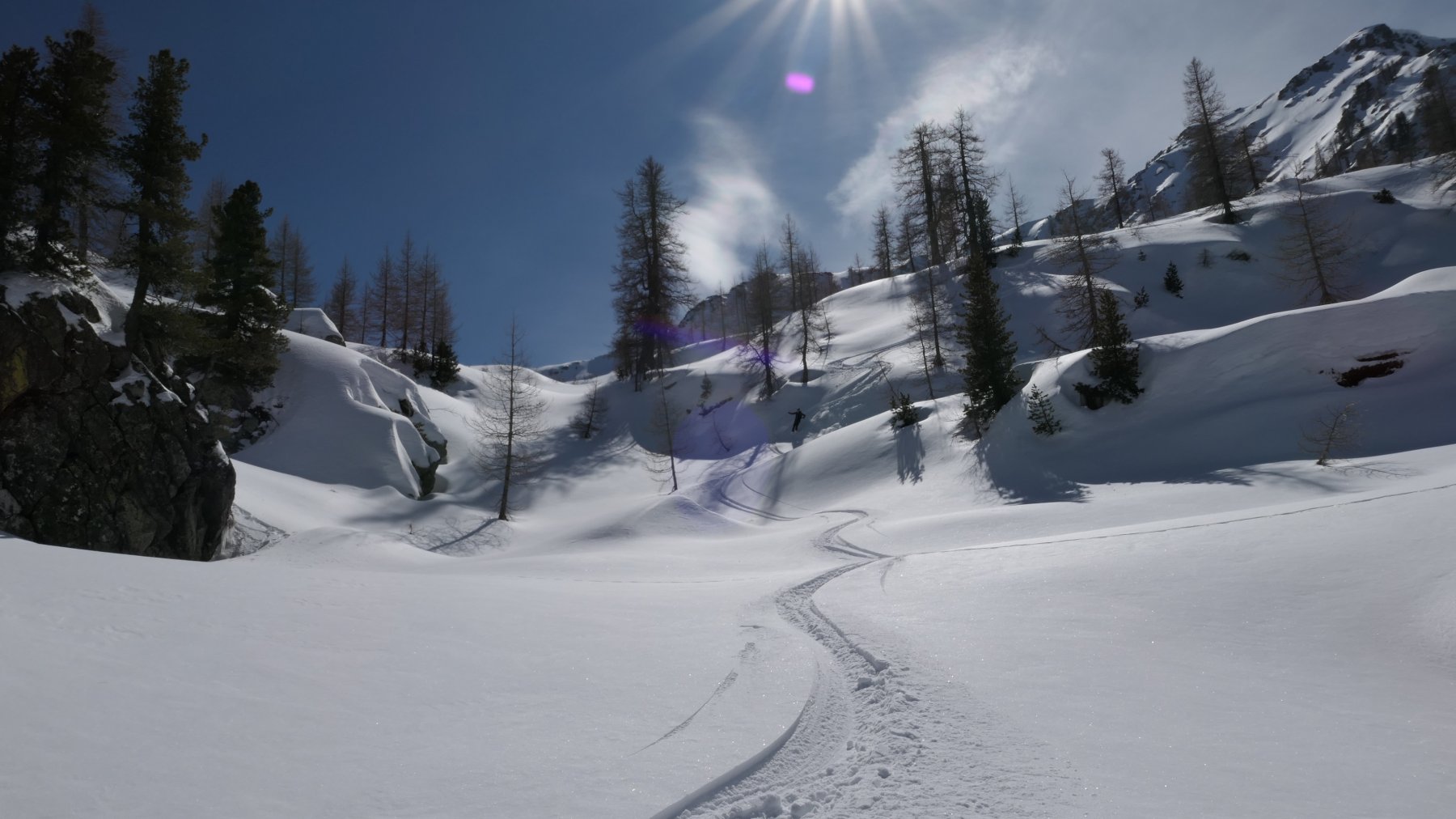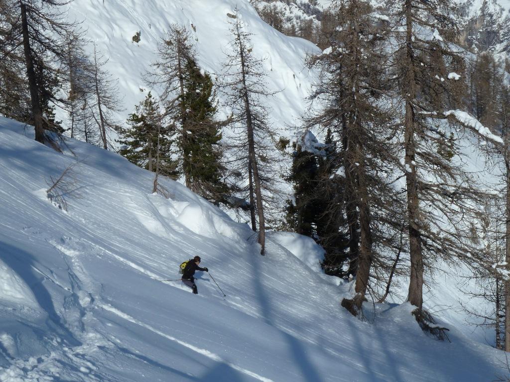 Dalla punta si seguono gli aperti pendii della dorsale NO. Per portarsi nel fondo del vallone si può prendere un ripido canalino sulla destra (BS) oppure seguire la dorsale fin verso 1950m ed immettersi nello stesso su terreno più facile.
