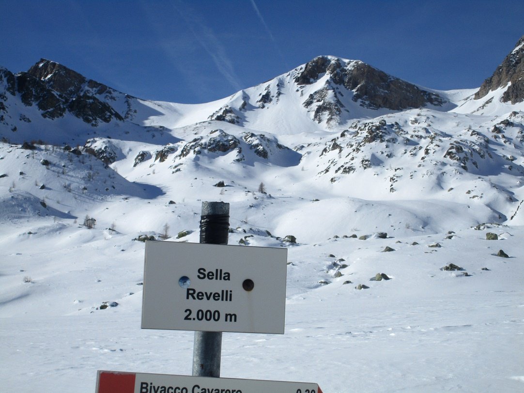 Si piega a destra passando fra quest’ultima e la modesta gorgia in cui scorre il Rio di Revelli che si attraversa ad un ripiano a ~1810m. Si prosegue su bellissimo terreno ondulato e si costeggia sulla destra il grosso panettone della Rocca della Sella che chiude ad est la conca Revelli dove si trova il Gias omonimo ~2030m. Piegando a destra si arriva presso un’ampia rigola che si segue fino al Biv.Cavarero 2180m ubicato sul promontorio che nella parte alta lo divide in due. (Disl. 430m – 1h 15’ – 4h).