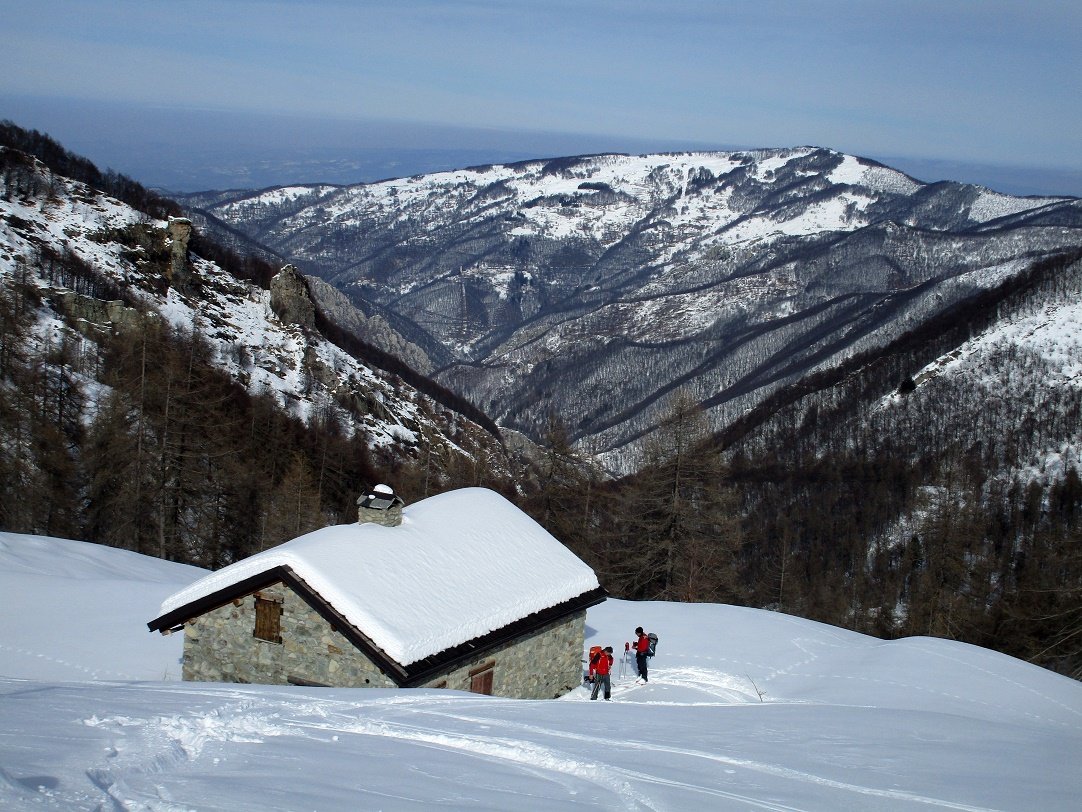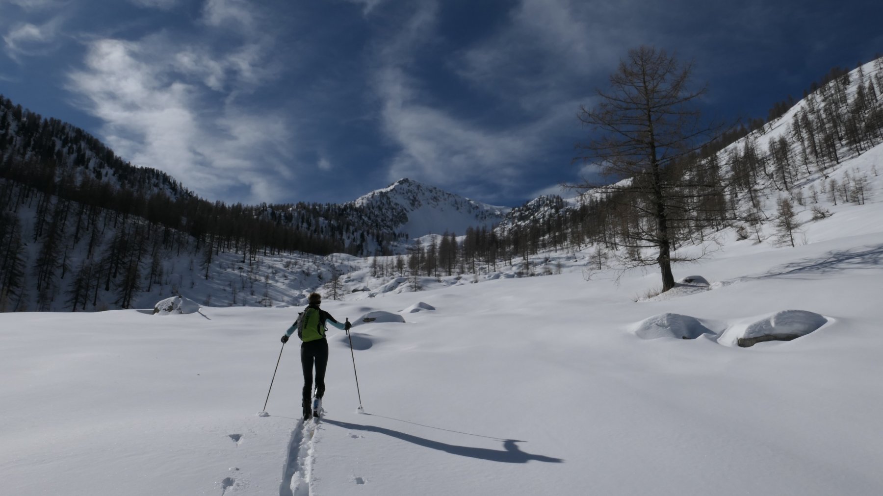 Si prosegue per la sterrata, ora più ripida, sempre sulla sinistra or. del Corsaglia, raggiungendo il Gias della Traversa 1375 dove su un ponticello si attraversa il Torrente. Si percorrono gli ampi pendii fino ad un falsopiano ~1750m dominato da una barra rocciosa (Disl. 700m – 1h 45’ – 2h 45’).