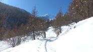 Si segue la diramazione principale che, oltre lo sbocco del rio dello Zucco, passa nei pressi della Stalla Rossa 1059m. (Disl. 189m – 1h).
