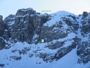 Fuori dalla grotta tenere assolutamente il bordo sinistro del canale nevoso soprastante, con possibilità di attrezzare una seconda sosta sia sulla parete di sinistra (roccia migliore, eventualmente anche ghiaccio) sia sulle rocce affioranti nel centro.