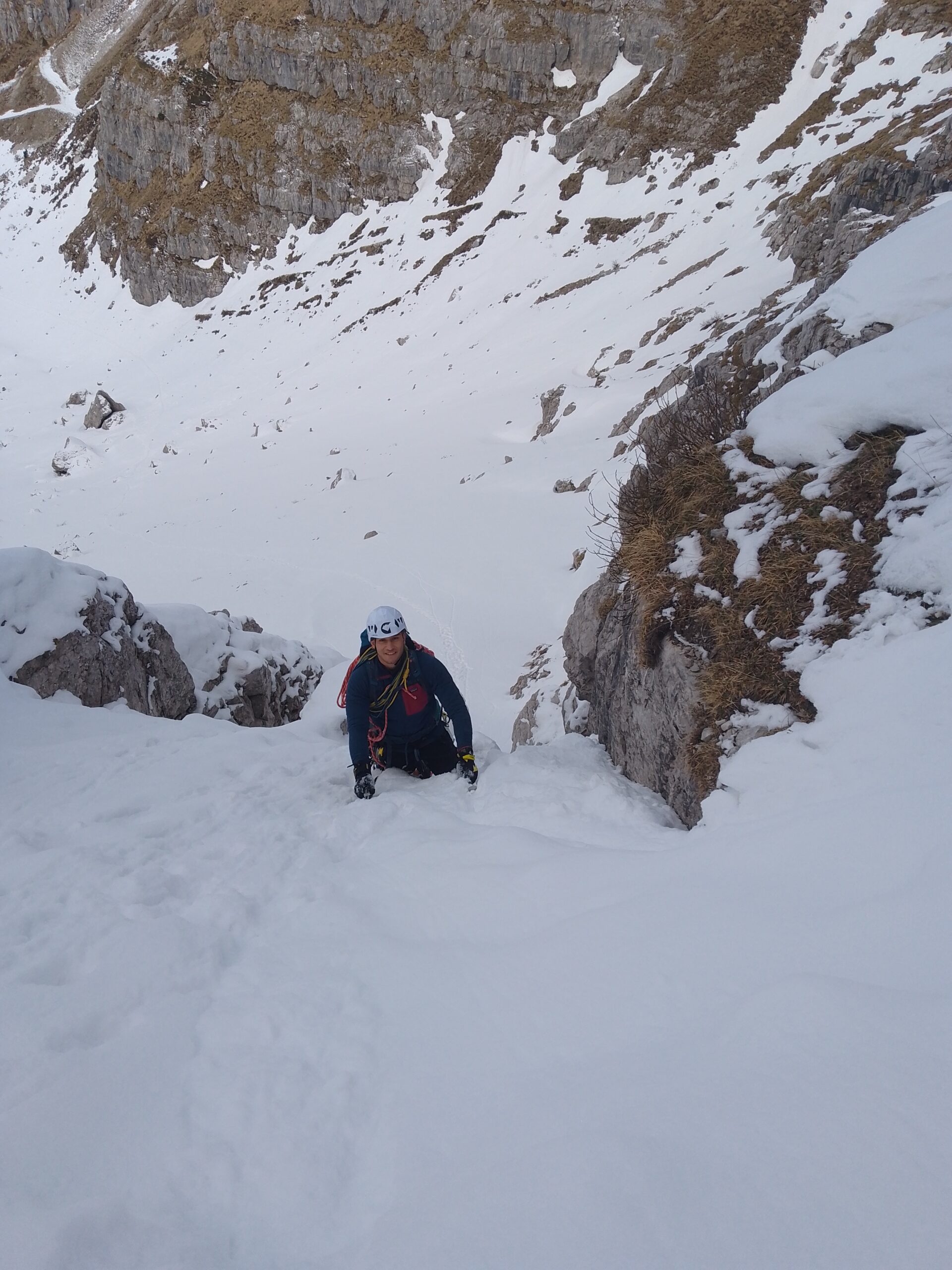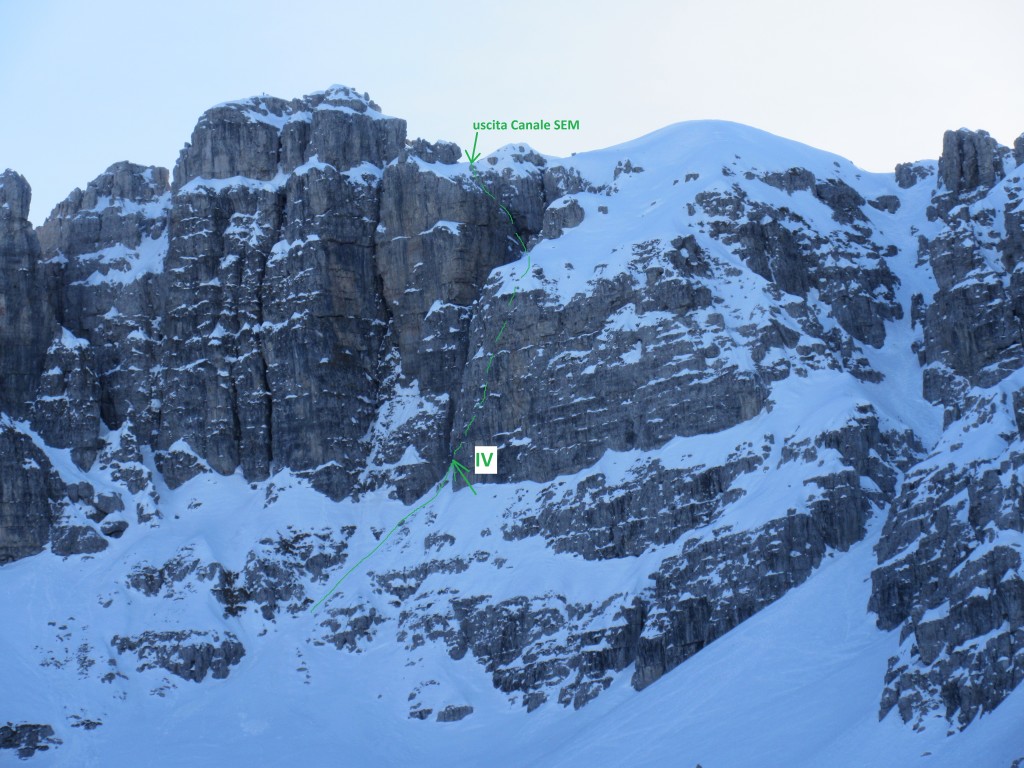 Il canale presenta uno sviluppo ridotto (ca. 170m dalle rocce di partenza), tuttavia non banale nel tratto iniziale: i grandi massi incastrati poco sopra l’ingresso sono di rado coperti da neve compatta o ghiaccio e la terrazza soprastante è formata da roccia pessima. L’attacco è IV (1ch. + 1 resinato a dx in uscita al primo risalto) è consigliabile fare sosta nella grotta poco sopra perchè al riparo da eventuale caduta di sassi o ghiaccio (2 ch. vecchi sul lato destro della grotta oppure sosta da attrezzare sul lato sx).