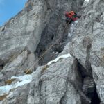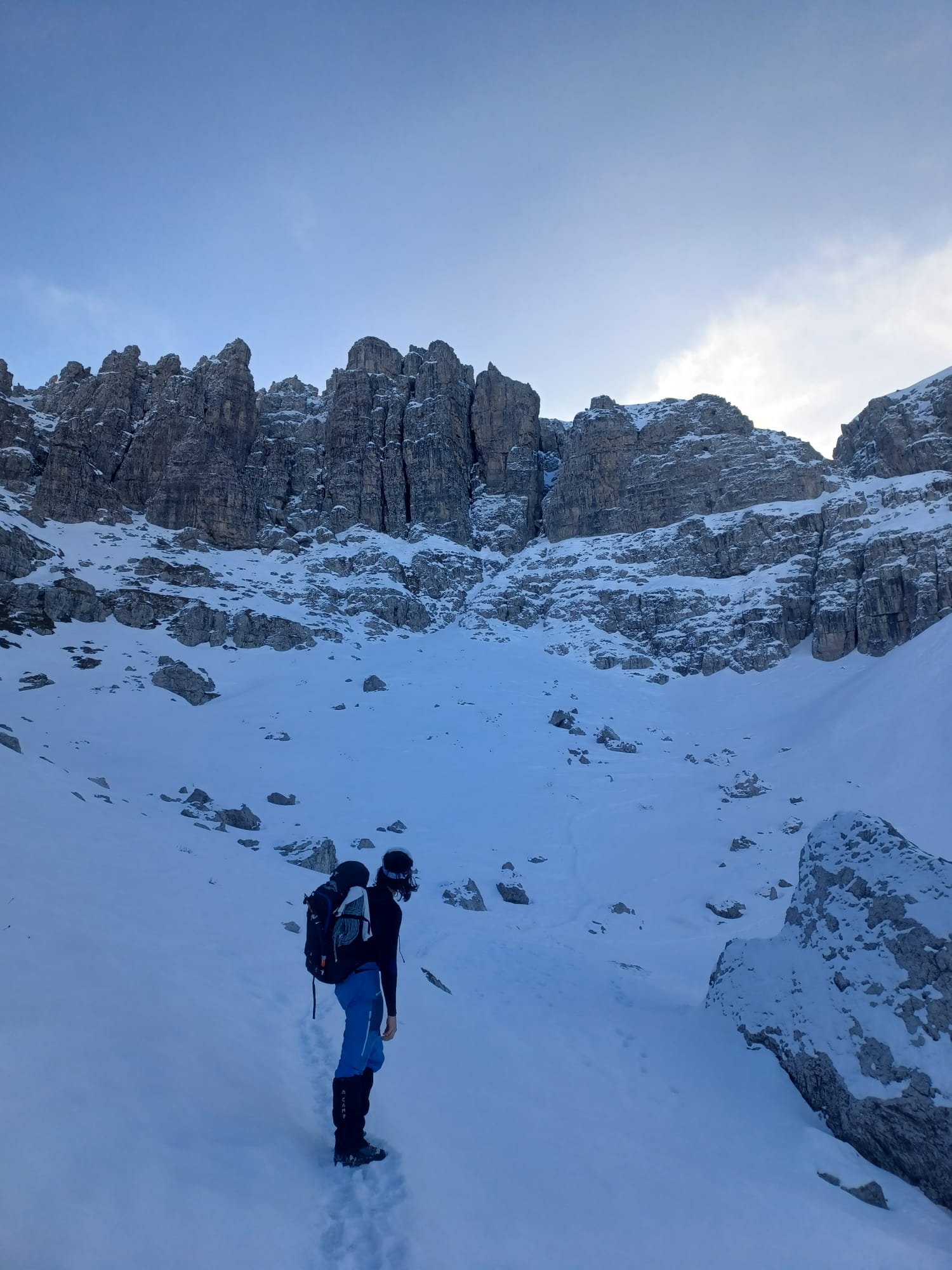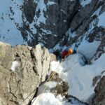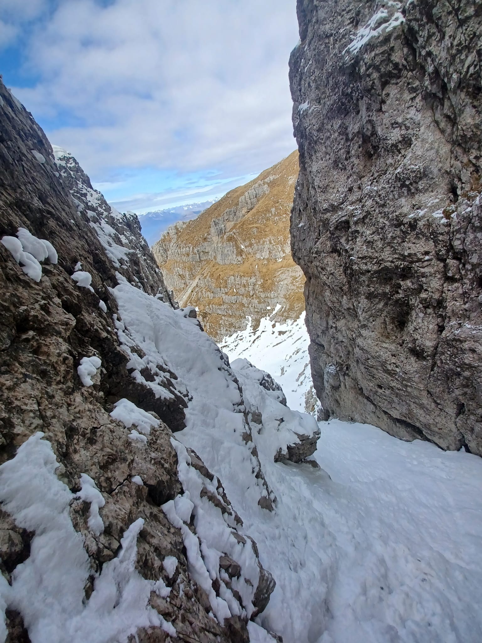 Da qui in poi la salita diventa più semplice, piegando decisamente nel canalino verso sinistra su neve fino all’intaglio di uscita.