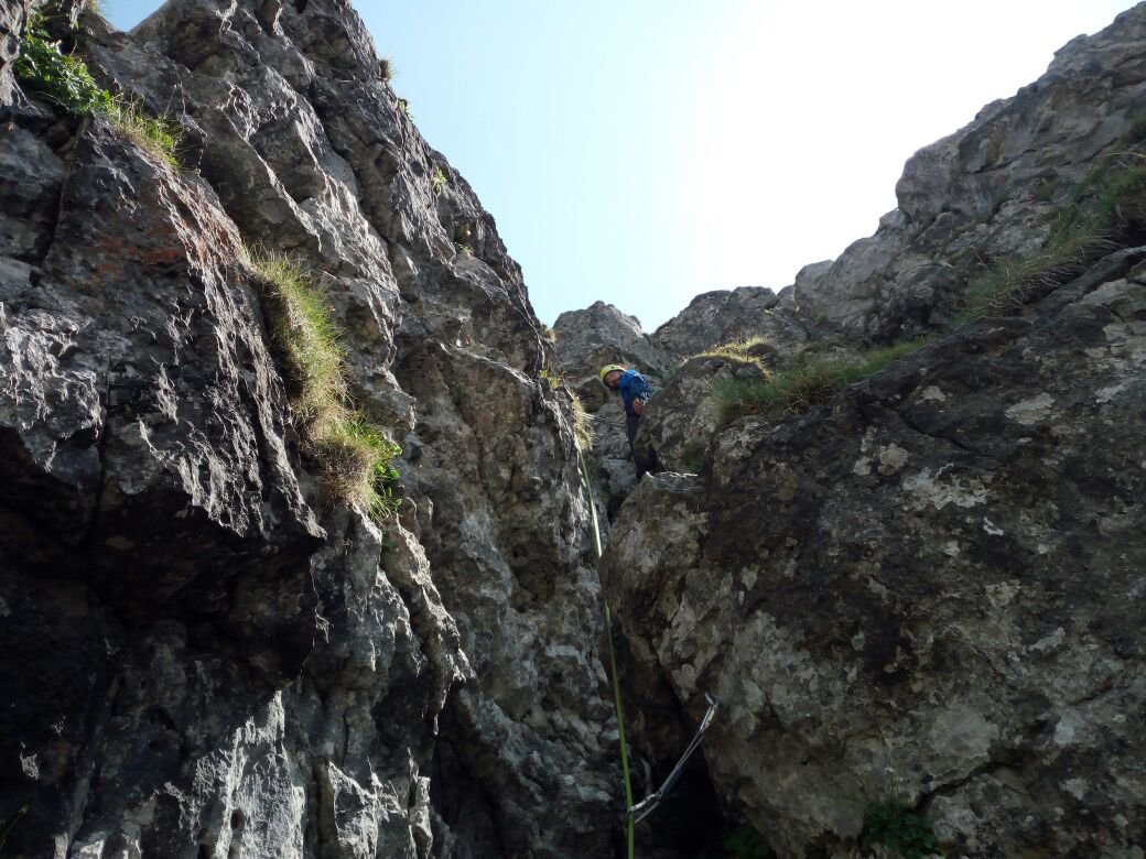 - L2 – IV, 15m. seguire la fessura, poi per rampette fino alla sosta su comodo terrazzo detritico.